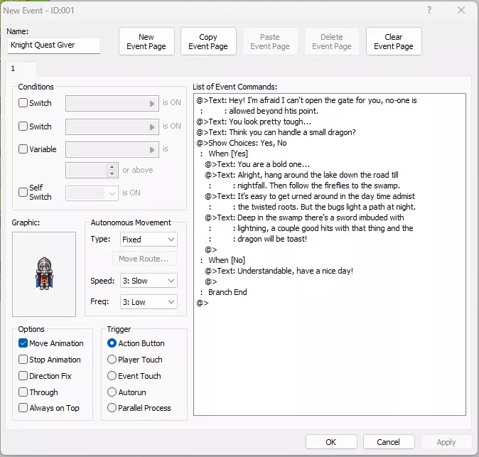 我在堡垒外添加了两个火盆。看看你是否还记得我们在夜间地图上是如何点燃营火的,额外挑战是给火盆添加火焰。 好的,我们来给这座城堡外面添加一个骑士站岗。创建一个事件,然后选择合适的骑士图像。将该事件命名为【骑士任务发布者】,动画、触发条件和移动选项保持默认设置。 处理完这些后,就该添加简短对话以及接受或拒绝任务的选项了。在事件编辑器中添加【显示文本】命令来设置对话内容,并添加【显示选择项】命令来实现接受或拒绝任务的功能。