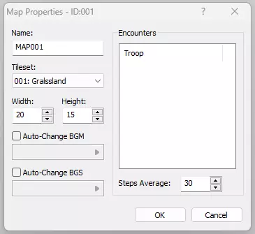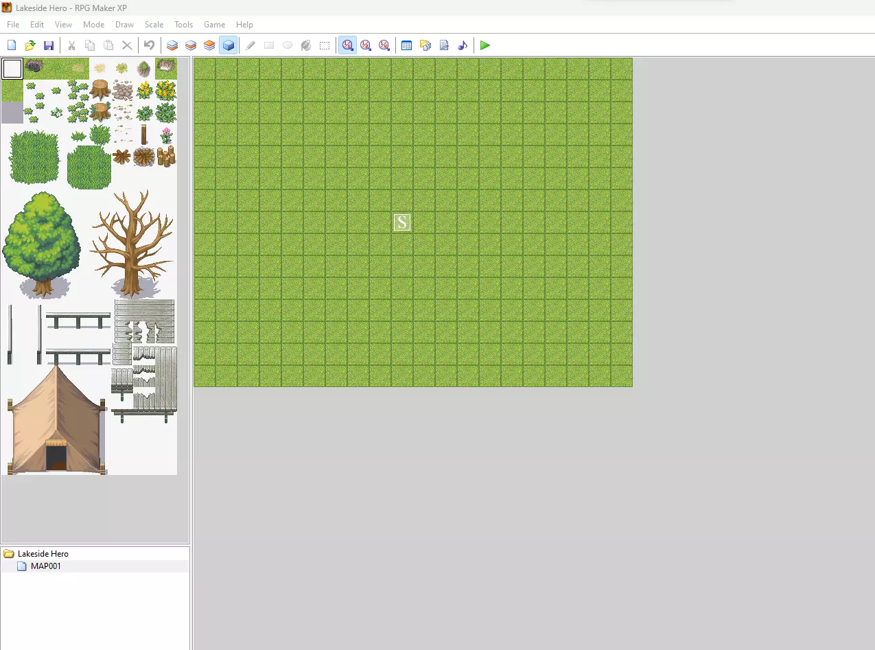 默认关卡还不错,但“MAP001”这个名字没什么用。我们需要不用每次打开关卡就能知道它们是什么。右键点击MAP001,左键点击“属性”,这会打开“地图属性”对话框。在这里我们可以看到没有背景音乐(BGM),没有背景音效(BGS),没有遇敌, tileset是001:草原,关卡是最小尺寸20×15单位。将地图重命名为“Daytime_Lake”,其他保持不变,然后点击“确定”。 现在我们需要设计这个小湖泊。由于这是默认地图,第一层预先填充了草地 tiles。要记住,玩家在第一层和第二层上方行走,但在第三层后方。我们将选择水坑地砖,并在第一层绘制一个湖泊,替换掉几块可行走的草地地砖。要选择第一层,请点击工具栏最左侧的图层选择器。