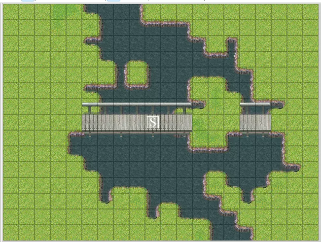 复制“Daytime_Lake”中的事件,并将其粘贴到“Nighttime_Lake”地图的相同位置。现在我们必须反转地图,将一个控制项添加到另一个减一控制项中。现在我们可以返回“Daytime_Lake”,并从事件中移除火焰图形。 桥梁守护者 我们已经有了湖泊地图和昼夜转换的方法,现在来看看如何创建一场 Boss 战。你需要再次设计一个关卡。到目前为止,你应该已经熟悉地图编辑器的使用了,对于下一个区域,请使用“034: Bridge” tileset,并创建一个简单的桥梁作为唯一的前进路径,如下所示。