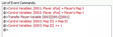 现在我们只需要一种更改地图ID的方法。地图ID是按照地图创建的顺序生成的。因此,我们的默认地图ID为001,第二个地图的地图ID为002。了解这一点后,我们可以首先创建一个控制变量命令,将地图ID设置为当前地图的ID,然后加1以进入【Nighttime_Lake】。不过,正如你在下面看到的,我们的事件顺序不太合理。这是为了可读性和后续编辑。
