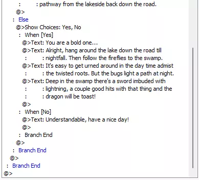 太好了!我们正式接到了一个任务。我们只需要为“获得剑”添加一个开关,并添加条件语句来确认任务已完成。让我们创建一个条件命令,并将任务文本添加到条件检查的“否则”部分。在条件检查的第一部分,我们将添加第二个条件检查,看看龙是否已经被杀死。 如果我们既有剑,龙也被杀死了,骑士会说A 如果我们有剑但龙没有被杀死,骑士会说B 我们还可以在选择命令之前添加一个条件检查,看看龙是否已经被杀死。 提示骑士说C