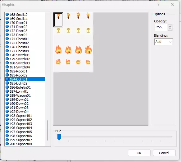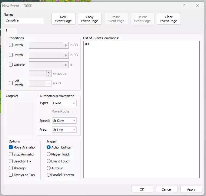 我们可以剪切并粘贴指令,使其顺序更合理。在这种情况下,指令顺序影响不大,因为只有在变量设置完成后才会进行传输。不过,指令顺序仍然很重要,我们将在本指南后面创建任务NPC时看到这一点。现在保存并应用这些指令。 双击“图形:”标题下方的空白矩形。会弹出另一个对话框。向下滚动,找到“184-Light01”,选择最左侧从下往上数第二个营火。在图形下方的选项中,选择“停止动画”,因为“移动动画”只有在事件位置改变时才会播放动画。在移动选项中,将速度改为最快。这决定了事件的速度。对于NPC,他们的移动速度会更快,因此动画帧的切换速度也会加快。火焰特效的动画帧切换速度现在也同样如此。