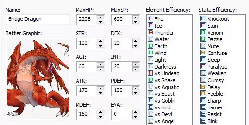 解决该问题后,我们需要回到老朋友——数据库。在数据库中点击【敌人】选项卡,然后按照增加 tileset 数量的相同方式,将最大敌人数量修改为 33。双击【战斗者图像】框,和为营火选择火焰图像时类似,会显示资产列表。向下滚动并选择【099-Monster13】,点击【确定】进行确认。现在我们将敌人命名为【桥梁巨龙】。目前所有属性均为默认值。我们要将其经验值设为一万,使其弱点为雷属性伤害,并调整其属性。下方为该巨龙的属性和弱点数据。