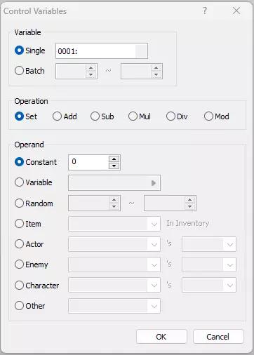 点击“Single”旁边的变量选择器框,这将打开变量列表。将第一个变量重命名为“Player xPos”,第二个重命名为“Player yPos”。应用并确认变量名称。在控制变量对话框中,选择“Player xPos”作为变量,选择操作“Set”和操作数“Character”,在右侧的选择器中选择“Player”和“Map X”。此变量现在会将“Player xPos”变量设置为玩家的地图X坐标。