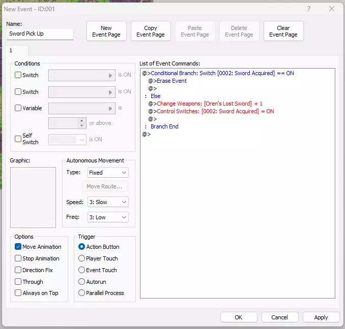 现在我们只需要创建一个可交互事件,将剑添加到玩家的物品栏中。如果你注意到在我的示例任务对话中,我使用【变更物品...】和【变更金币...】命令向玩家物品栏添加了奖励。在这个由动作按钮触发的事件中,我们将添加一个简单的【变更武器...】命令。然后,我们将使用【获得剑】开关,以防止玩家通过循环与事件交互来多次拾取剑。