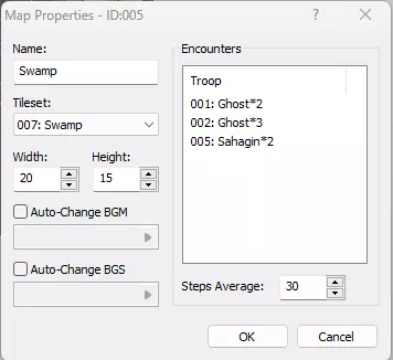不过,目前玩家无法在地图上看到事件地点。为解决此问题,我们添加了一个简单的图形,由于没有可用的文字图形,我选择了一个倒下的长袍人影。添加此图形后,我们的任务已接近完成。剩下的就是添加从沼泽到夜间湖泊的往返传送。在我的任务中,我告诉玩家跟随萤火虫,因此我的湖边传送点有一个萤火虫图形,并通过动作按钮激活。 此外,我们还可以做更多事情。现在是时候为沼泽添加随机遇敌了。 右键点击沼泽地图并访问其属性。然后双击遇敌列表框,从部队列表中添加三个部队。记住,你可以按照我们制作龙 boss 战的相同方法来创建自己的敌人和部队。以下是我从默认遭遇列表中做出的选择。