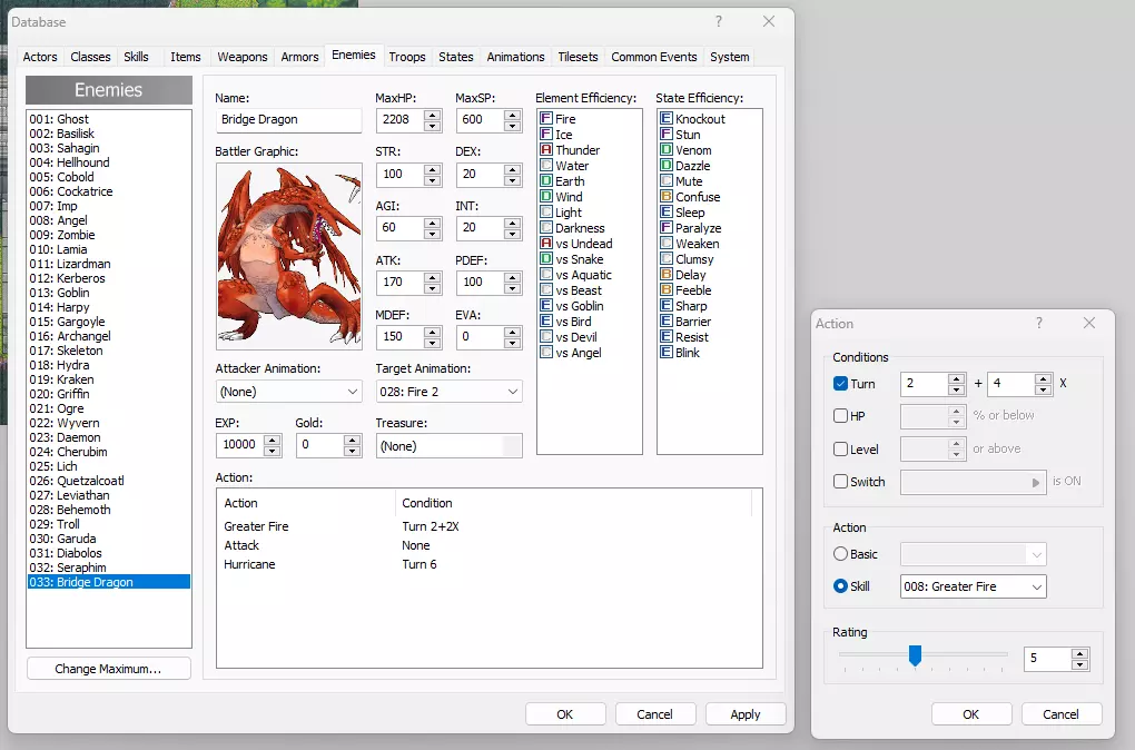 在设置好我们的龙之后,我们需要为它的攻击选择动画,以及它在战斗过程中会采取的行动。目标动画选择“028:火焰2”,在战斗场景中,这会让龙看起来像是向玩家喷出了一股火焰。为它的行动添加“强效火焰”“普通攻击”和“飓风”。普通攻击的条件设为无。飓风的触发条件为第6回合,强效火焰的触发条件为第2+4X回合。这样设置后,龙会常规使用普通攻击,释放一次飓风,并从第2回合开始每4回合常规喷火。