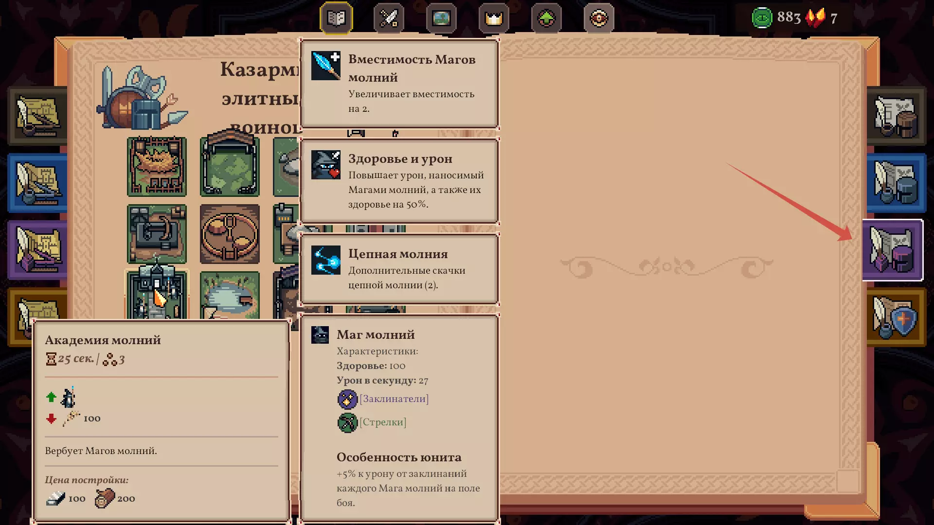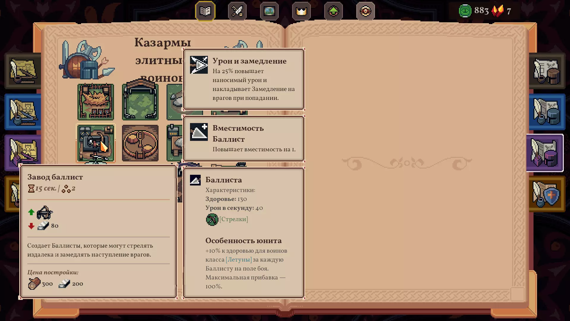 我们的目标:在第二章【帕特里夏(水晶城堡)】中击败第一个 Boss。如果成功,之后无论选择哪个国王,游戏都会变得非常轻松且节奏舒缓。 战术:游戏刚开始时,卖掉魔法学院和农民粮仓的图纸(魔法学院可能会造成阻碍,无法获得所需的升级),而粮仓能提供金币。 首先需要清理带有升级效果的格子,并快速收集150单位的水,以便建造绘图桌。使用绘图桌时,重要的是开始研究精英战士的营房以获取【水晶城堡】。如果没有获得,第二次就应该每次花费10金币重新选择,以确保能得到它。