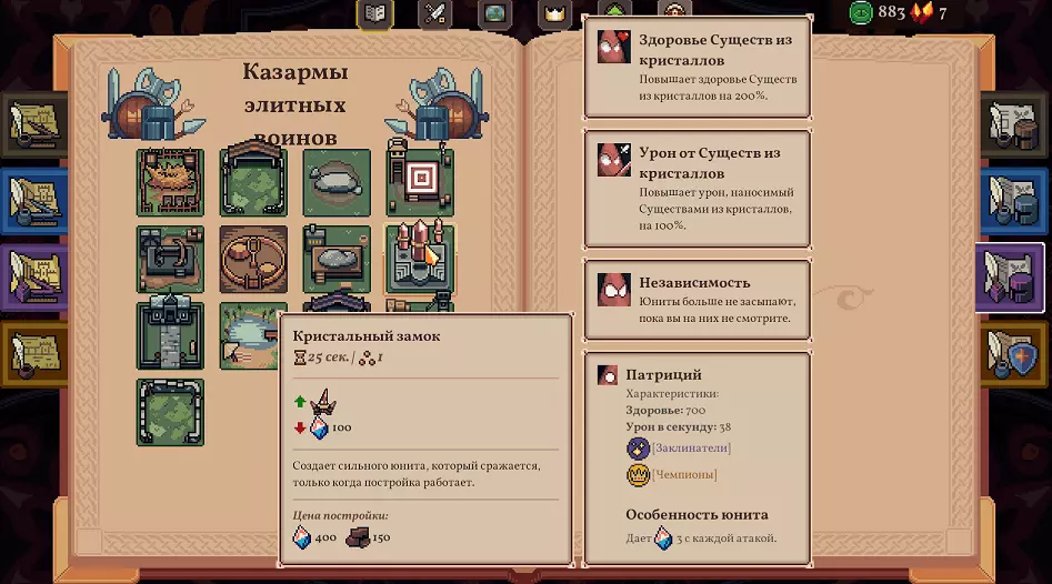 为什么要尽快获得它,以便在商人那里购买专为帕特里夏准备的强化,尤其是先从【独立】强化开始,这样就能建造后无需看管。由于我们初期只有2个建筑可以进行强化(市场和水晶城堡),所以在第一个 Boss 出现前,它应该能被完全强化。经济系统:首先获取1个绘图桌,获取1个水晶锁,并将绘图桌切换为普通资源(每种资源上限200)。初始阶段你需要1个黏土和3个水晶。树木仅用于提高单位上限,而水晶矿所需的矿石可以从初始的矿脉获取,黏土也是如此(各25个黏土和25个矿石)。这样的格子有2个就足够了,如果轮流放置的话,足够建造5个水晶矿场,而黏土能让你更接近水晶城堡。接下来要看具体情况,有黄金的话就开采200单位的金矿,并争取升级【洞察】技能。击败第一个 Boss 后就会变得非常轻松,届时就能为自己的部队阵容赚取资源了。从一开始只选择一波敌人,甚至可能在击败第一个 Boss 之前就这么做,这能极大地提升经济。初始单位有助于组建一支包含 2 名以上【贵族】的军队,这样在击败第一个 Boss 后,就有能力选择来自波次的奖励了。 图纸奖励包括: 1. 各 200 单位的资源,主要有:黏土、水晶、食物、木材、黄金 2.资源按1000单位计算——主要包括:1-2个金矿,1-2个小麦田,1个黏土矿。可以获取1个水晶矿,1个矿石矿,其余用伐木场补充。游戏中需要7-8个伐木场,为将军队规模提升至最大,需建造医院(2-3个)和弩炮营房(2个)。 3. 工业生产方面——只需建造铸造厂(1-2个),其他建筑甚至无需建造,全部兑换为金币。 营房: 所有1级营房——均兑换为金币。将所有2级军营转换为金币。3级军营保留水晶城堡,若未出现可重洗1次,其余转换为金币。 基础设施方面,初始会获得5个各100点的附魔师,这足够整个游戏使用。保留2-3座医院,其余可转换为金币。 所有升级优先选择部队相关,在商人处先购买部队升级,之后再考虑 artifacts。如果能从第一个 boss 身上掉落增加每个建筑上限 +1 的传奇 artifact(原词),那你就非常幸运了。这样一来,到第三个 boss 时拥有 12-16 个水晶守卫,就能在 1 分钟内将其击溃。 军队方面有几个参考标准: 到第一个 boss 时,需要拥有 2 个贵族。一旦有 2 个贵族存活,并且有火枪手和弓箭手,就可以在每一波选择更多奖励,敌人不会太可怕。一旦建造了2个【帕特里夏】,建议通过设计桌获取1个【闪电法师营房】、1个【治疗师营房】,然后再补充2-3个【帕特里夏营房】,此时它们应该已经能产出约1000个水晶,这不会有问题。