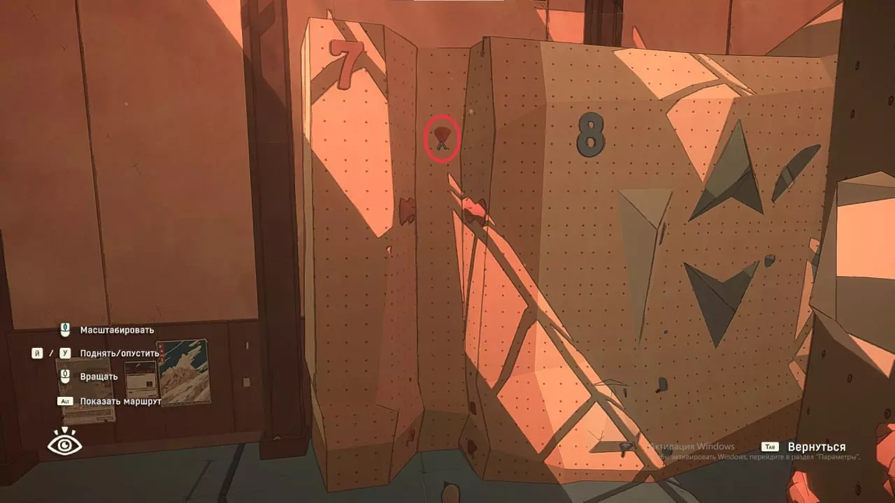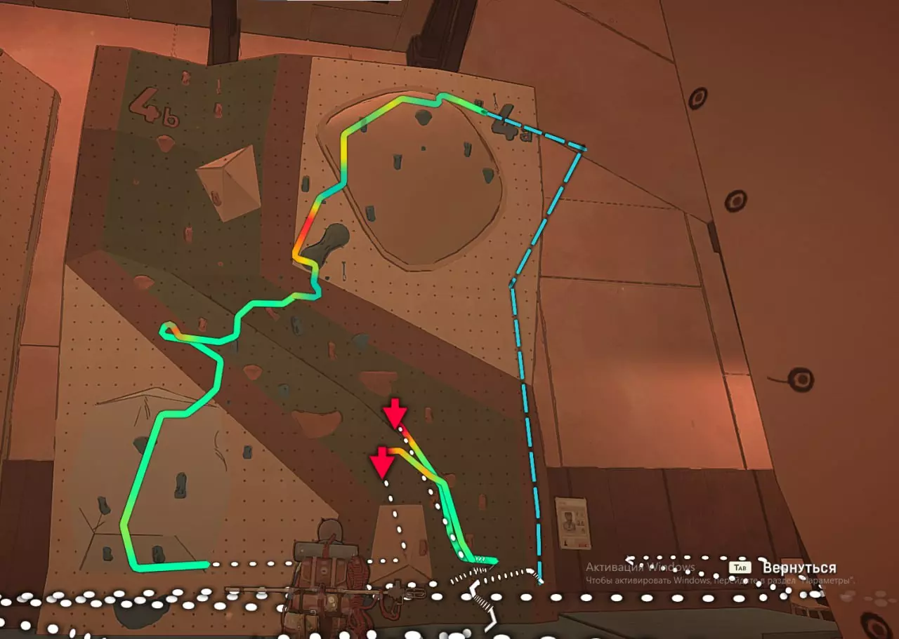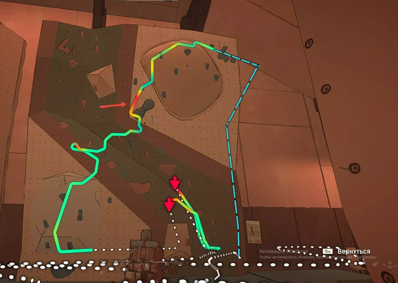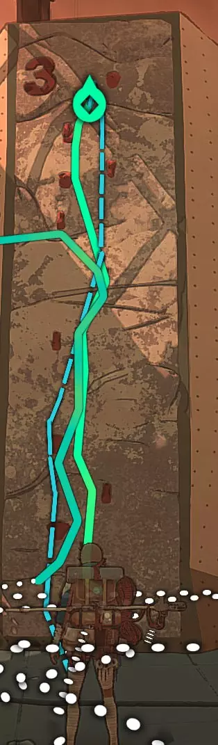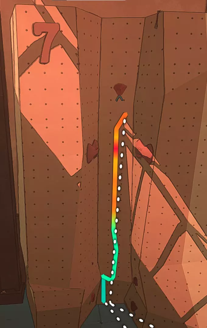 在这张截图中,我标出了自己尝试绕过系统并以非常规方式通关的过程。 攀岩墙7号 垂直爬升 这个攀岩墙上没有挂钩,几乎也没有岩石。而需要到达的那块岩石位置相当高。