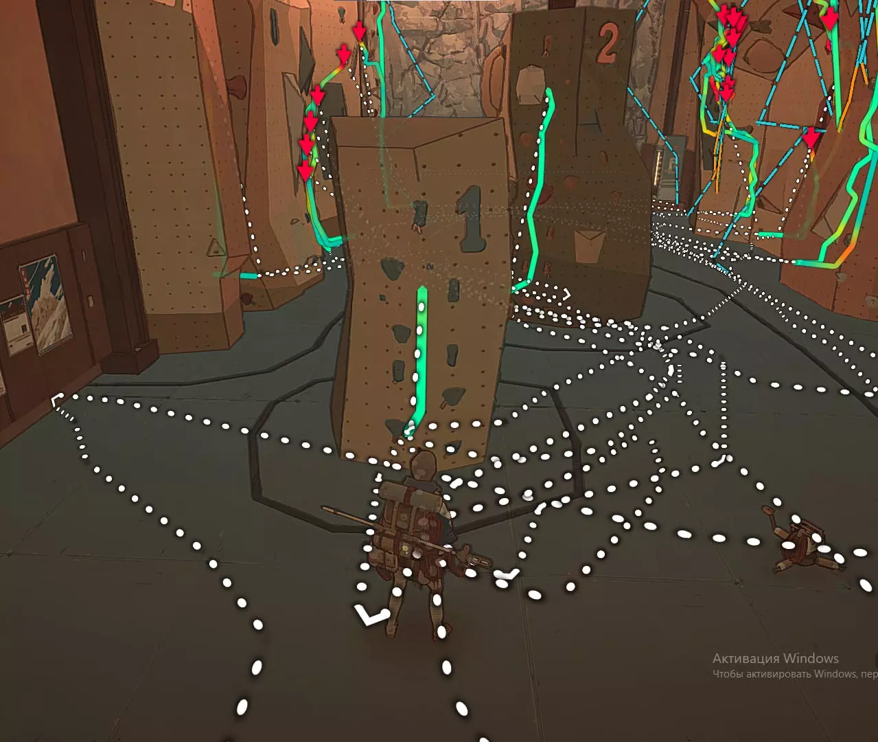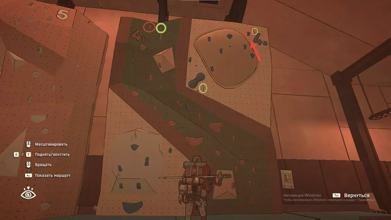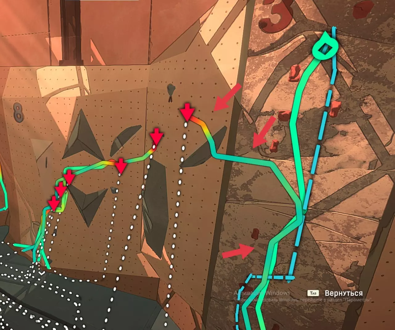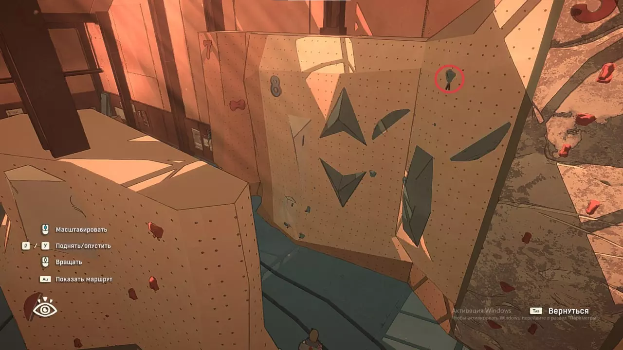 在这张截图中,我标出了自己尝试绕过系统并以非常规方式通关的过程。 攀岩墙7号 垂直爬升 这个攀岩墙上没有挂钩,几乎也没有岩石。而需要到达的那块岩石位置相当高。