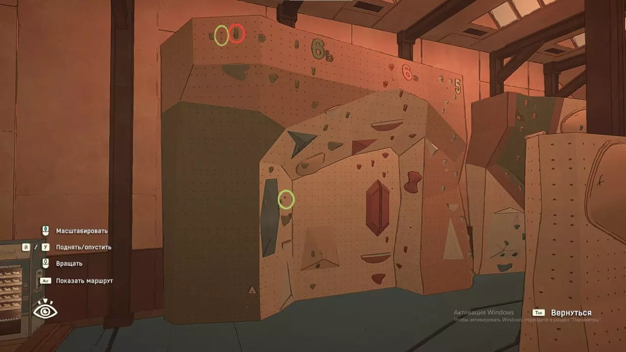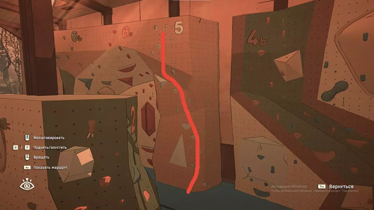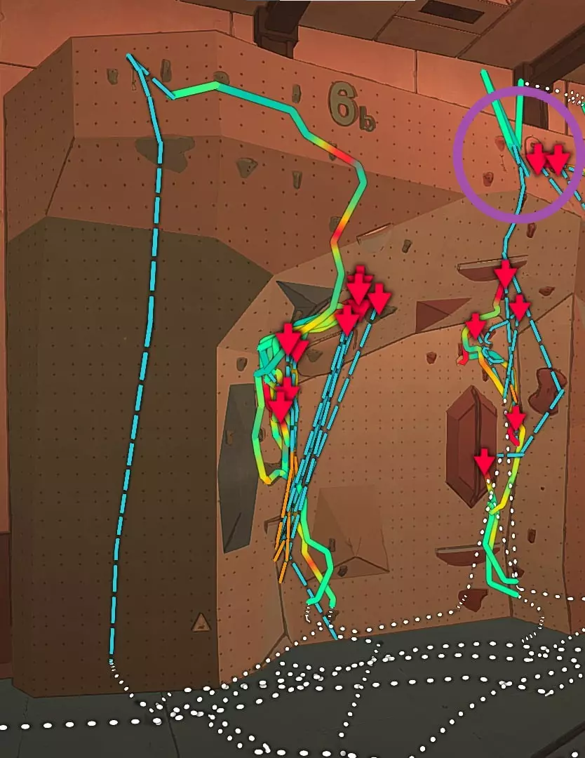祝你好运去搞明白吧 :) 攀岩墙6-a和6-b 赶紧把它搞定!我大概花了40分钟尝试通过这个地狱般的玩意儿。我试了6-a和6-b,一开始全都徒劳无功(顺便说一句,这个攀岩墙是我最后才通过的)。有保险措施,但只有2个,而且它们的位置设置得几乎没什么用。当然,顶部的挂钩是有意义的,但它只用于下降。为了让你们理解我的愤怒,我之前尝试从5号线下去到6号线,然后触碰石头来完成6号线的通关,但当时没成功,我就放弃了,去玩其他攀岩路线了。后来我休息了一下没玩游戏,没想到回来后一次就通过了这条该死的路线。 这就是我的体会。通过这里需要高度集中注意力(用于手动控制肢体),即使角色濒临坠落也要保持冷静,还要有一点细心(因为我一开始没注意到某些石块),最重要的是耐心(因为你们也知道,我这条路线不是一次就成功的)。建议你们尝试我的路线,沿着6-b路线攀爬。