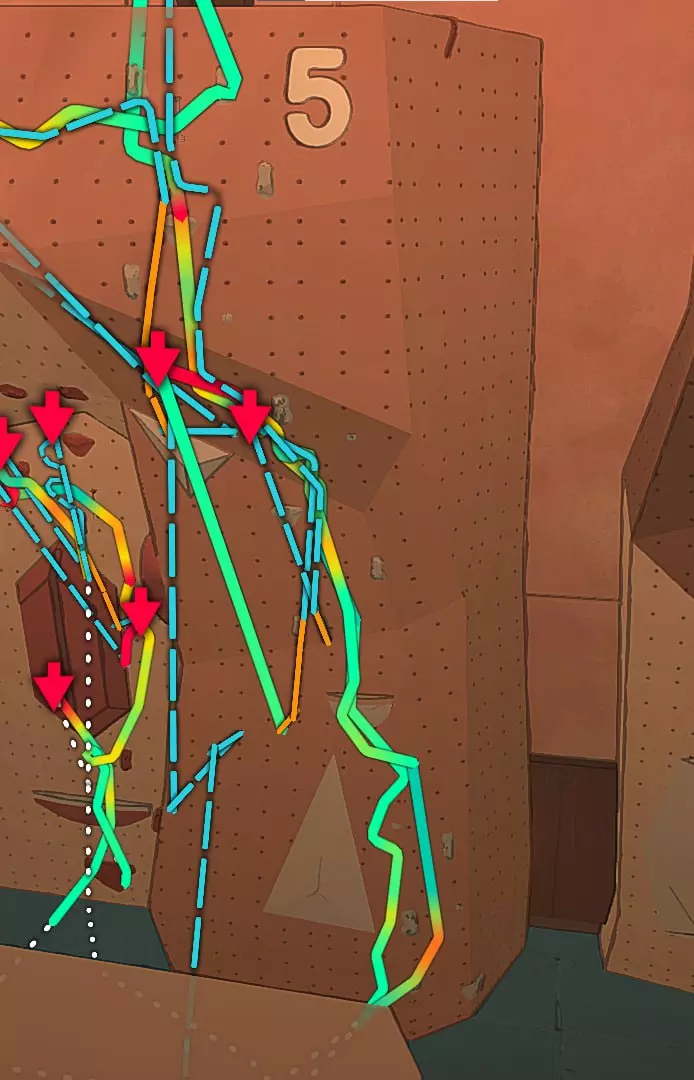攀岩场4-a和4-b 开始进阶训练。这个攀岩场有两条可选路线:红色岩石路线和蓝色岩石路线。需要说明的是,这个攀岩场有新机制,即出现了保险钩。它们可以让主角恢复体力,并且在坠落时,你可以通过绳索回到保险钩处继续游戏。如果之前我们可以依靠自动选择肢体,那么这次我建议在困难时刻使用手动选择肢体(因为这能避免出现你需要移动手,而游戏却判定为需要移动脚的情况)