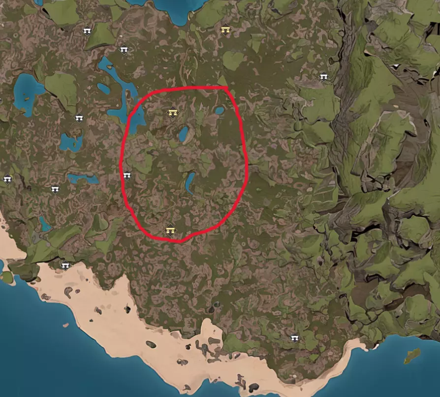 “每次循环制作的物品”含义很明确,但循环间隔的设置则更为复杂。我们以木板为例,如果你设置一个循环订单为制作5块木板,循环间隔1分钟,那么被分配的工匠会先制作5块木板,之后该制作订单会从队列中移除1分钟,让工匠可以去处理下一个物品。如果你将制作间隔设为0,工匠就会持续制作该物品,不会继续处理队列中的下一个订单。因此,我建议循环间隔至少设置为1分钟。 设置多个循环订单时,请注意完成一个订单所需的时间(在齿轮图标旁显示)。例如,如果你设置制作40块木板,耗时1分钟,并将制作间隔设为1分钟,然后可以再设置一个制作40个木柄的订单(同样耗时1分钟),制作间隔也设为1分钟。这样设置能让你的工匠交替制作40块木板和40个木柄,中间不会有空闲时间。 我通常会给专门的工匠留出一些休息时间,让他们能休息、吃饭和喝水,但这取决于你自己的安排。 巧妙利用重复订单,再加上一些追随者进行采集,最终可以实现近乎全时段的自动化生产。到那时,你的工作就是收集那些无法自动采集的材料,比如矿石。一旦你有了兽栏,甚至骨头和毛皮也能实现自动化获取。这种程度的自动化并非必需,但作为一名自动化游戏的忠实爱好者,这正是我如此喜爱《灵魂面具》的原因之一。 攻略 这是一款沙盒游戏,因此没有唯一的最佳玩法,但在本节中,我将介绍我通常如何开始新游戏,直至击败第一个 boss。 首先,我强烈建议跟随游戏内教程,即使你像我一样已经玩过三四遍。完成教程的每个部分都能获得感知 XP。教程还会引导你了解游戏中所有能让你更轻松的内容,比如自动化系统以及关键的 boss 和地下城。 感知 1 - 15 级与你的第一个临时基地 现在你已开始游戏,并在雨林中的某个位置出生。教程会很快引导你开始建造,这意味着你要搭建自己的第一个基地。选择一个好的基地位置能让你后续的游戏体验轻松不少。 这个初始基地通常只是临时的。我会一直用到制作出骨制装备和获得羊驼为止,届时我就有足够的能力在更理想的位置建造一个更永久的基地了。 考虑到这一点,第一个基地的位置其实不是特别重要。不过,靠近某些事物确实能让初期生活更便利。首先,我喜欢把基地建在某个神秘遗迹附近。地图上从一开始就会显示出三处金色遗迹。这些地方是教程会引导你解锁面具上控制节点的位置,同时也是早期获取面具升级材料、宝箱和流亡者掉落物的好来源,而流亡者本身也是你第一批追随者的理想目标。 我希望基地靠近的第二个条件是水源。水源附近通常有黏土,这是你建造一些工作台所需要的材料,如果你想制作更多食物,黏土也能用来制作碗。水源附近还会刷新水豚和火鸡,而且周围通常没有直接的攻击性掠食者,这意味着你的追随者在采集时被袭击的几率更小。 综合考虑以上两点,我建议这个高亮区域是你第一个基地的绝佳位置。
