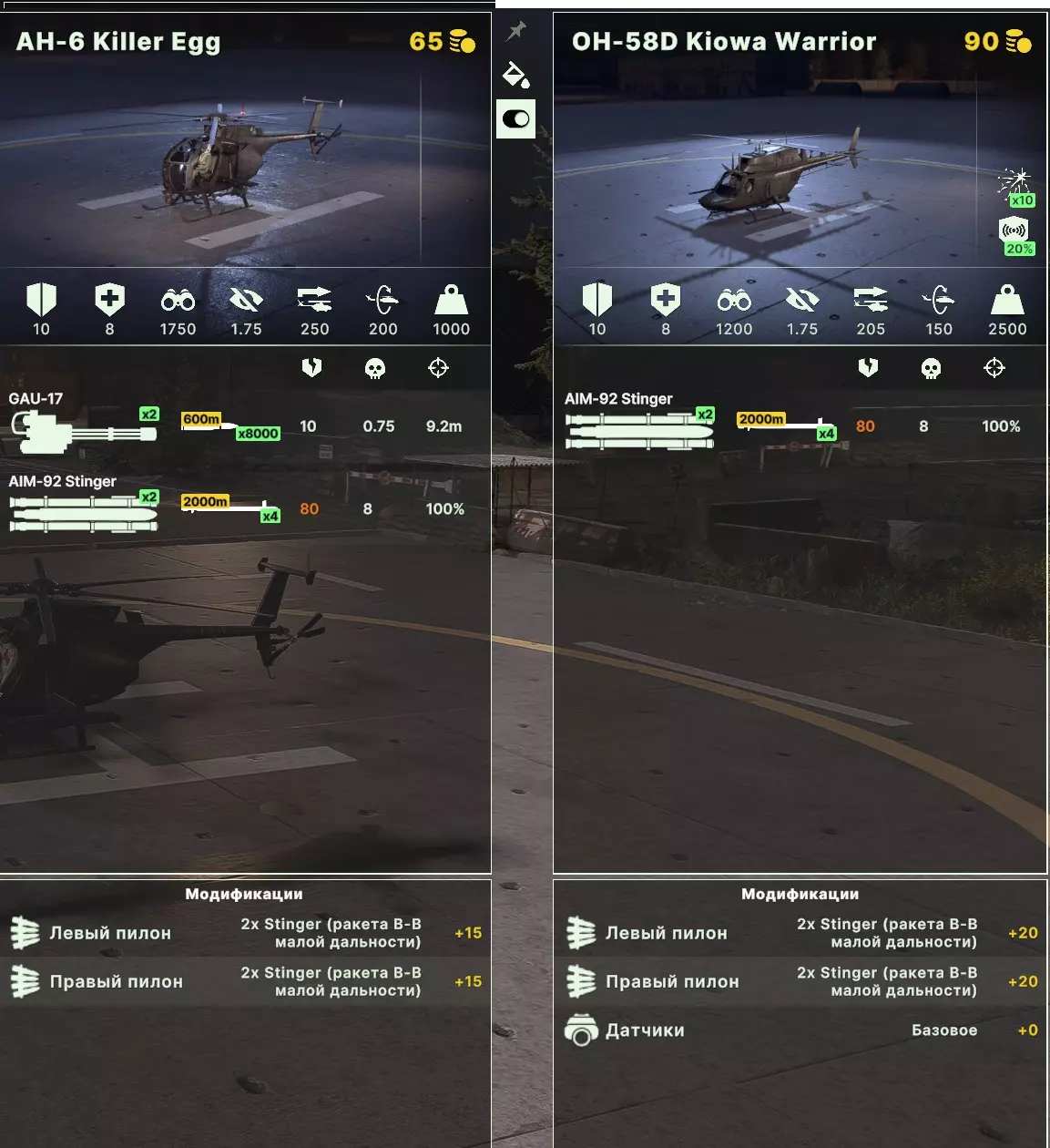 1) 九头蛇(Hydra)无控火箭弹:最大射程1200米,穿深70毫米,伤害3.5,本质上是我们S8火箭弹的同类产品,性能相近,有就可以用。 2) TOW-2反坦克导弹:最大射程1600米,穿深900毫米,伤害12,是我们“科科纳”(Кокона)导弹的优质同类产品,数据看起来不错,但相对较短的射程以及“地狱火”(Hellfire)导弹作为替代选择的存在,使得这类弹药在我们的装备体系中没有位置,不建议选用。 3) APKWS制导火箭弹:最大射程1400米,穿深70毫米,伤害3.5。本质上和普通火箭弹一样,但可以通过激光瞄准进行校正。如果有人使用激光瞄准,可能会有帮助;如果没有,那和普通火箭弹没区别。 4) 反坦克导弹地狱火,最大射程1900米,穿深900毫米(能打穿车顶!)5) 反坦克导弹“地狱火-L”(Hellfire-L)最大射程1800米,穿深900毫米(能打穿顶部装甲!!)5)伤害15——类似地狱火导弹,可安装在长弓侦察型上,具备主动搜索系统,如同我们的赫尔墨斯导弹,能极其有效地利用地形和建筑物,发射后可立即隐蔽。这架载具可同时搭载16枚(!!!)导弹 6)多用途导弹DAGR,最大射程1400米,穿深70毫米,伤害3.5,本质上就是带修正功能的非制导火箭弹,实用性存疑。 7)空空导弹AIM-9响尾蛇,最大射程2100米,穿深65毫米,伤害13。这是一种非常强大的火箭弹,能够给敌方直升机带来严重麻烦,其射程占据优势,伤害也很可观。缺点是可装载的火箭弹数量较少。 8) 防空火箭弹【Stinger】最大射程2000米,80毫米穿透力,伤害8点,乍一看似乎和我们的导弹差不多,但问题在于细节,也就是10点穿透力和1点伤害使得这些导弹几乎不需要3次命中,而是2次命中就能击穿大多数直升机。此外还需要考虑一个事实,那就是可以组装廉价的小型直升机,在机上配备4枚这样的导弹(例如90点的Kiowa,或65点的Killer egg)。非常强力。AGM-122 Sidearm空空导弹(原词:ППВО (ПРЛ) ракета AGM-122 Sidearm),可自主搜索并摧毁3公里范围内开启雷达的目标。每架直升机可挂载2枚该导弹,在最多部署4架直升机的情况下,总计可携带8枚。细节中再次暗藏玄机,配备这种导弹的“超级眼镜蛇”武装直升机单价为135分,最多可部署4架。虽然这类直升机往往无法深入敌方区域,但仅需540分,就能对敌方防空单位进行持续骚扰,或实施战术迂回。嗯,需要在游戏中进行更多测试,听起来很带感。对了,只有海军陆战队才能使用) 10) PT导弹JAGM最大射程2000米,穿深900毫米(能打穿车顶!),伤害15 - 类似地狱火-L,装备在最新型的AH-64E上,具备主动搜索系统。 直升机 overview 及搭配建议 已经了解了各种小玩意儿,现在让我们来弄清楚如何轻松组合它们: