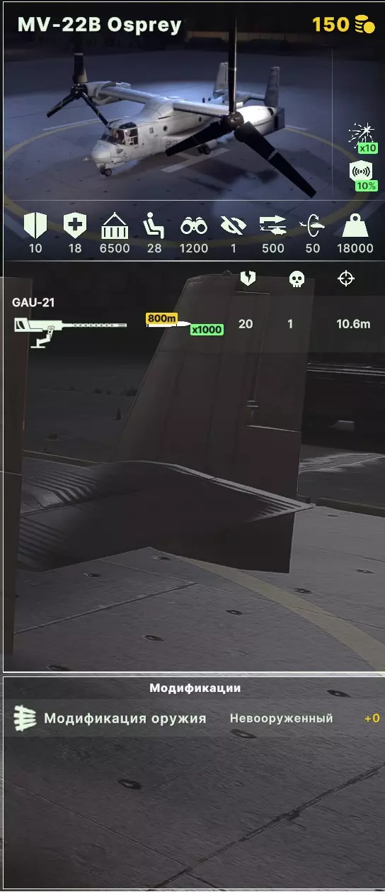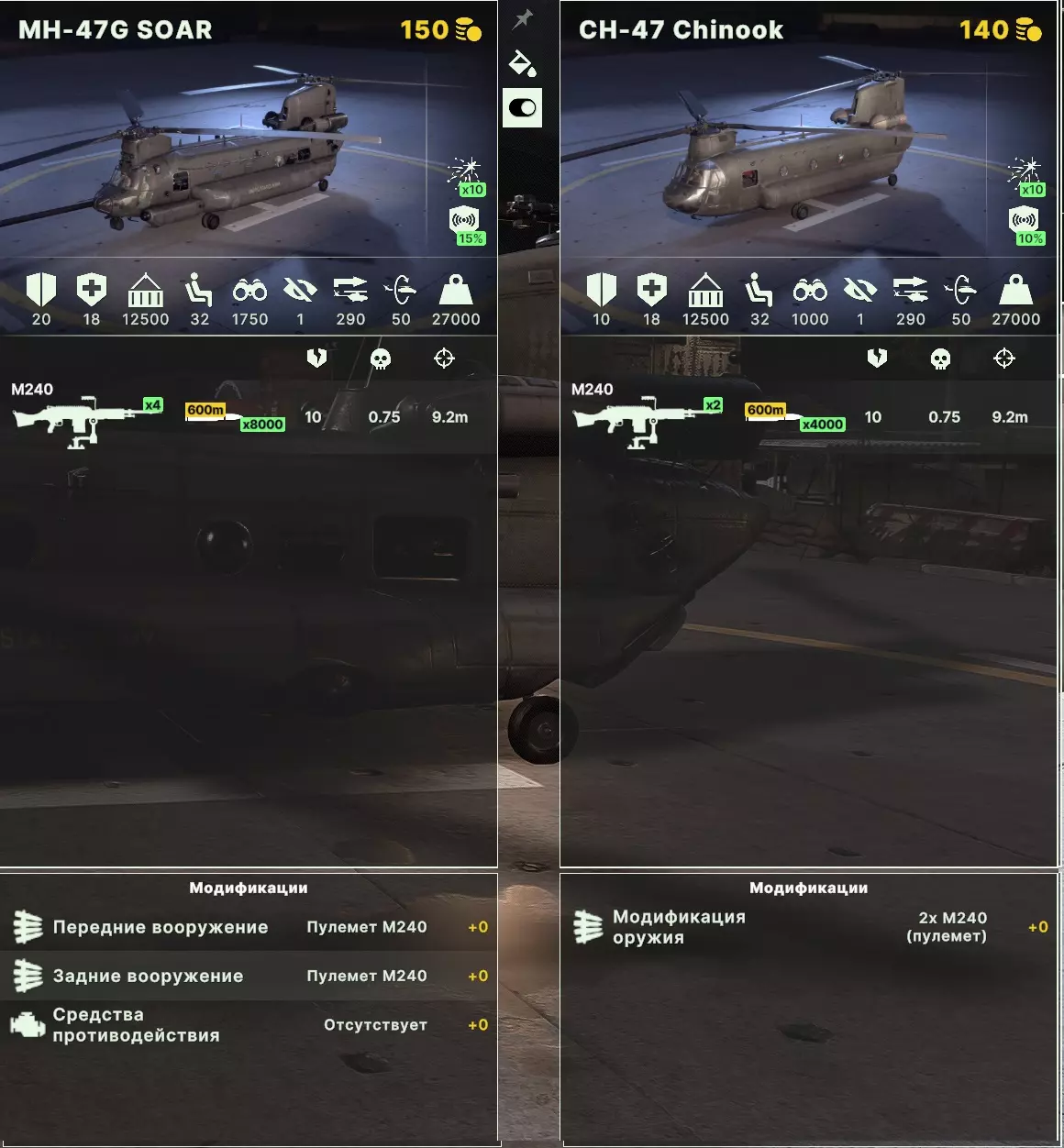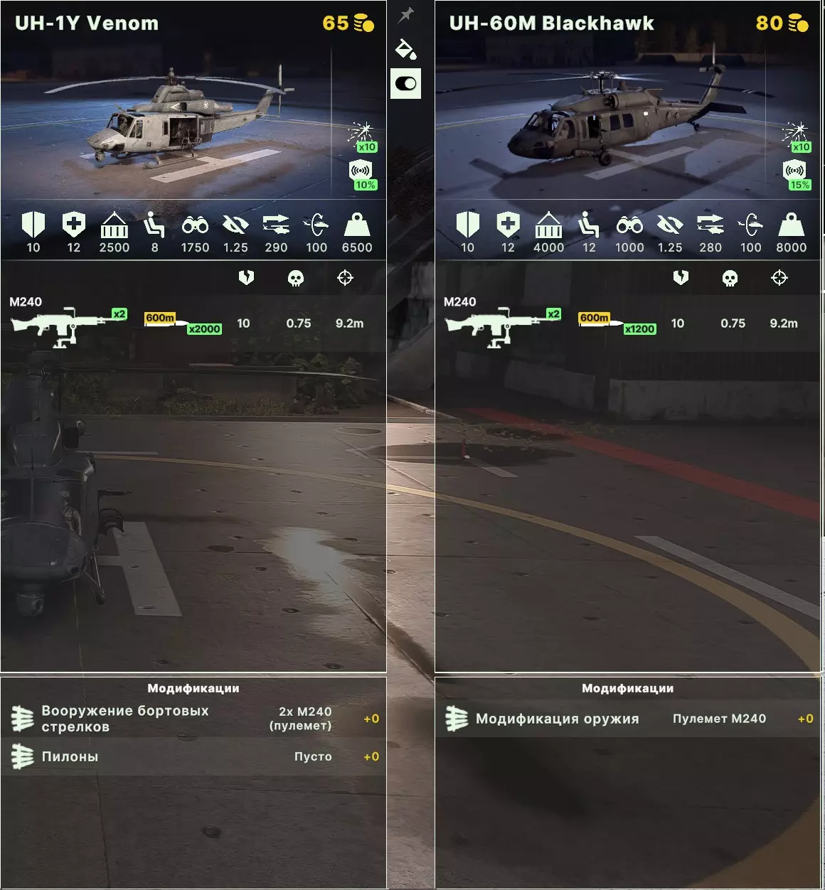 UH系列直升机是广为人知的“黑鹰”直升机及其前身“毒液”和其他衍生型号。它具有出色的速度、有效载荷能力和兵员运输能力,且价格相当合理(在俄罗斯的同类直升机中实际上没有替代品)。SOAR改装型号拥有更好的视野(2000对比1000),而DAP改装则能使其成为一架相当强大的武装支援直升机,不过价格也会相应上涨。还有一种采用“隐形”技术的“沉默鹰”改装型号,非常适合在敌后执行各种渗透任务,80分的顶级选择。