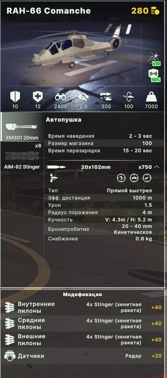 RAH-66科曼奇直升机初看之下生命值高得离谱,就像史前巨蟒一样,但当你看到它2.5的隐蔽性时,一切都变了。没错,这是一架隐形直升机,在大多数情况下它都拥有先手优势。这是一款真正的多面手载具,可以装备它深入敌后执行敌方大型防空和火炮的侦察任务,也能用于高效对抗敌方直升机,因为这个“怪物”能搭载多达12枚“毒刺”导弹。不过,其价格也与此性能相符。