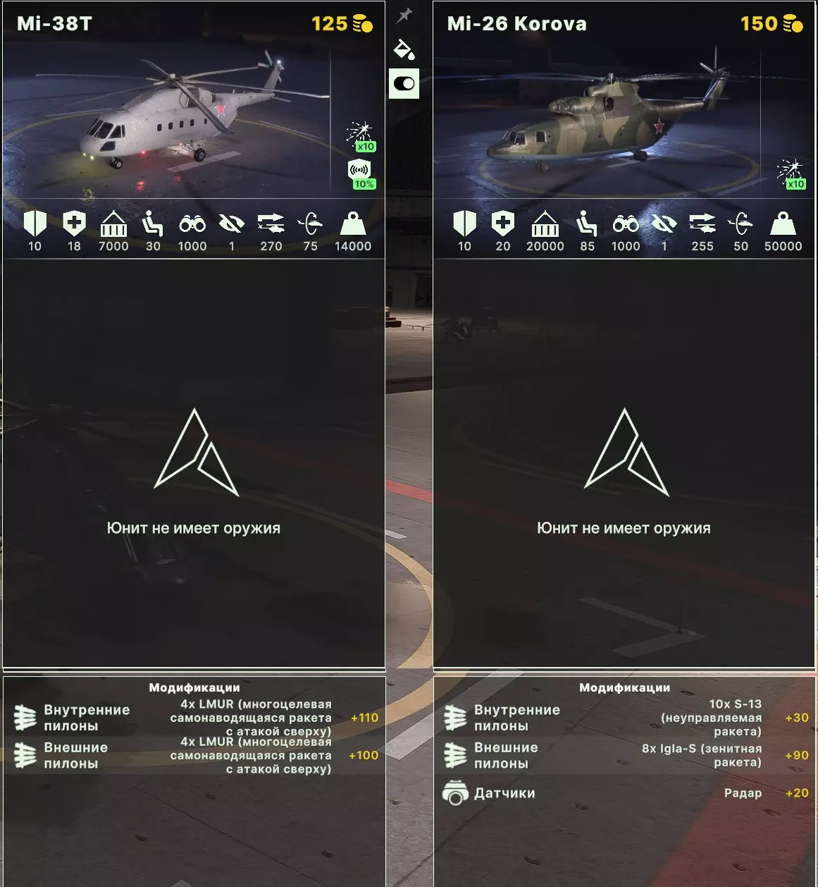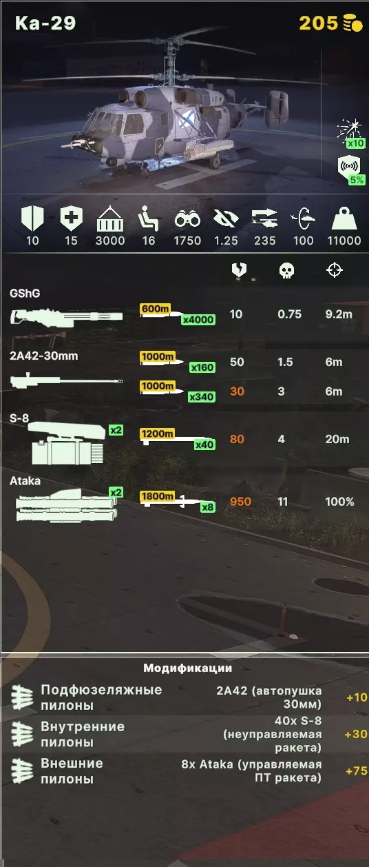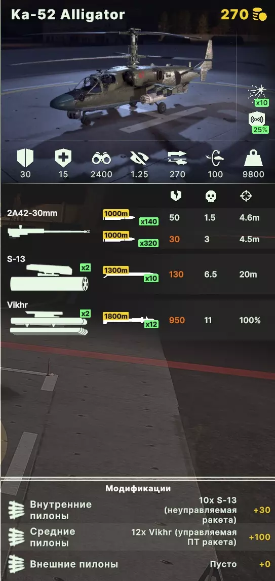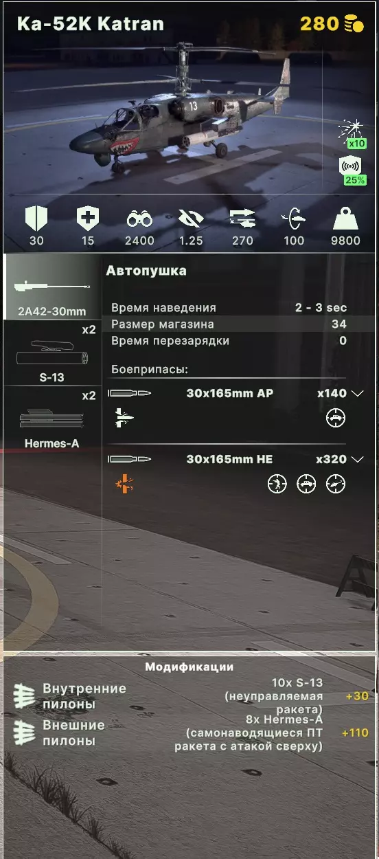 攻击直升机: Ka-52 短吻鳄和 Katran - 推荐作为攻击型反坦克直升机使用,通常很容易回本,能快速从侧翼转移到侧翼,并支援进攻和防御。不建议将其改造为多用途直升机,毕竟4枚火箭弹起不了什么作用(要记住其伤害较低)。优点是拥有良好的电子战系统、生存能力和速度。缺点当然是价格较高。在卡特兰娜的情况下,我们选择赫尔墨斯导弹,能获得最佳的性价比。如果有人想尝试,可以玩玩巡航导弹和反雷达系统。