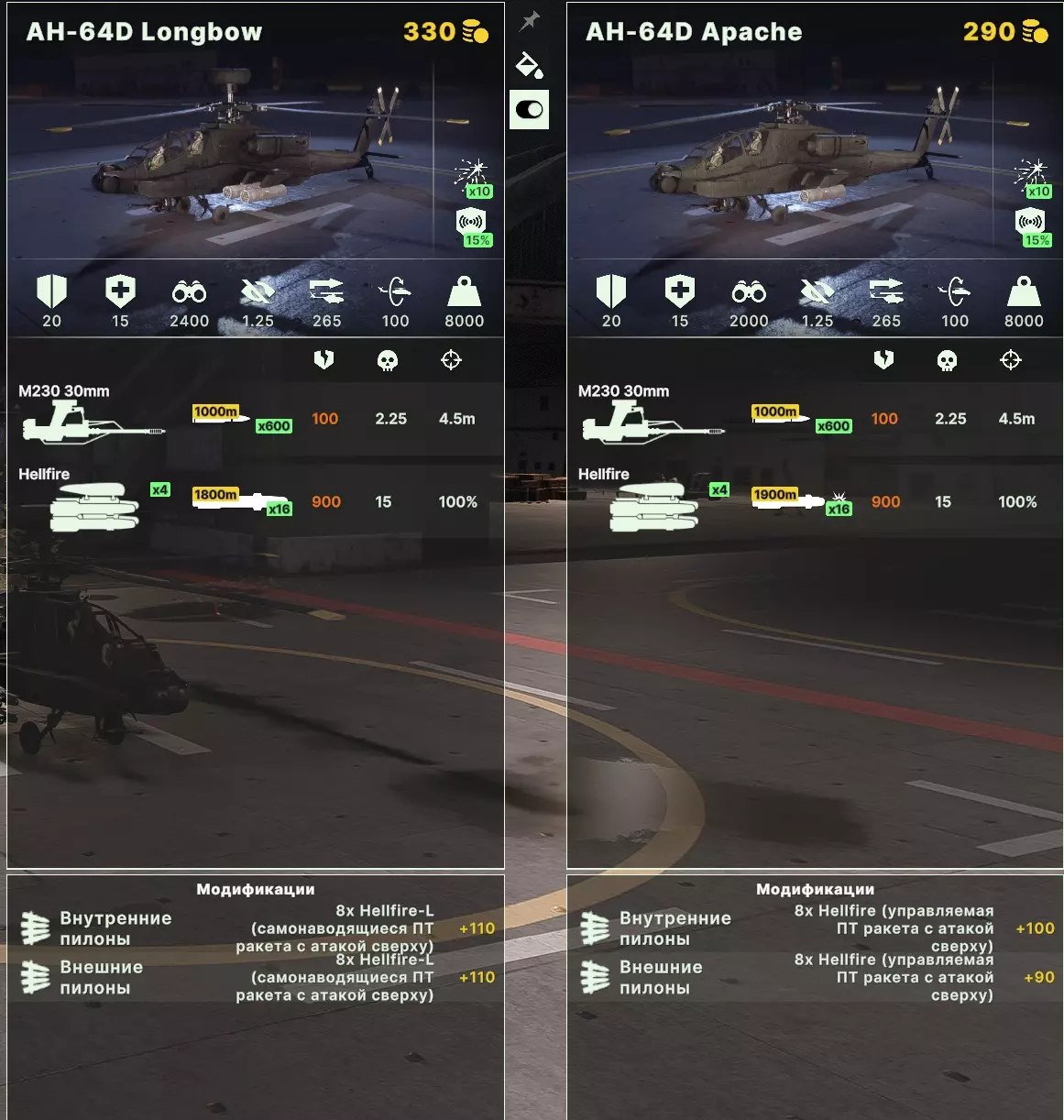AH-64D阿帕奇和长弓,以及较新型的AH-64E守护者,是美国直升机制造业的血脉传承,是地面作战的中坚力量,是敌人的克星。当然也可以将其改装为炮艇机,但何必呢?我们为其挂载地狱火导弹,为敌方装甲部队带来炼狱般的打击。长弓型号的探测距离更远,其导弹具备主动制导能力,虽然价格稍高,但每一分钱都物有所值。守护者同样具有长弓的外观,配备了最先进的主动制导反坦克导弹——JAGM,拥有出色的电子战性能,但顶配版本的价格开始变得相当昂贵。