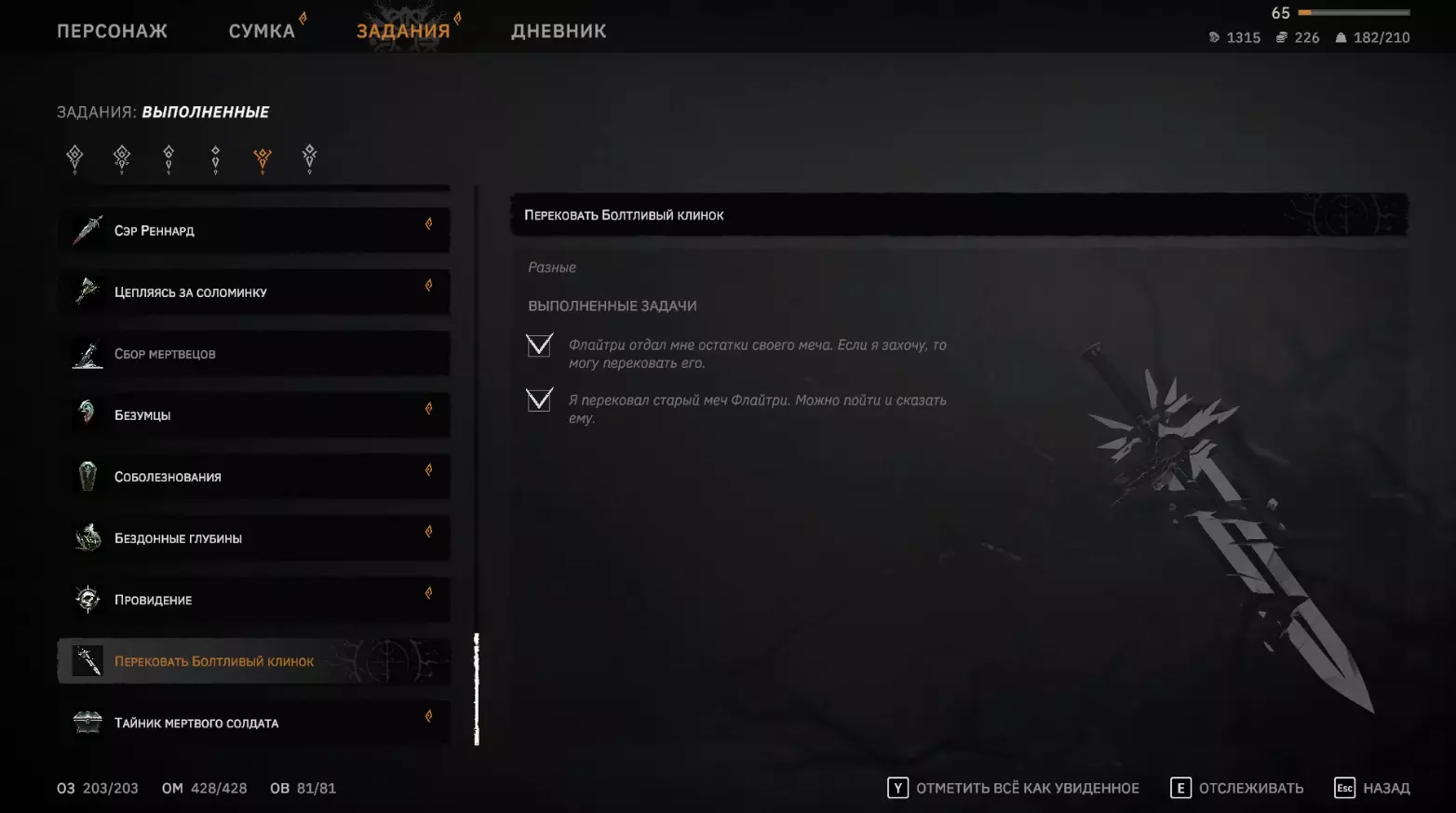 谈话结束后,他会给你【喋喋不休之刃】的碎片。 任务【重铸喋喋不休之刃】 为什么是刀刃碎片?去问铁匠吧xD 接下来和弗莱特里交谈后,将开始与重铸武器相关的任务。