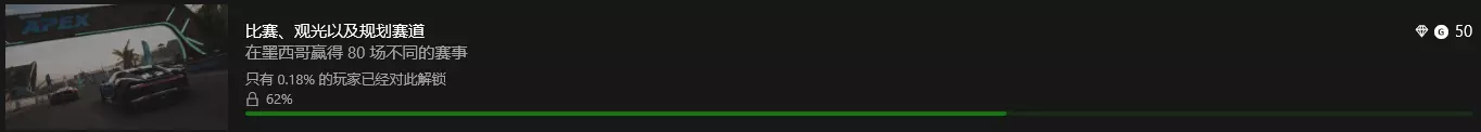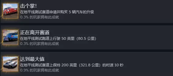 击个掌!/正在离开赛道/达到最大值 墨西哥嘉年华旁边有个测试赛道,进入后完成以下目标即可解锁全部成就: 1. 累计行驶80.5公里 2. 以321.8公里/小时的时速保持10秒 3. 升级五辆赛车(退出赛事后即可安装购买的升级部件)