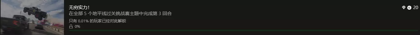 破冰/无穷实力 参与过关挑战赛(地图上有粉色圈圈标记的限时赛)即可解锁。本作中的公开挑战赛共有五种类型:空中、漂移、破坏、混乱、速度。将这五种挑战赛各完成三回合,即可达成另一项成就。