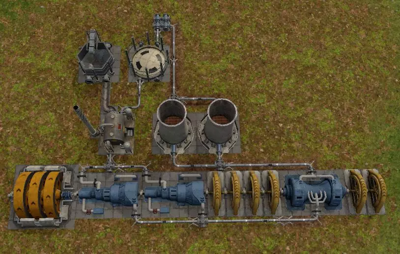 例如——发电厂能充分发挥锅炉的潜力。从上到下依次为:储水罐、储煤仓、锅炉、两台涡轮机(各带四台发电机),以及两个烟囱。 这座发电厂需要8名工人、18单位煤炭和48单位水,可产生1.2兆瓦电力。规划选址时,需在左侧或右侧预留扩建空间。 蒸汽涡轮机和发电机可进行扩建。 基础蒸汽发电厂存在蒸汽和水资源浪费的问题,后续科技能够帮助节约和高效利用这些资源。 机械塔的节能功能(自动平衡):当电力需求较低时,涡轮机可自动关闭。但在电力需求增加后,转子无法立即加速,因此需要飞轮。飞轮可以储存旋转质量的惯性:涡轮机可立即获得更多蒸汽,而当功耗增加时,发电机会停止运转,并且在几秒钟内无法供电。要解决此问题,你可以建造飞轮:发电量取决于转子的速度,而飞轮会在涡轮机启动时暂时保持其速度。注意:飞轮仅适用于具有自动平衡功能的涡轮机。 如果你有多个动力装置(同一轴上的涡轮机和发电机组合),请为满足常规消耗的涡轮机禁用自动平衡,而为其他涡轮机启用自动平衡。例如:你有5个动力装置,每个功率为1.8兆瓦。你的功耗在6到8兆瓦之间波动。可对3个动力装置(5.4兆瓦)禁用自动平衡,对2个动力装置(3.6兆瓦)启用自动平衡。冷却塔冷凝蒸汽,转化为水的效率为50%。一个冷却塔可处理24单位蒸汽(任何类型)并返回12单位水。每台涡轮机需要配备2个冷却塔。建造需使用【建筑零件III】(红色)。 低压涡轮机使用低压蒸汽工作,将其转化为乏蒸汽(SD),并产生1兆瓦机械功率。研发需要【实验室II】,建造需使用【建筑零件III】。 例如,优化的发电厂。涡轮机、发电机和飞轮的排列顺序不限,但传动轴上的机械功率限制为12兆瓦。