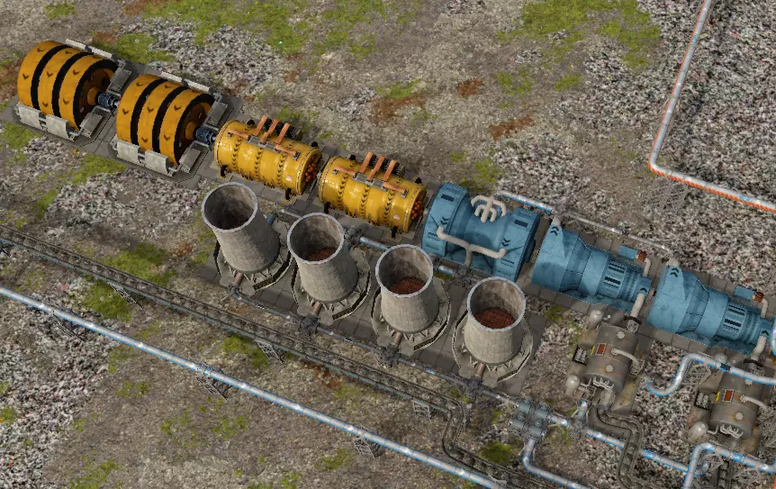 该系统需要30名工人、36单位煤炭和48单位水,可产生5兆瓦电力。之后,你可以过滤废气,每2个锅炉需要9.6单位水(1个废气洗涤器使用24单位水,可处理5个锅炉产生的废气)。 你也可以使用燃气锅炉替代燃煤锅炉。燃气锅炉使用燃气(或石油成分),产生48单位蒸汽,与燃煤锅炉相当。 核能 在大型涡轮机之后,你可以研究铀浓缩和核能技术。现在,你可以建造用于反应堆的铀棒工厂了。开始吧! 世界地图上的铀矿(2级)可产出12单位铀矿石。 货运站的每个散装模块需要60千瓦电力。 破碎机:12单位铀矿石可加工为12单位破碎铀矿石。 沉淀池:破碎铀矿石和4单位酸可加工为6单位黄饼和6单位有毒矿浆。浓缩厂 - 消耗3单位黄饼和1单位氟化氢,产出3单位铀芯块。每个反应堆需要2单位铀芯块。 沉淀池(其他) - 消耗8单位岩石和6单位酸,产出8单位氟化氢(及2单位矿渣)。按每个反应堆1/4产能计算 - 消耗2单位岩石和1.5单位酸。 混合器 - 消耗6单位硫磺和12单位水,产出24单位酸。沉淀池1需要4单位酸,沉淀池2需要1.5单位酸,向上取整为每个反应堆6单位酸,按1/4产能计算(1.5单位硫磺和3单位水)。 废物处理 - 消耗48单位有毒泥浆、4单位过滤介质和12单位盐水,产出40单位水和12单位矿渣。按每个反应堆1/8产能计算 - 消耗0.5单位过滤介质和1.5单位盐水。可选方案 - 在黄金工厂使用废物处理。 电动组装机II - 消耗12单位铀芯块和0.3单位钢材,产出2单位铀棒。按1/2产能计算。 例如 - 浓缩厂,为2个反应堆而建。