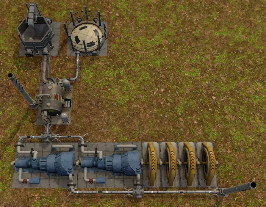 左侧为飞轮,右侧为低压涡轮机和两台额外发电机。锅炉右侧为2个冷却塔及连接至储罐的管道。若从蒸馏器或水泵铺设水管,需连接至【优先回收水】的平衡器。 现在,添加7名工人(总数15名),无需额外煤炭,用水量从48降至24,发电量为1.8兆瓦。 蒸汽涡轮机和发电机数量:2台 建造4号研究实验室后,可研发高级电力技术,进而建造大型涡轮机和发电机。 高压涡轮机II和低压涡轮机II的蒸汽消耗量(48和96)及发电量(2兆瓦)均为原来的两倍。电力发电机II需3兆瓦机械功率,可产生2.5兆瓦电力。接下来,每台高压涡轮机需要配备一个锅炉,每台低压涡轮机需要配备四个冷却塔。建造这些设施需要【建筑零件III】。