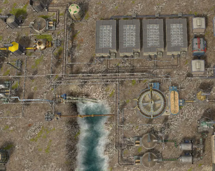 核反应堆满功率运行时需要288单位水和1根铀棒,可产生288单位蒸汽热。是的,核反应堆(现实中也是如此)就是一个非常庞大且复杂的锅炉。 你可以将输出功率调整为1/3、2/3或满功率。但功率调整需要时间,且无法通过自动平衡来减少燃料消耗。建造核反应堆需要电子元件II和建筑部件III。 288单位蒸汽热相当于前一部分中3个动力站(不含锅炉和飞轮)的产能——即2台高压涡轮机、1台低压涡轮机和2台发电机。现在新增了大型冷却塔,它可以将96单位蒸汽转化为72单位水。因此,我们还需要额外的72单位水。一种方案是使用电动锅炉、2台热脱盐器、海水泵和液体排放装置。不过,也存在其他方案。 锅炉使用24单位水(以及1.56兆瓦电力)并产生24单位过热蒸汽。 海水泵产生120单位海水。 热脱盐器将60单位海水和12单位过热蒸汽转化为48单位水和24单位盐水。盐水可送至液体倾倒处(或盐厂),水则送至反应堆。脱盐器共产生96单位水——24单位用于锅炉,72单位用于反应堆。实现零平衡。 例如——核电站。包含反应堆、3组涡轮机与发电机、3座冷却塔、2台脱盐器、1台锅炉。水箱用于储备。