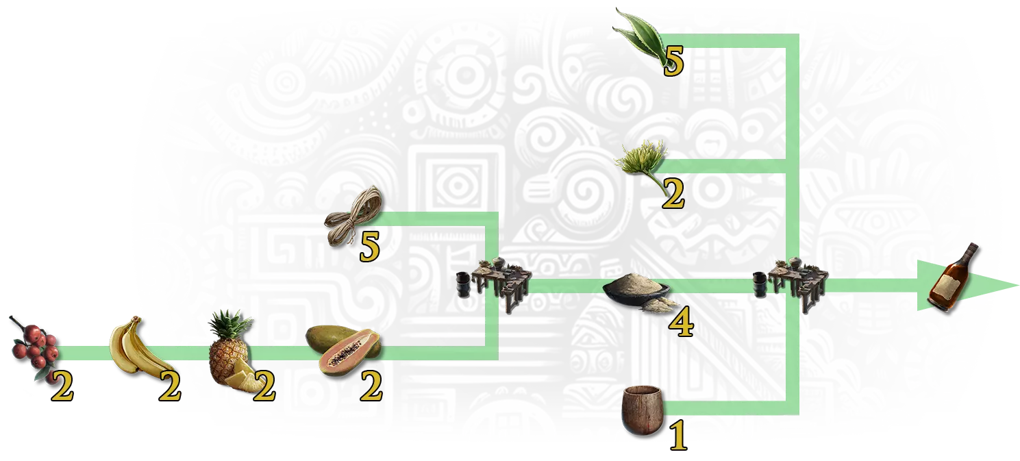 果汁台 - 制作龙舌兰酒以解锁此旅行里程碑。 龙舌兰酒需在酿造台(青铜坑)制作。制作所需材料: 5个龙舌兰叶 - 可在敌对部落的箱子中找到; 2个龙舌兰花 - 可在敌对部落的箱子中找到; 4个酵母 - 可在酿造台制作; 20个纤维; 8个野果,或8个香蕉,或8个菠萝,或8个木瓜; 1个杯子 - 可在敌对部落的箱子中找到。