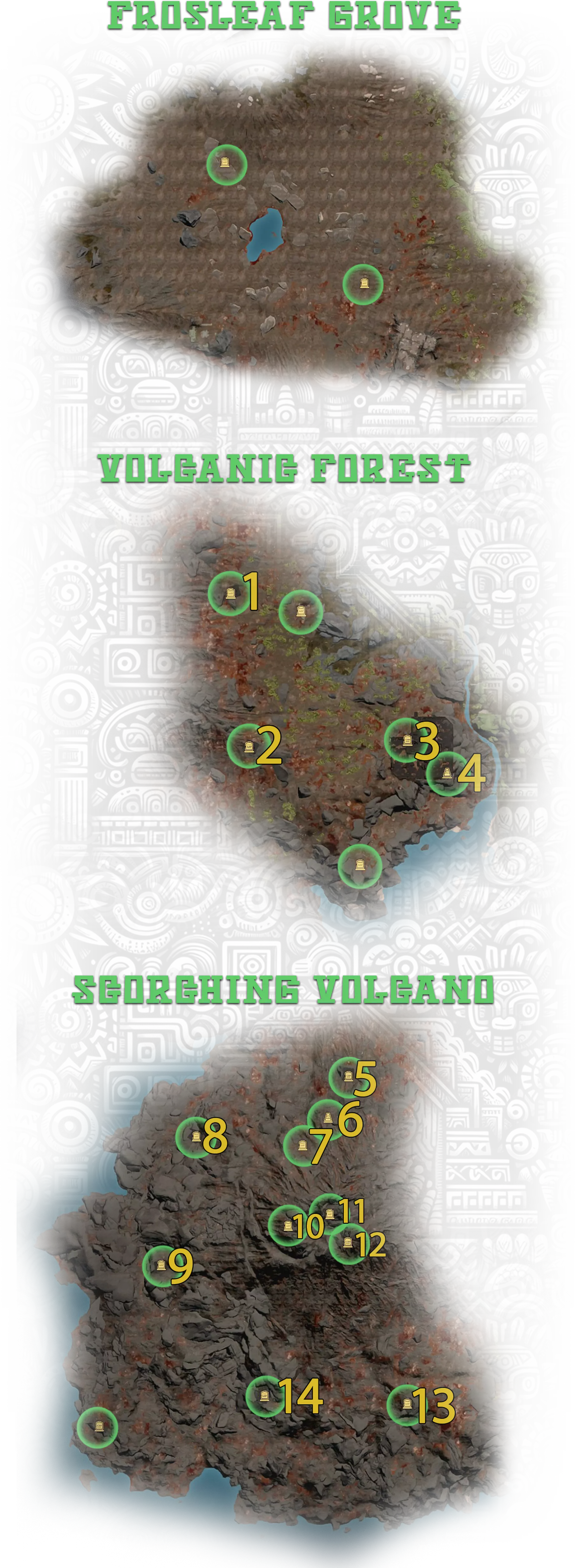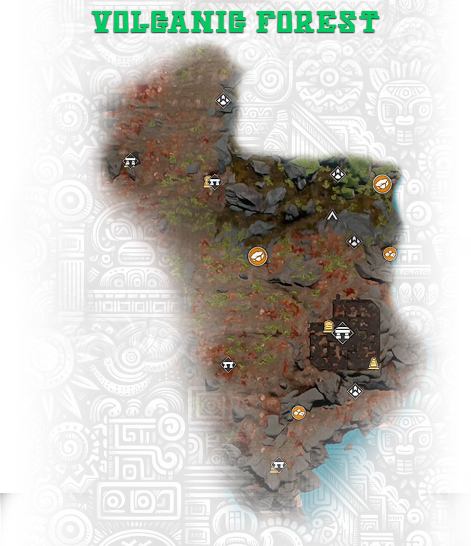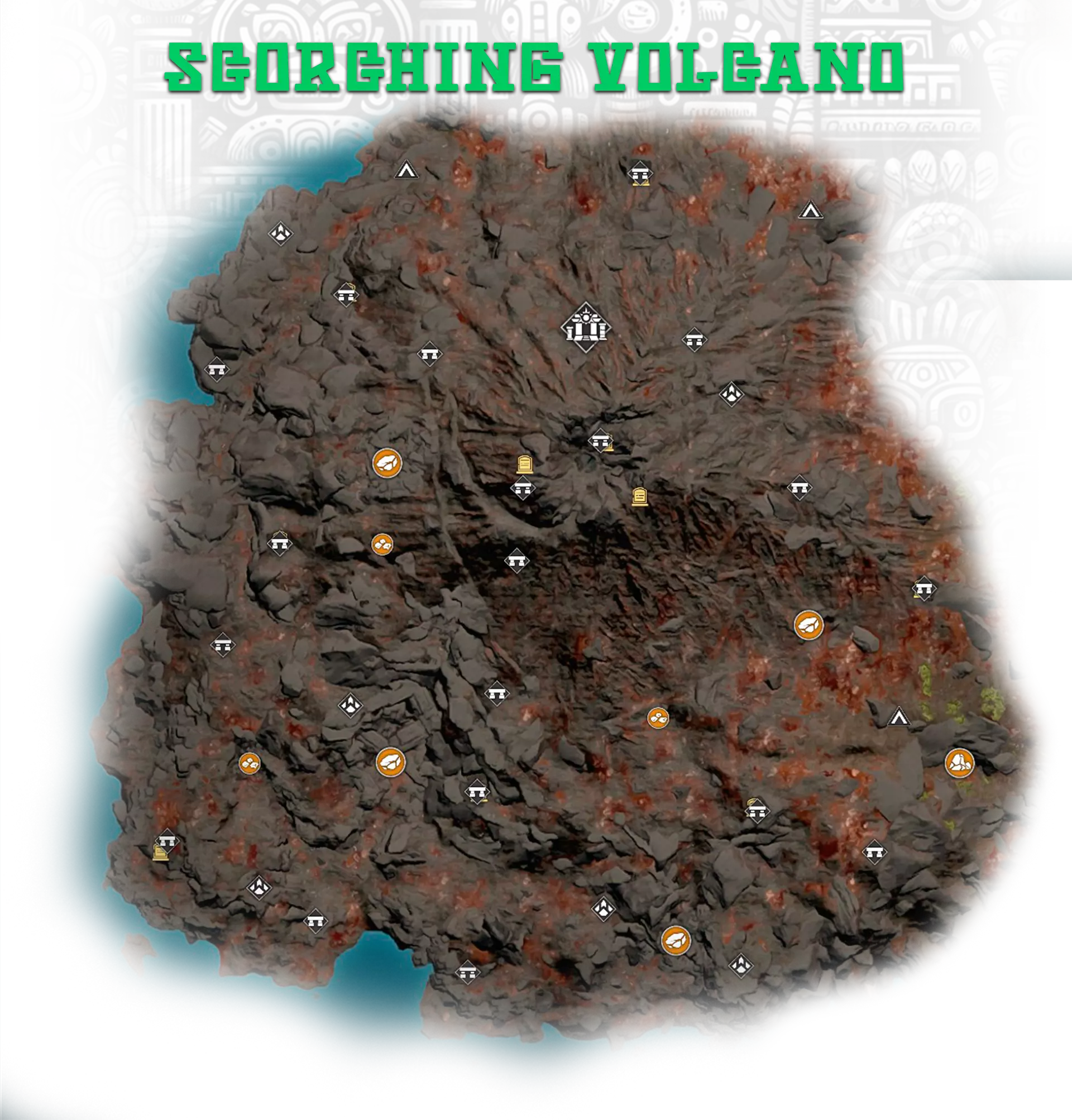 6. 神圣石板 - 位于地下金字塔,【隐藏珍珠:灼热火山】成就; 10. 火山内部的废墟上。