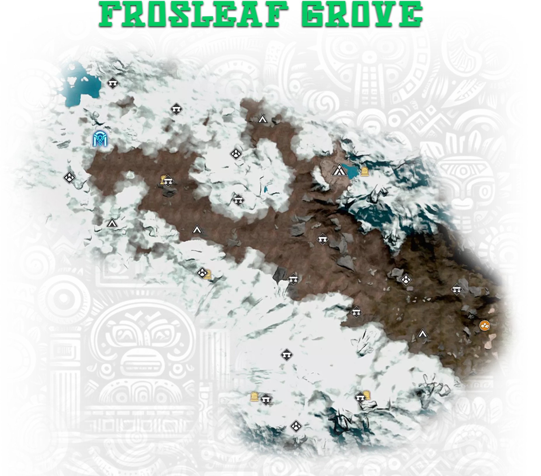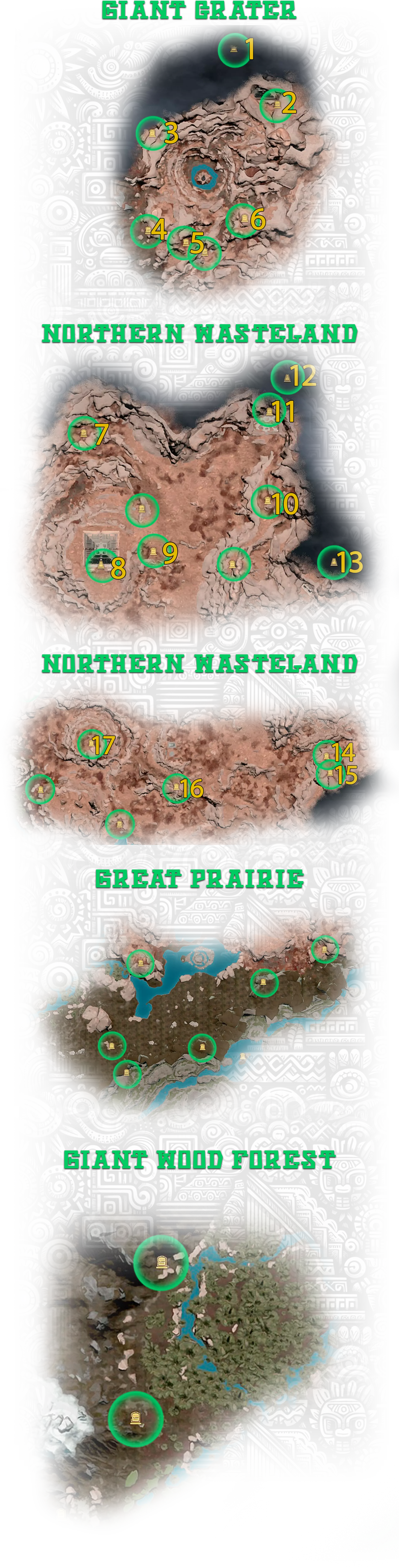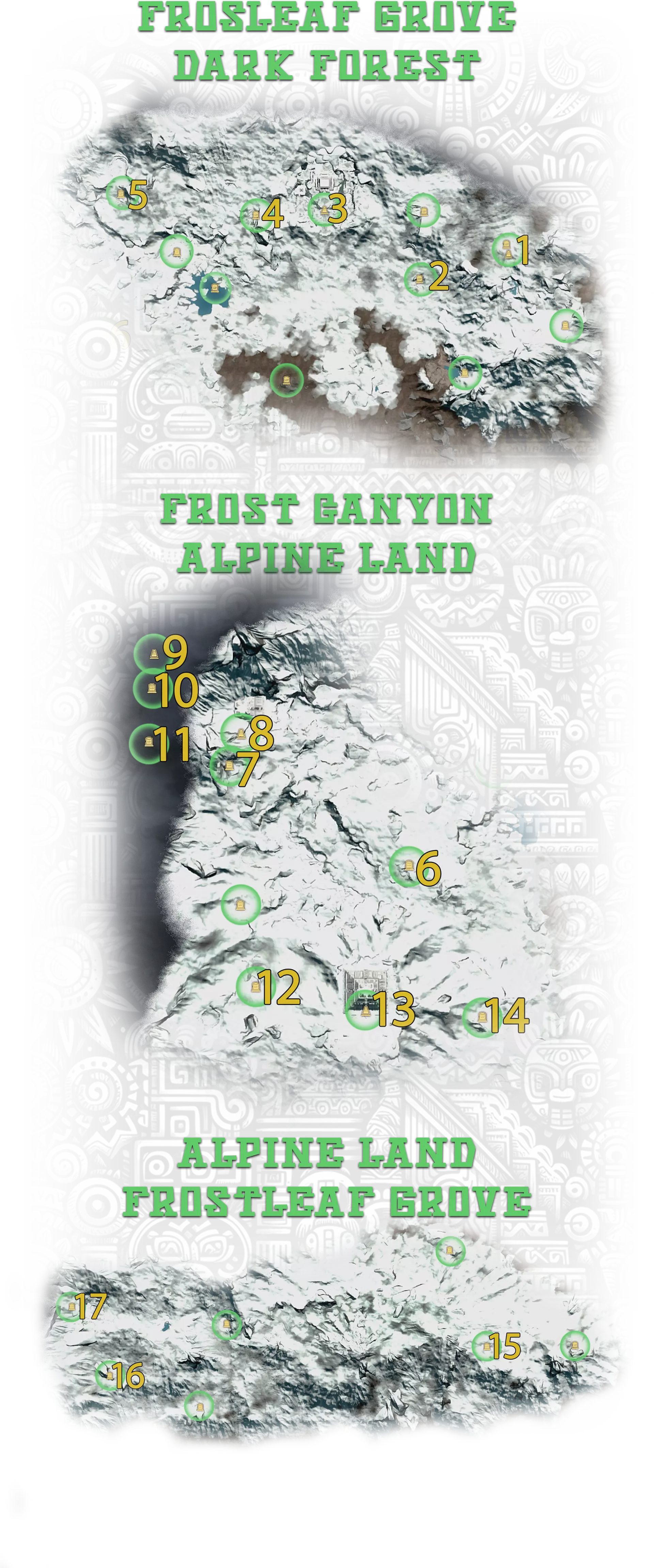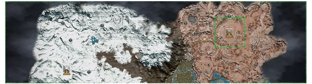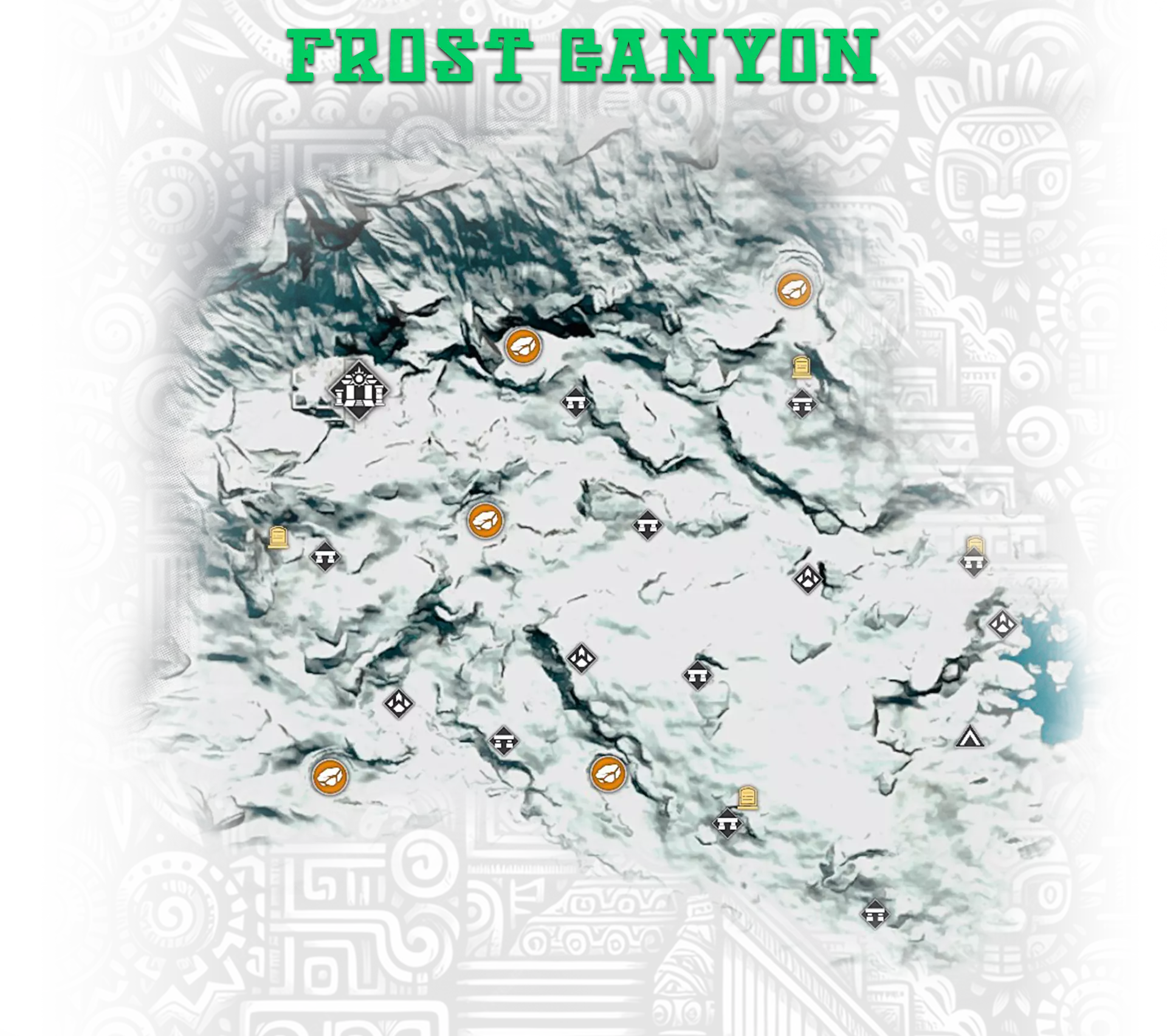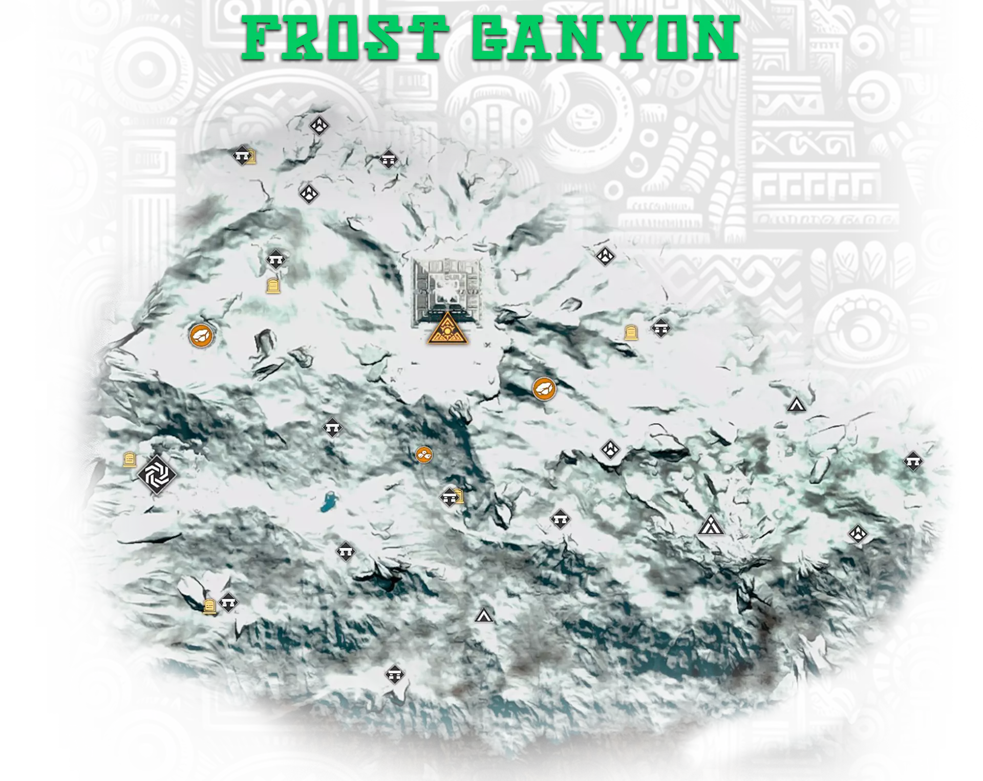 8-11. 地下金字塔,更多信息在【Hidden Pearl: Frost Canyon】成就中; 13. 金字塔正面的神圣石板; 17. 古代地牢,位于地下墓穴的废墟中。