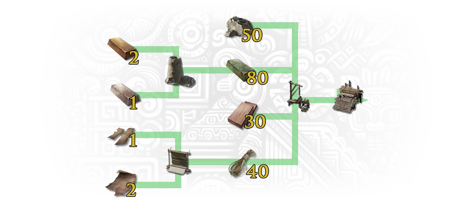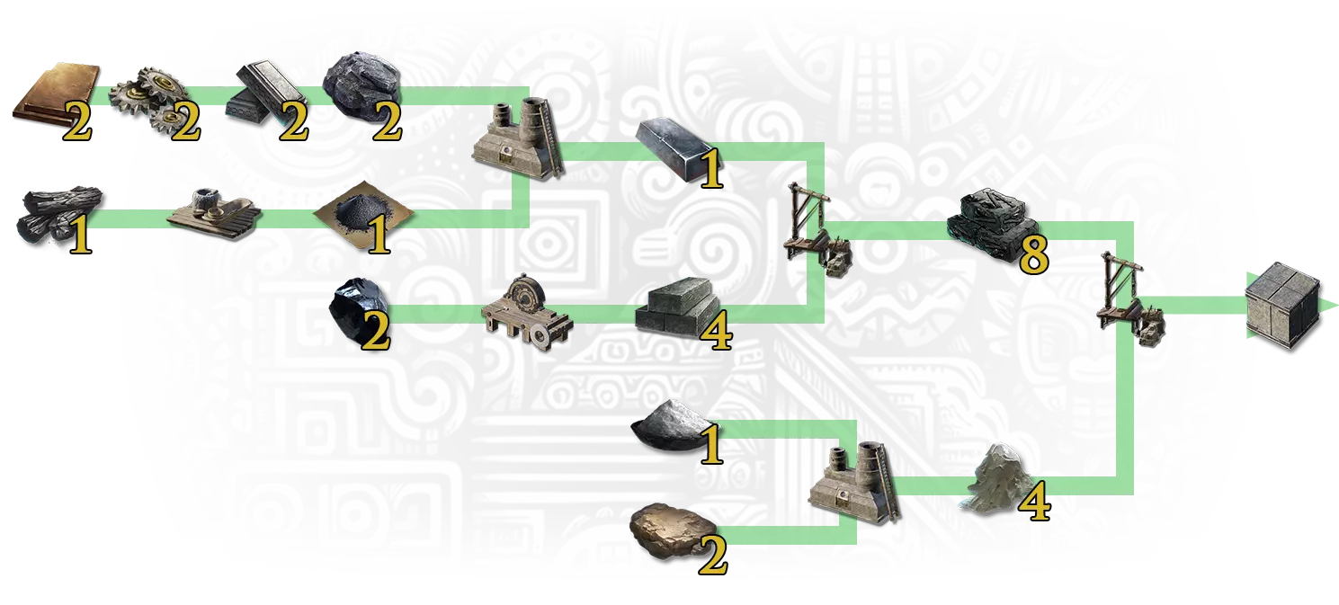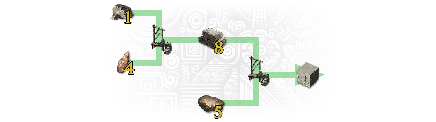 无名堆积大师 - 制作黑石地基以解锁此行程里程碑。 你必须解锁适当的蓝图才能建造伐木场。制作石地基需要以下资源: 8个黑石砖; 32个黑石锭 - 黑石锭由2个黑曜石制作而成。黑曜石可在火山生物群系中开采; 8个铁锭; 8个碳粉 - 1个碳粉由1个木炭在研磨机上制作而成。1个木炭由2个树枝或2个木材在土窑上制作而成; 16个铁矿石,或16个金属块,或16个金属零件或16个金属板; 4个灰泥; 4个石灰 - 1个石灰由2个石头在土窑上制作而成; 8个黏土 - 黏土可在水边(如湖岸等处)或敌对部落的箱子中找到。