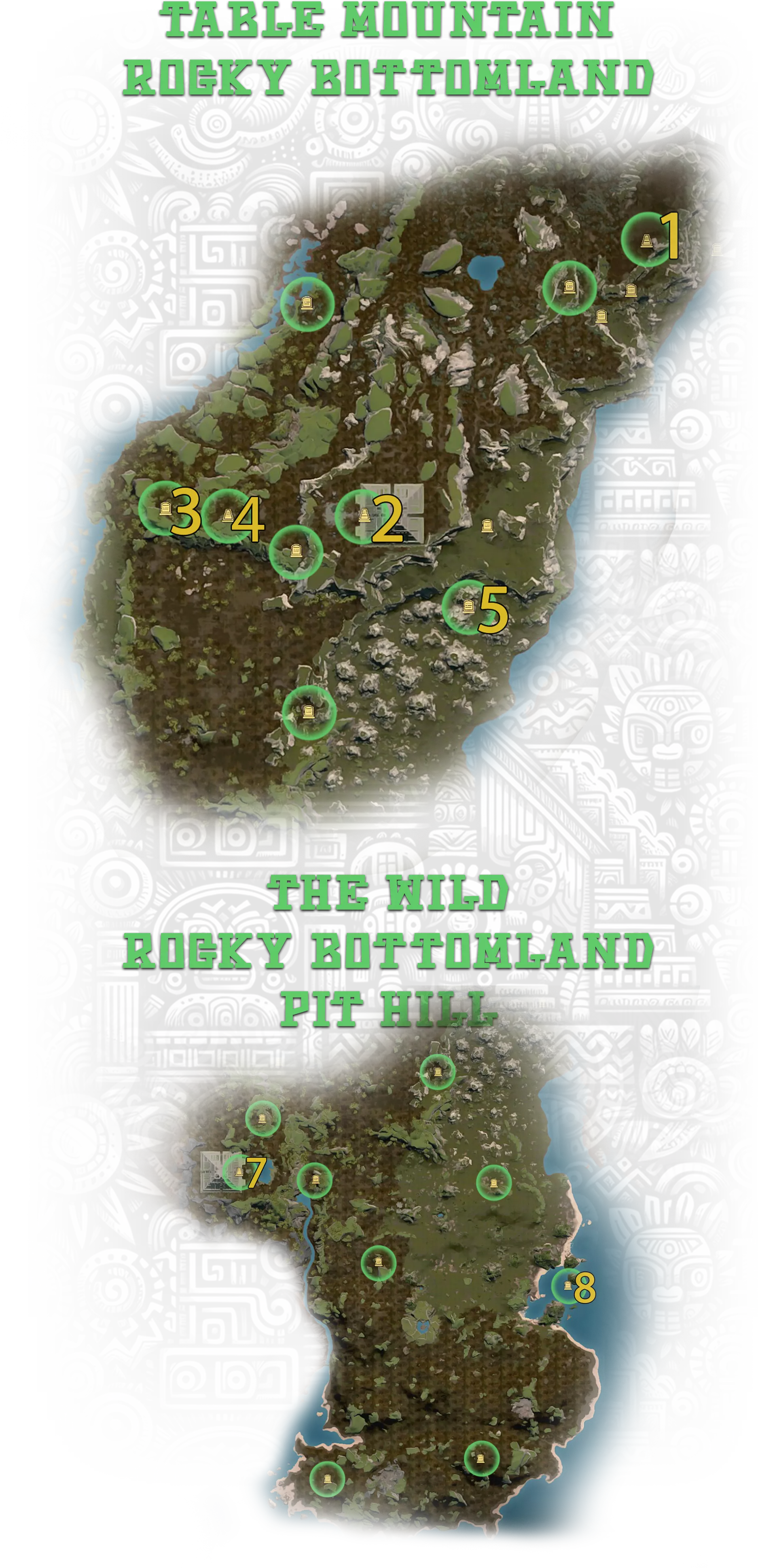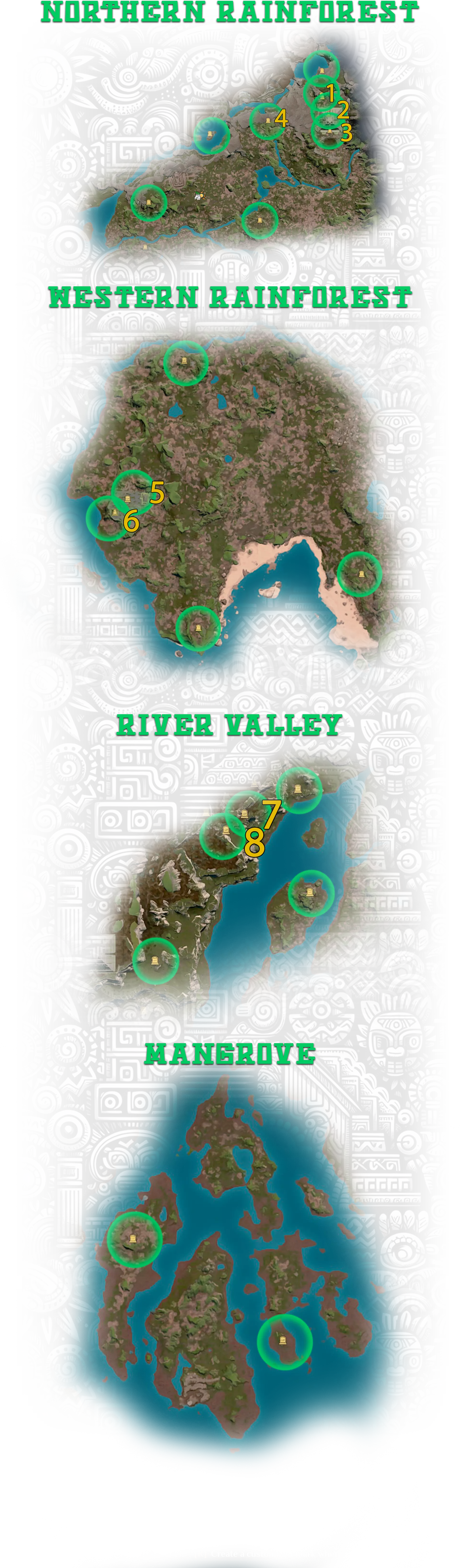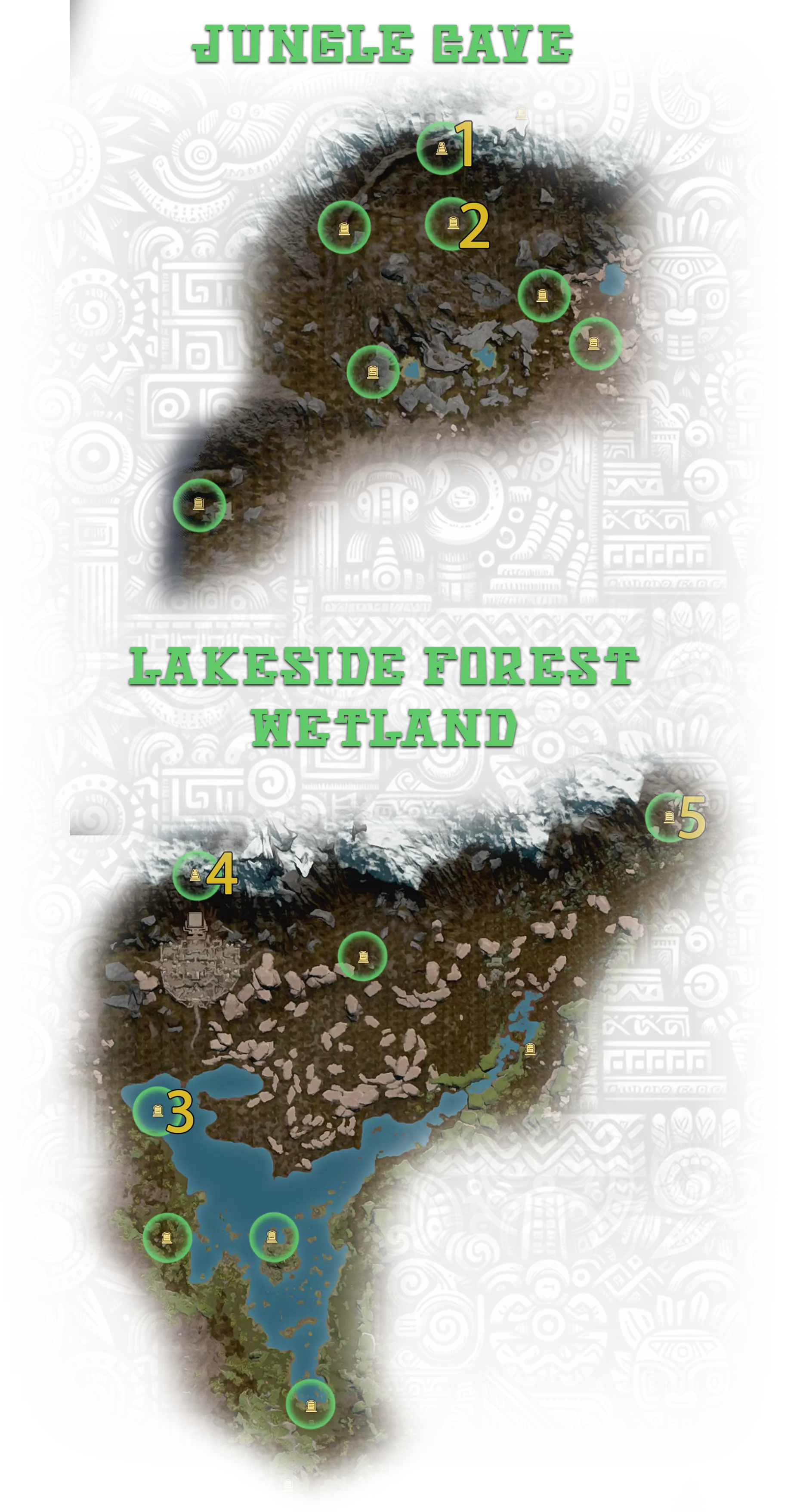 4. 神圣石板 - 位于地下金字塔,对应成就Hidden Pearl: Wetland; 5. 位于地图上未标记的古代遗迹中
