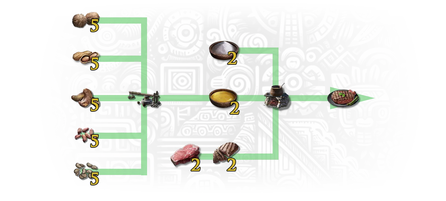 肚子饱饱,心情好好。——烹饪一份高级牛排以解锁此旅行里程碑。 牛排需在烹饪炉上制作。烹饪高级牛排需要: 【2份精制盐】——可在其他部落的箱子中找到; 【2份食用油】——可在其他部落的箱子中找到,或在榨油机(青铜坑)处制作; 【2份优质鲜肉】——从精英鳄鱼身上获得。