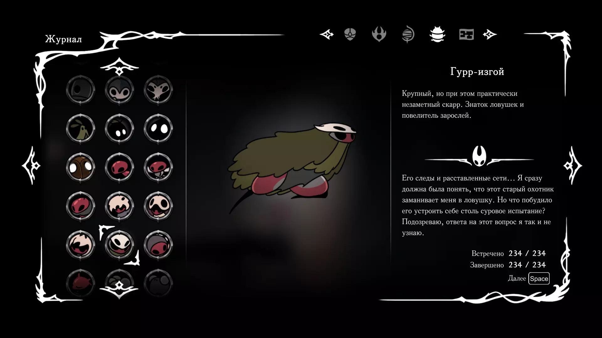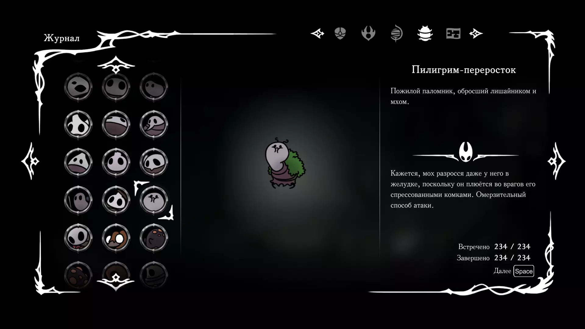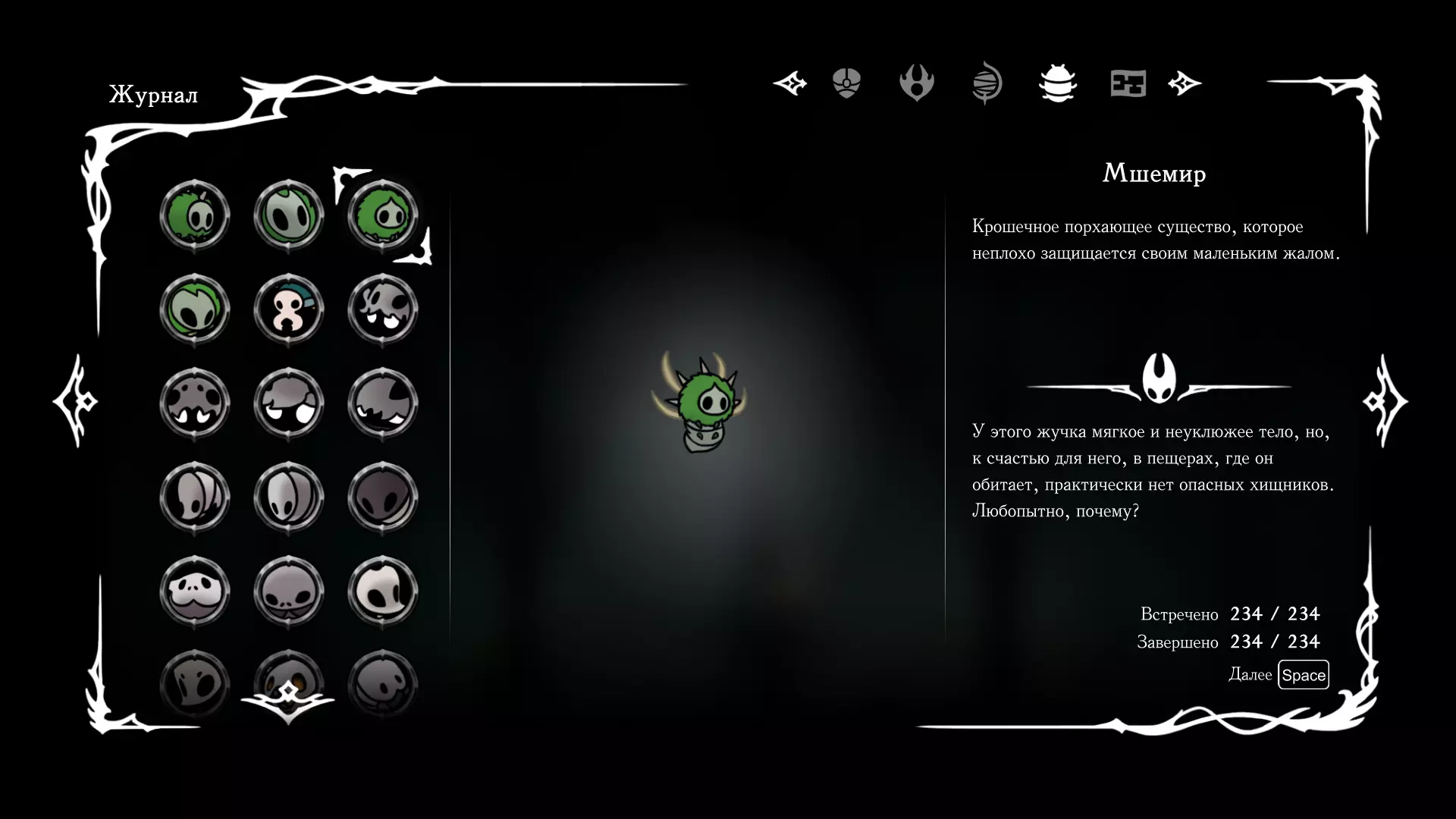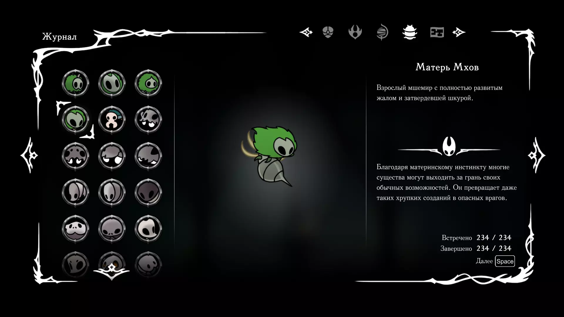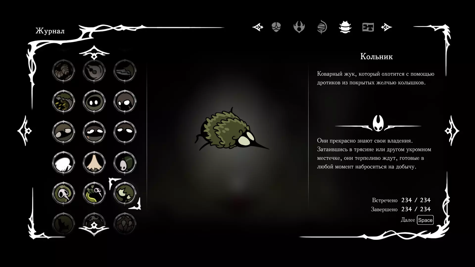 《空洞骑士:丝绸之歌》猎人日志填写指南,包含每个敌人/生物的位置及获取努乌纪念品的方法。信息将持续补充更新。 注意:大多数敌人在进入第三幕后会停止在原有位置刷新。例如,第三幕中水塘生物的生成数量从两三个变为单个。每次为了一个怪物都要跑到长凳那里,这种体验可不太好,所以建议在进入第三幕之前就立即填写日志。可以按下Ctrl+F键,输入你需要的怪物名称来查找。【沙克菈和加蒙德并非日志必需怪物】! 【回忆中的怪物,只要你击败了回忆中的首领(例如韦尔丹尼亚),就会自动记录到日志中】!如果找不到某个怪物,可以在评论区留言。我为这份指南花费了大量时间。【苔藓洞穴】