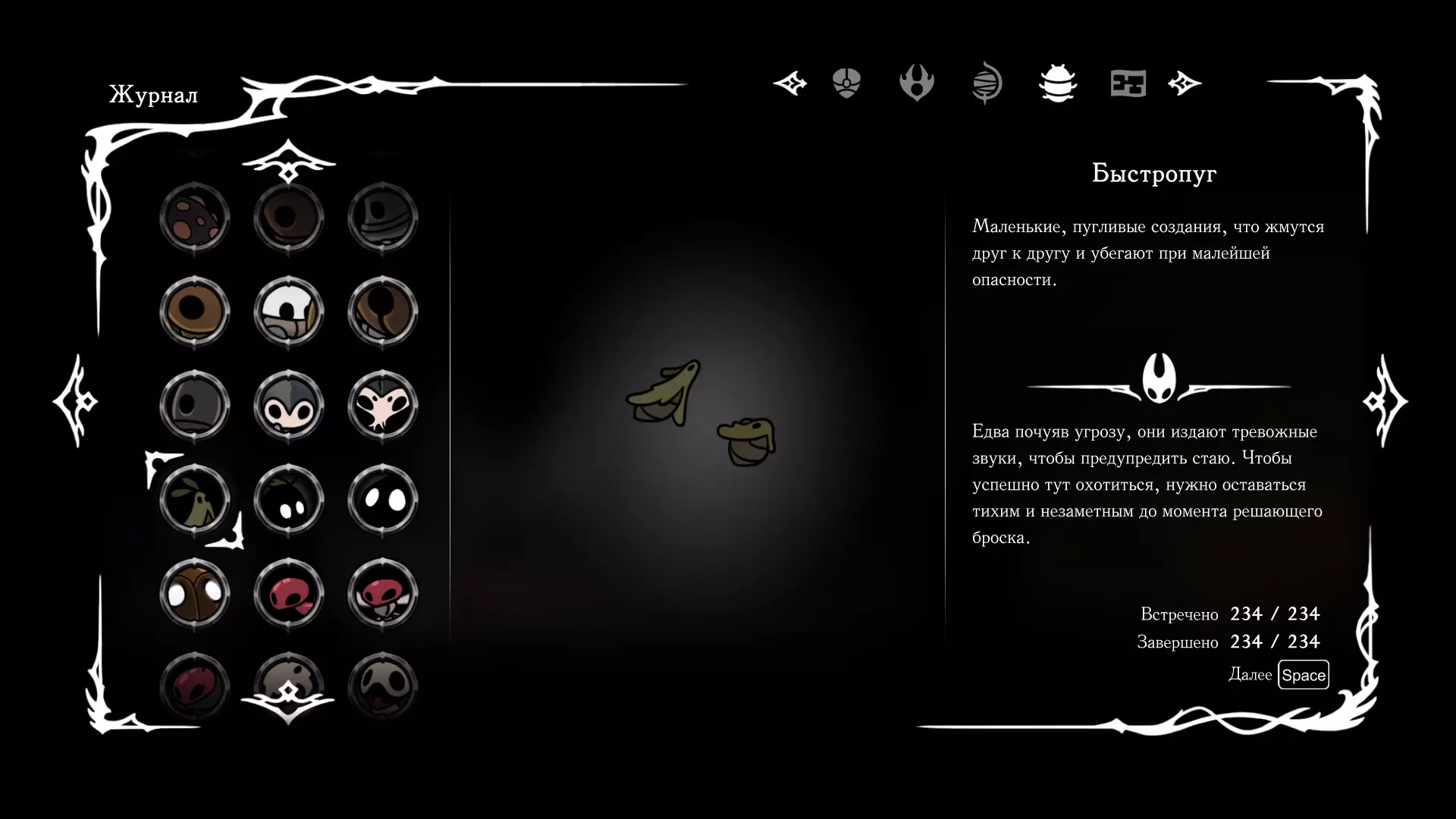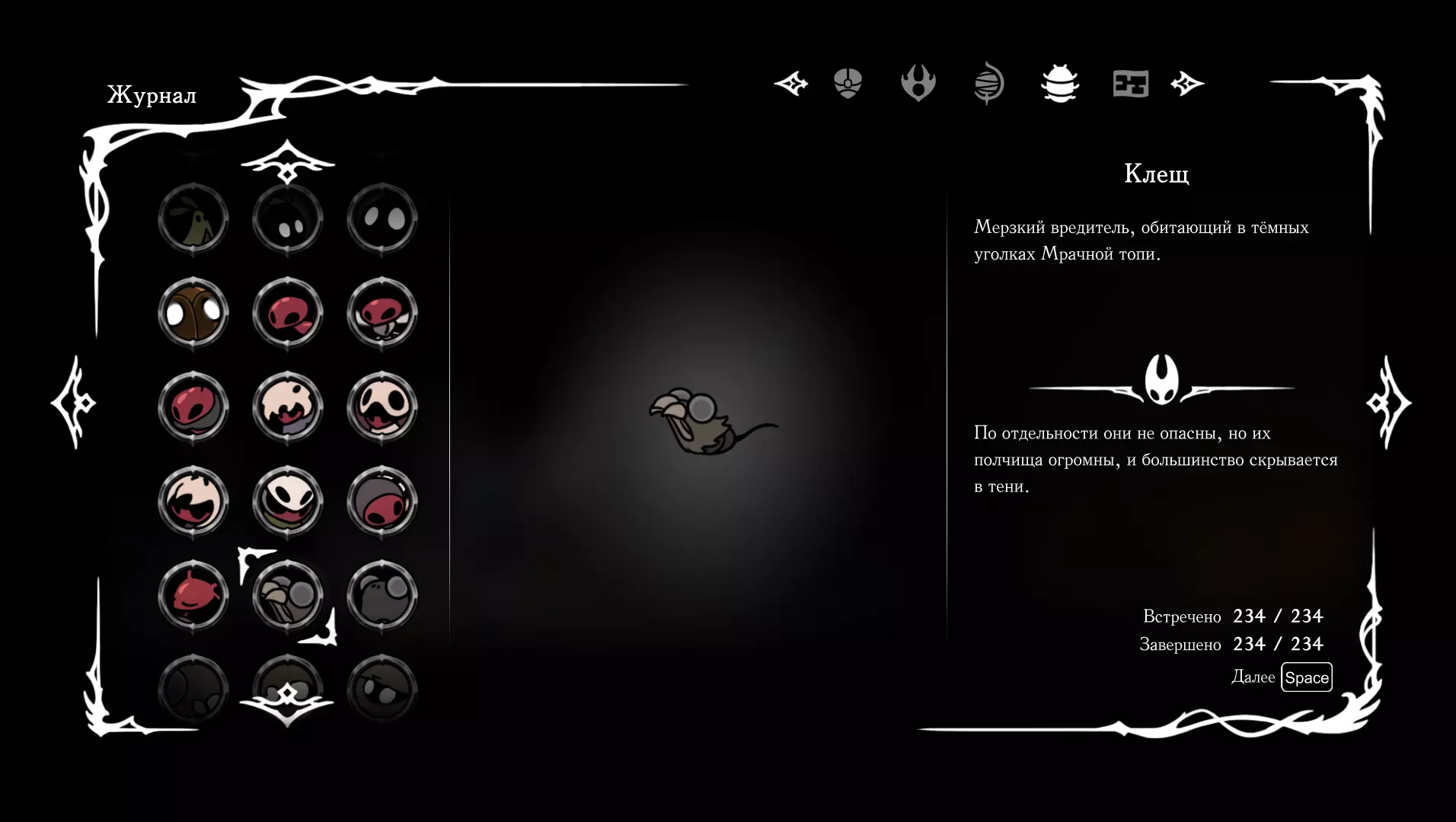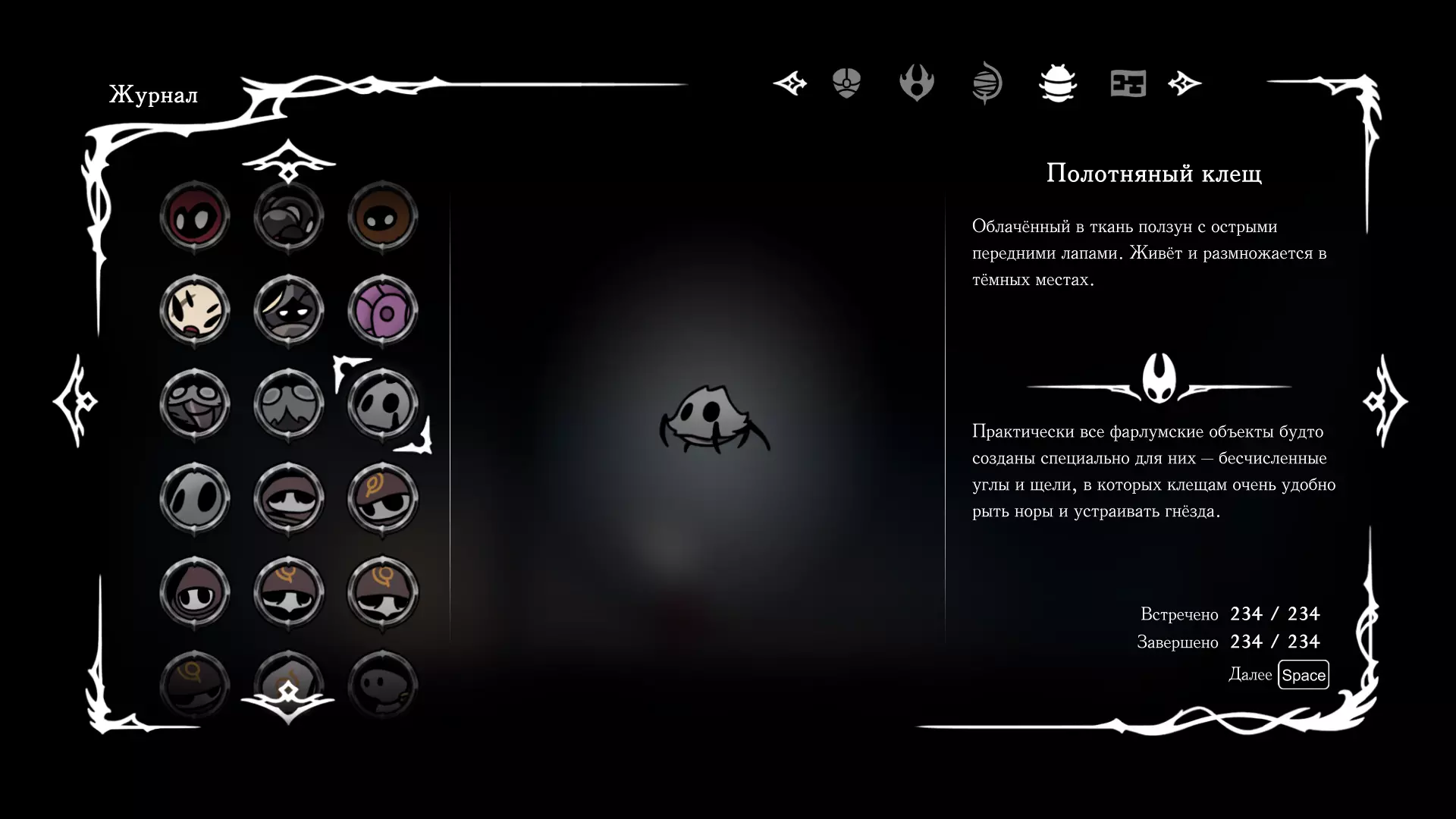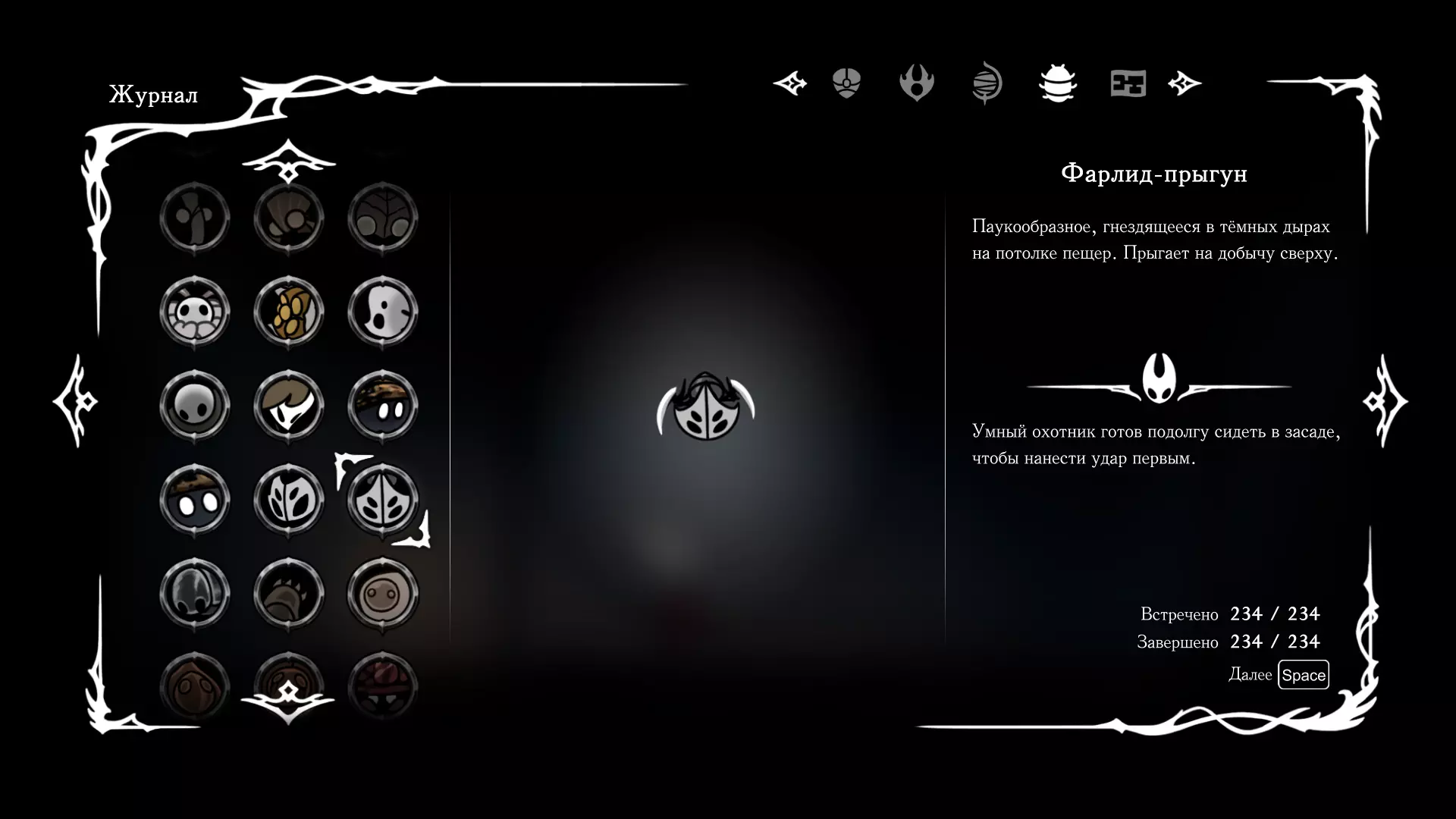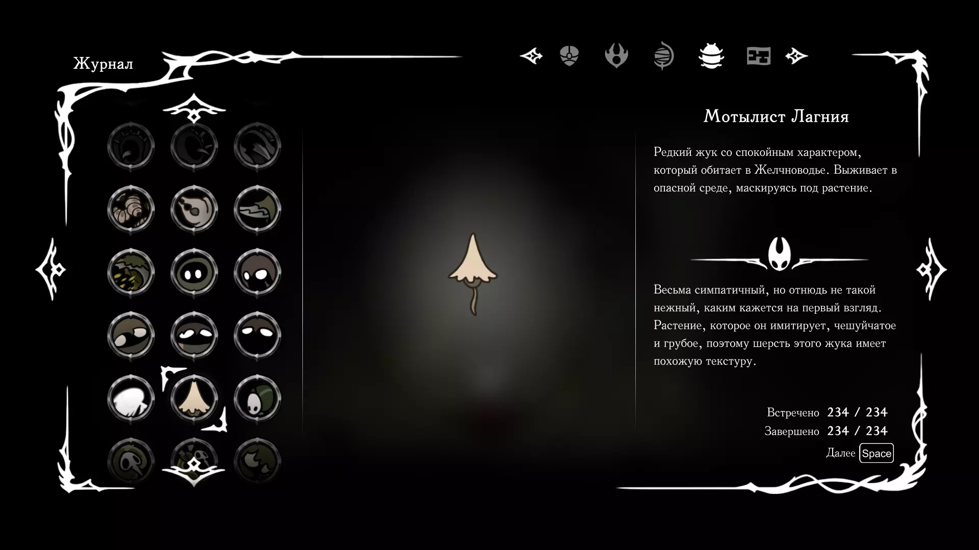 《空洞骑士:丝绸之歌》猎人日志填写指南,包含每个敌人/生物的位置及获取努乌纪念品的方法。信息将持续补充更新。 注意:大多数敌人在进入第三幕后会停止在原有位置刷新。例如,第三幕中水塘生物的生成数量从两三个变为单个。每次为了一个怪物都要跑到长凳那里,这种体验可不太好,所以建议在进入第三幕之前就立即填写日志。可以按下Ctrl+F键,输入你需要的怪物名称来查找。【沙克菈和加蒙德并非日志必需怪物】! 【回忆中的怪物,只要你击败了回忆中的首领(例如韦尔丹尼亚),就会自动记录到日志中】!如果找不到某个怪物,可以在评论区留言。我为这份指南花费了大量时间。【苔藓洞穴】