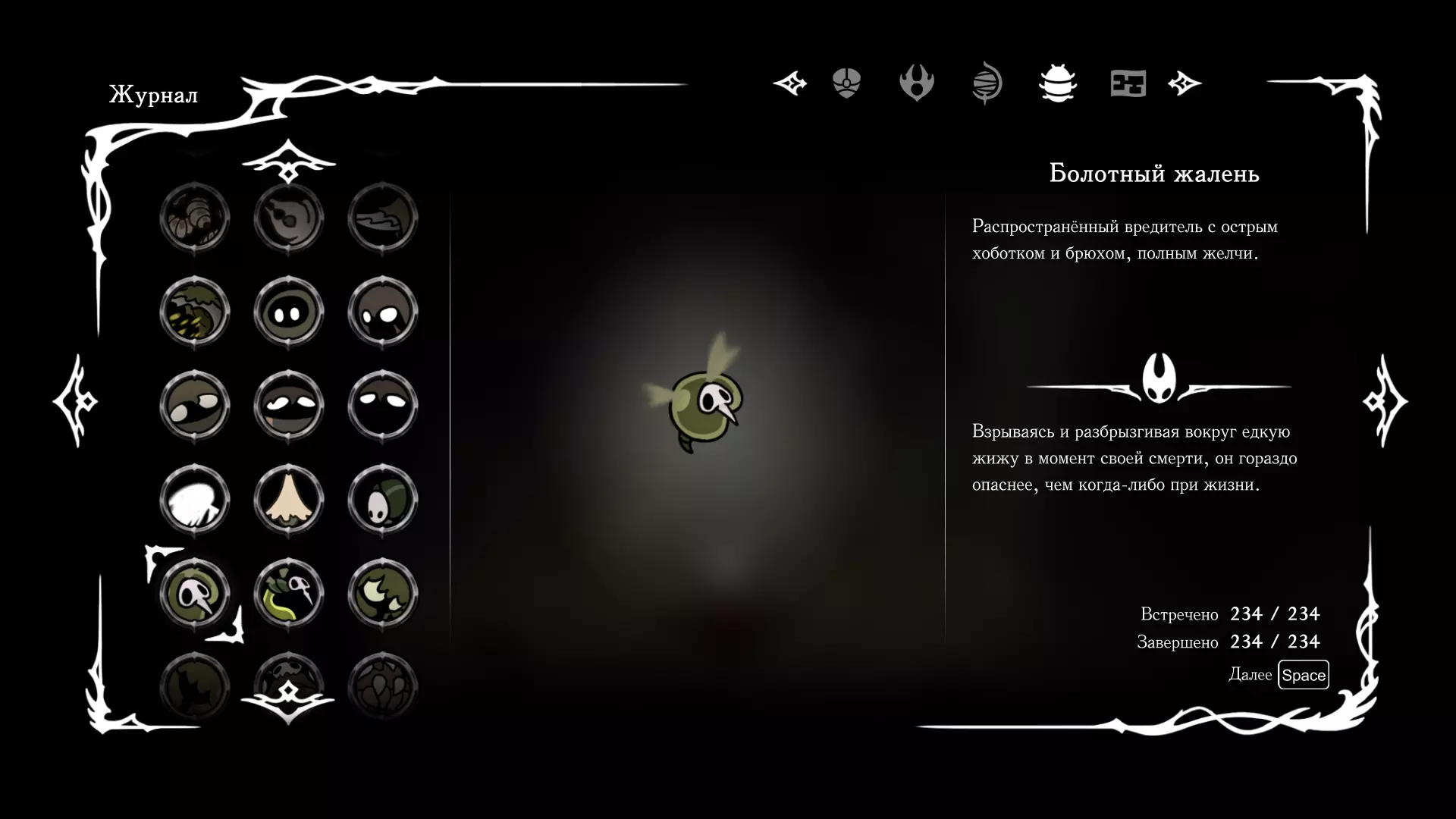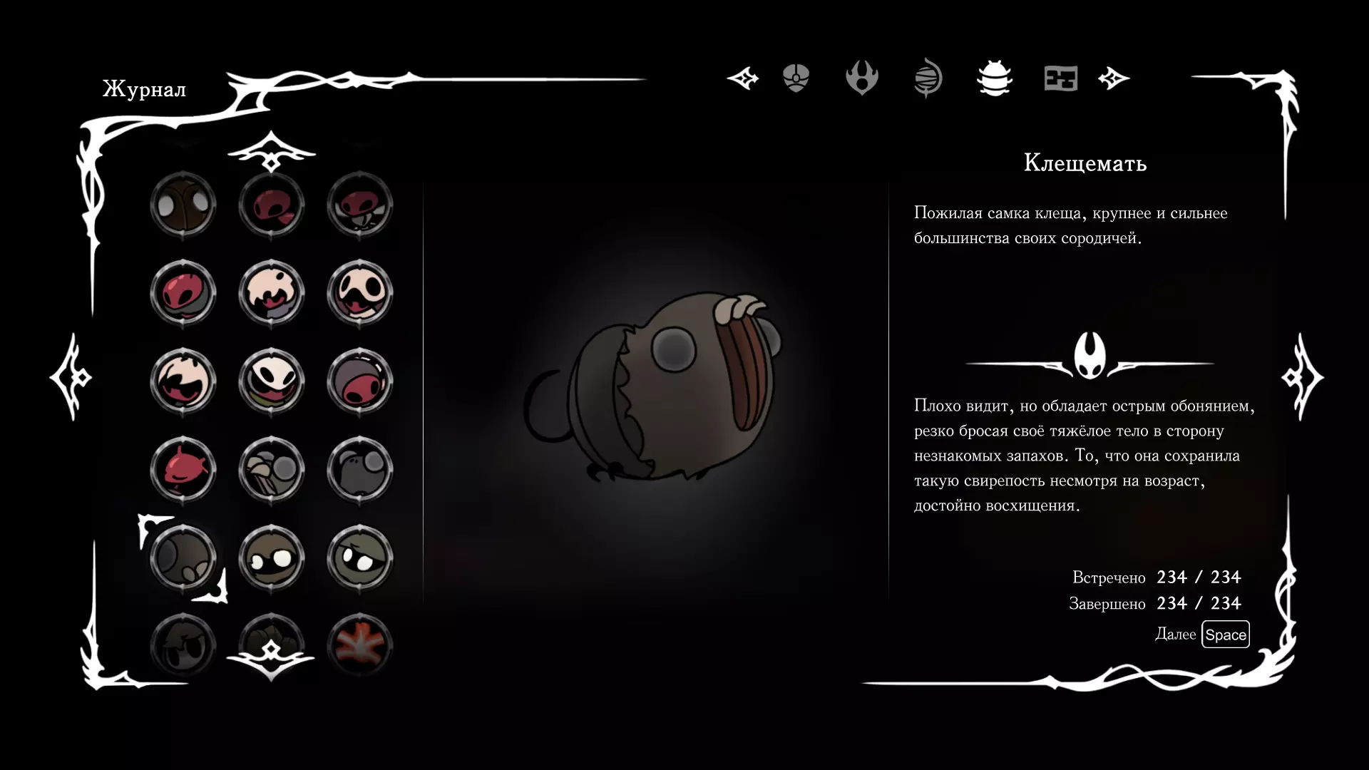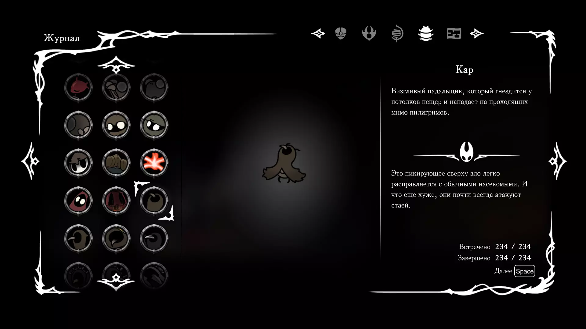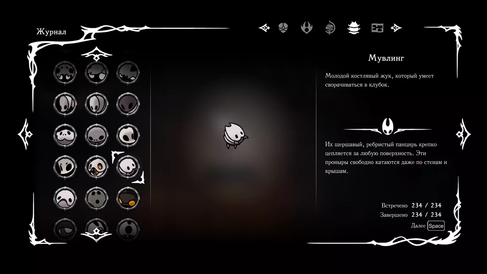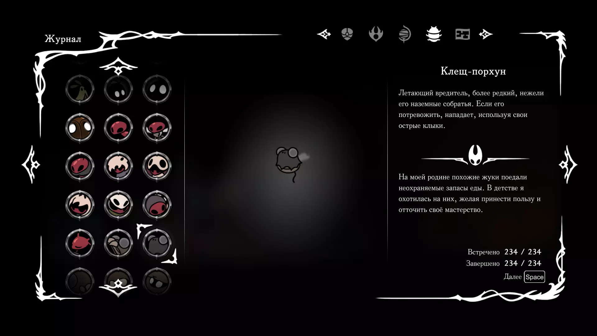 《空洞骑士:丝绸之歌》猎人日志填写指南,包含每个敌人/生物的位置及获取努乌纪念品的方法。信息将持续补充更新。 注意:大多数敌人在进入第三幕后会停止在原有位置刷新。例如,第三幕中水塘生物的生成数量从两三个变为单个。每次为了一个怪物都要跑到长凳那里,这种体验可不太好,所以建议在进入第三幕之前就立即填写日志。可以按下Ctrl+F键,输入你需要的怪物名称来查找。【沙克菈和加蒙德并非日志必需怪物】! 【回忆中的怪物,只要你击败了回忆中的首领(例如韦尔丹尼亚),就会自动记录到日志中】!如果找不到某个怪物,可以在评论区留言。我为这份指南花费了大量时间。【苔藓洞穴】