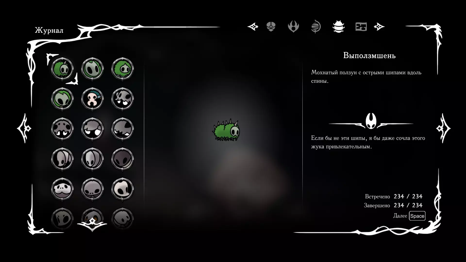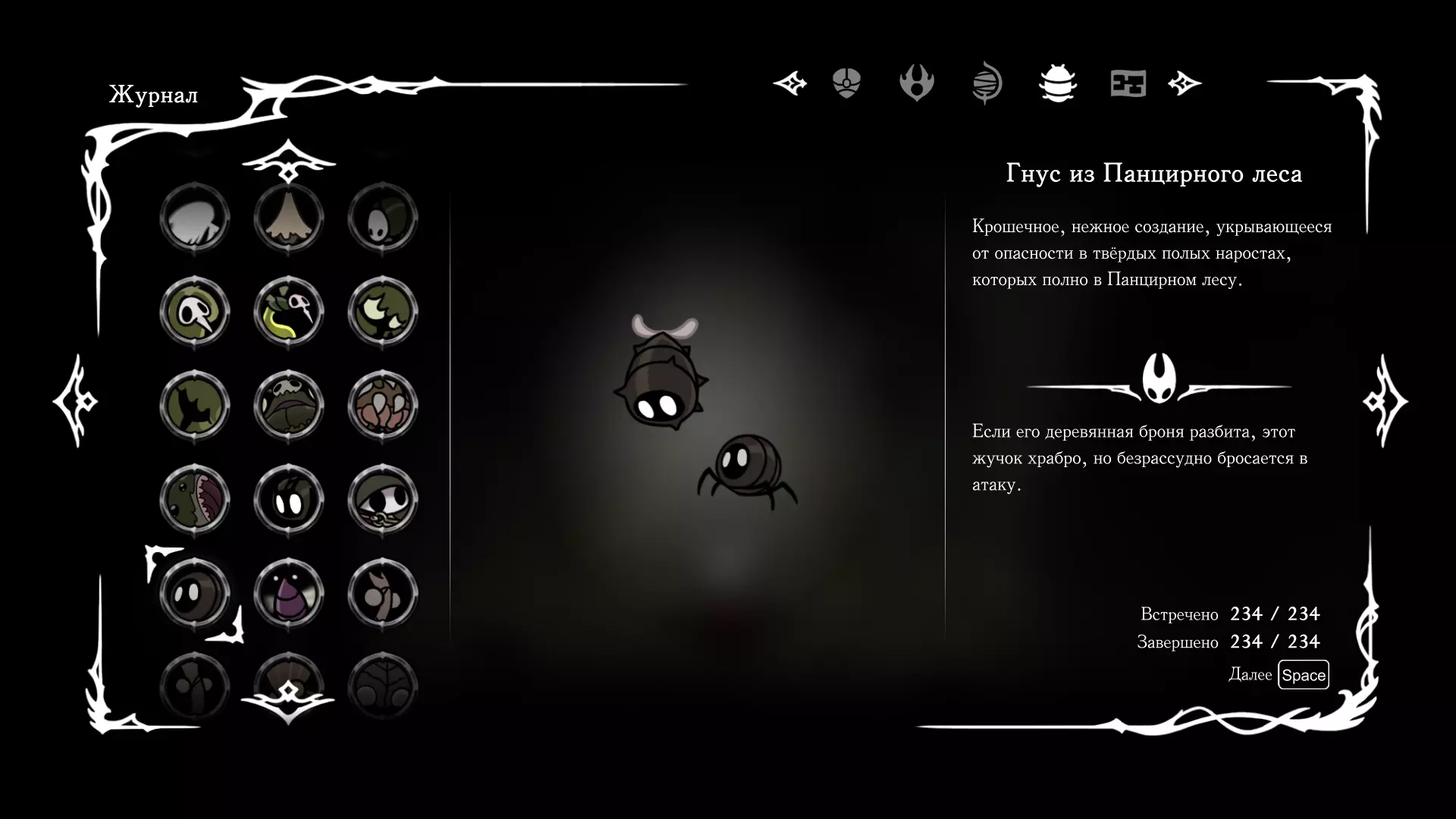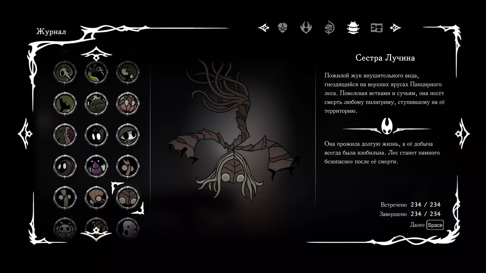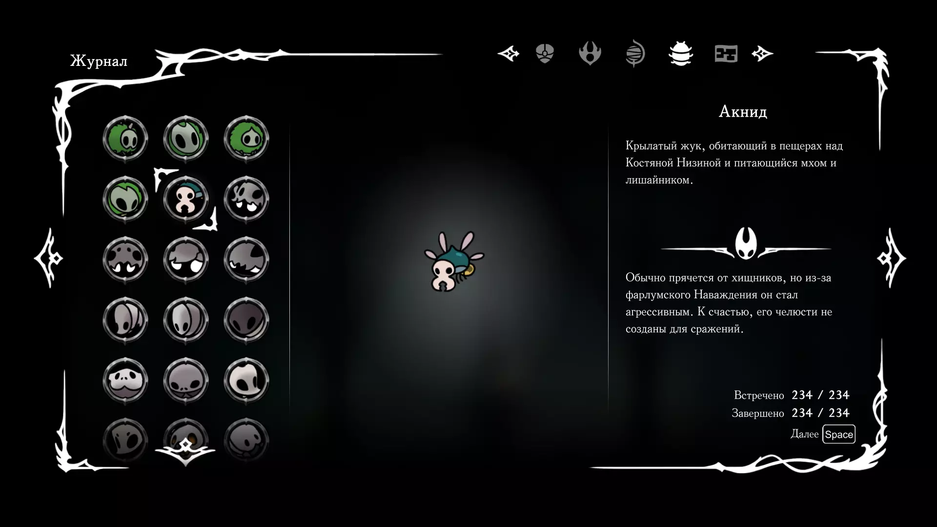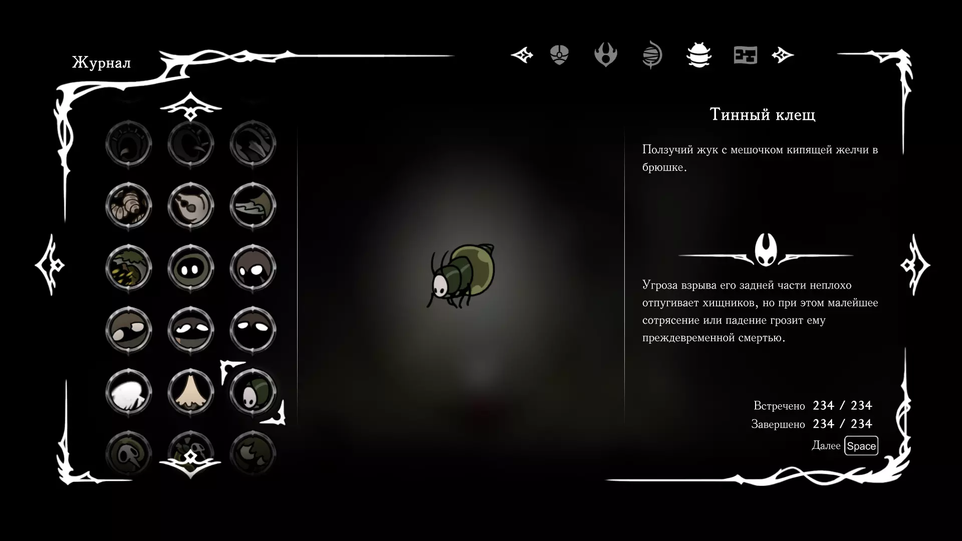 《空洞骑士:丝绸之歌》猎人日志填写指南,包含每个敌人/生物的位置及获取努乌纪念品的方法。信息将持续补充更新。 注意:大多数敌人在进入第三幕后会停止在原有位置刷新。例如,第三幕中水塘生物的生成数量从两三个变为单个。每次为了一个怪物都要跑到长凳那里,这种体验可不太好,所以建议在进入第三幕之前就立即填写日志。可以按下Ctrl+F键,输入你需要的怪物名称来查找。【沙克菈和加蒙德并非日志必需怪物】! 【回忆中的怪物,只要你击败了回忆中的首领(例如韦尔丹尼亚),就会自动记录到日志中】!如果找不到某个怪物,可以在评论区留言。我为这份指南花费了大量时间。【苔藓洞穴】