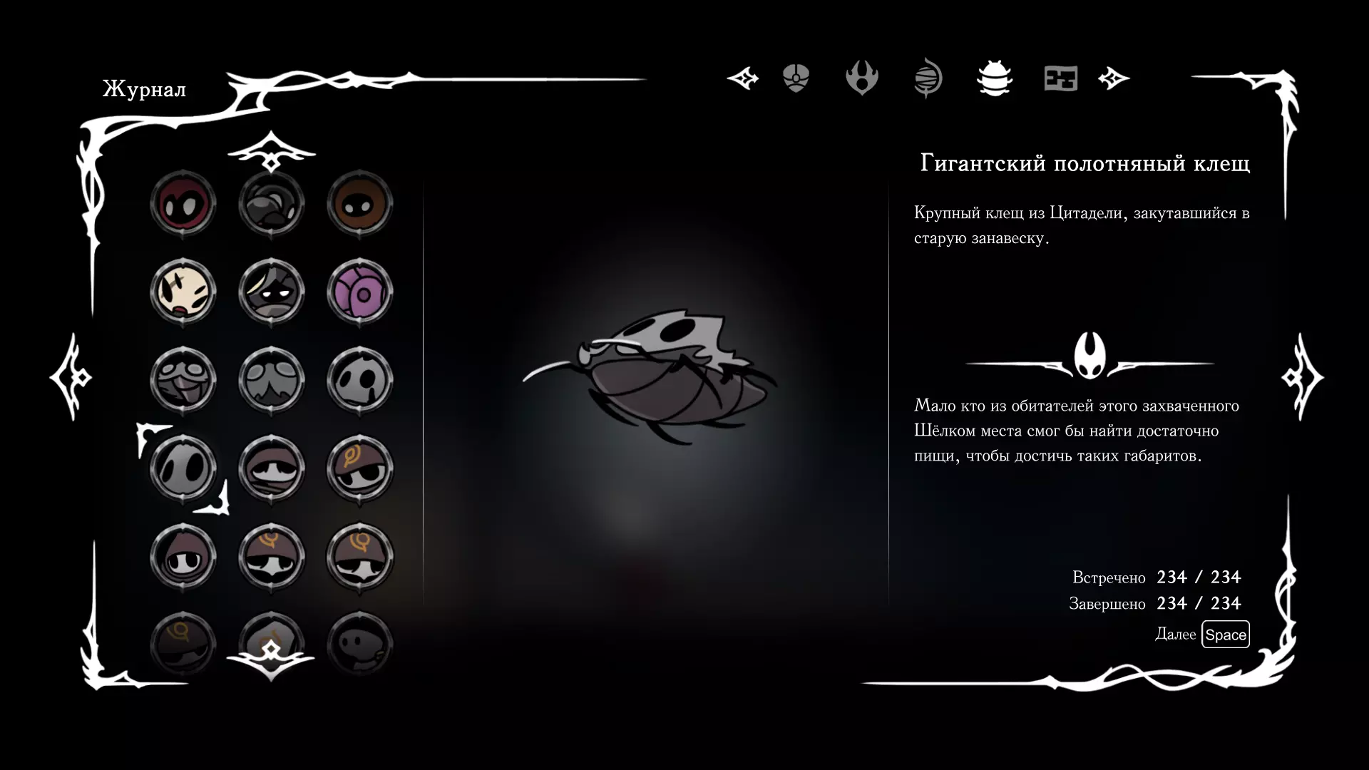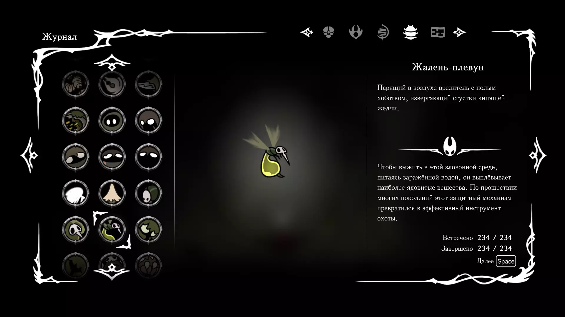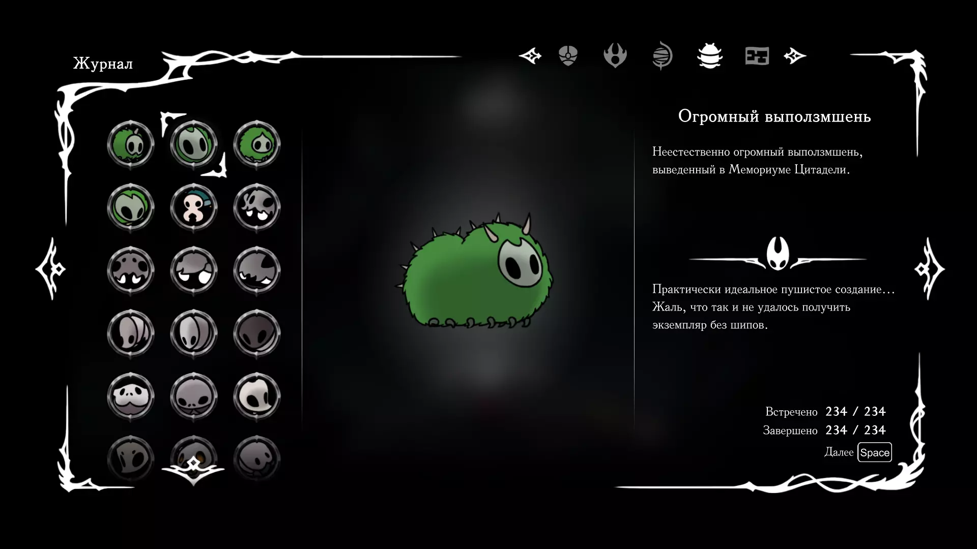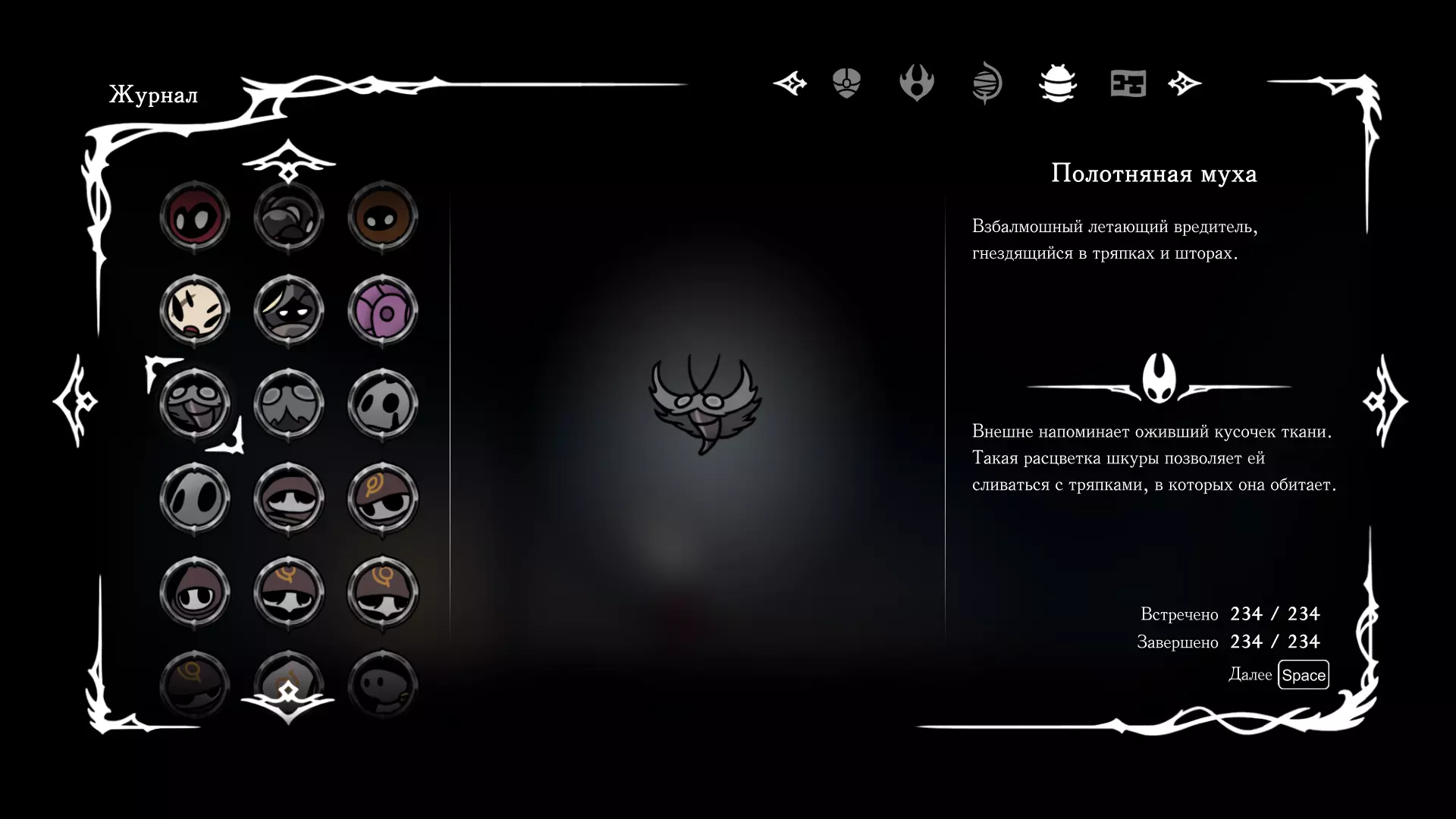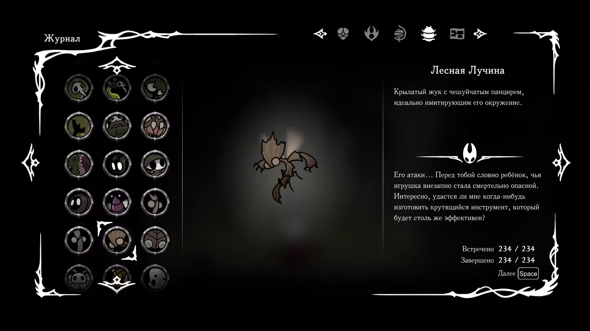 《空洞骑士:丝绸之歌》猎人日志填写指南,包含每个敌人/生物的位置及获取努乌纪念品的方法。信息将持续补充更新。 注意:大多数敌人在进入第三幕后会停止在原有位置刷新。例如,第三幕中水塘生物的生成数量从两三个变为单个。每次为了一个怪物都要跑到长凳那里,这种体验可不太好,所以建议在进入第三幕之前就立即填写日志。可以按下Ctrl+F键,输入你需要的怪物名称来查找。【沙克菈和加蒙德并非日志必需怪物】! 【回忆中的怪物,只要你击败了回忆中的首领(例如韦尔丹尼亚),就会自动记录到日志中】!如果找不到某个怪物,可以在评论区留言。我为这份指南花费了大量时间。【苔藓洞穴】