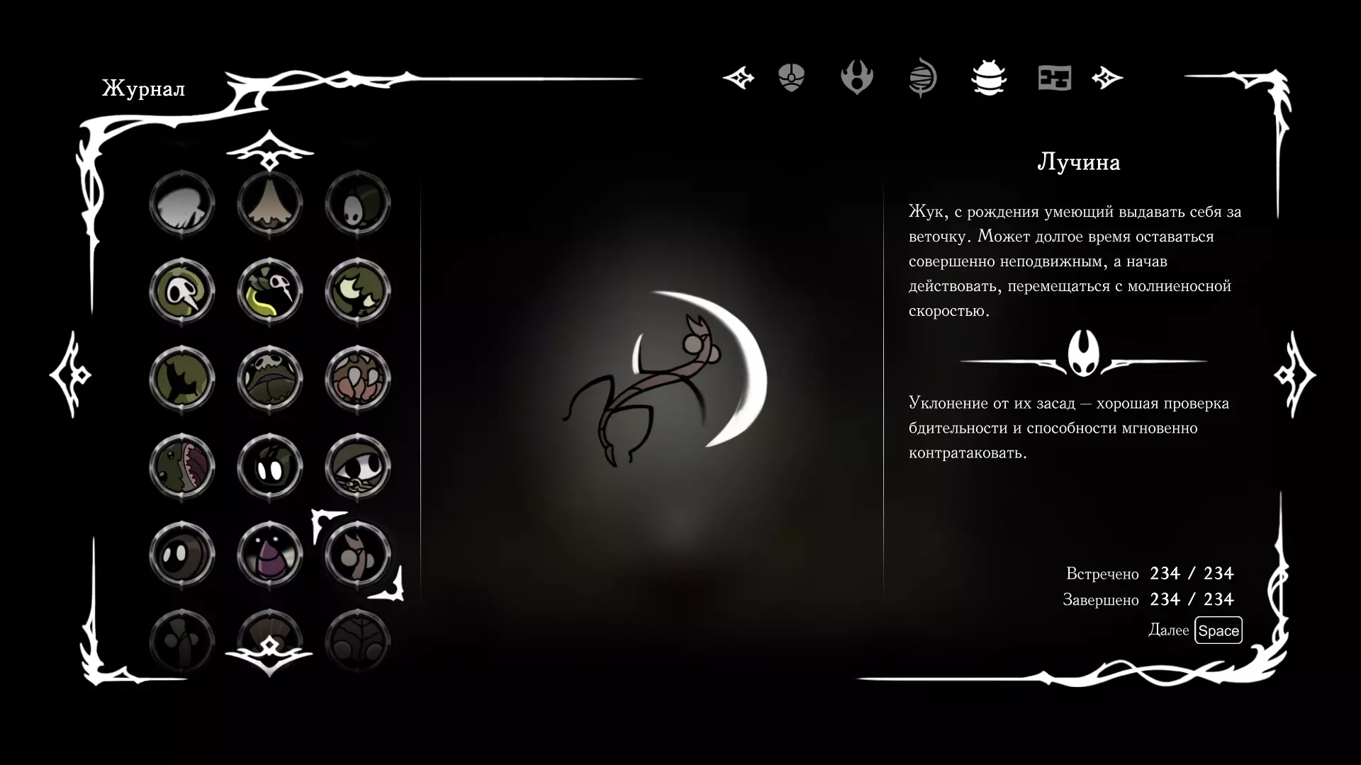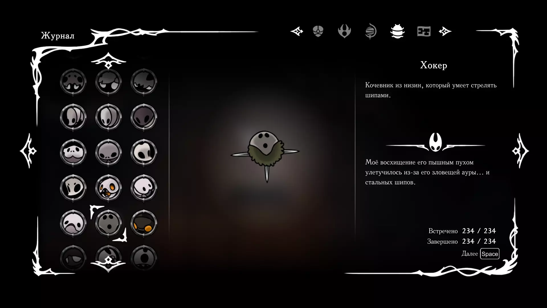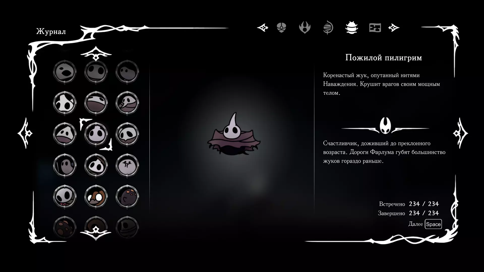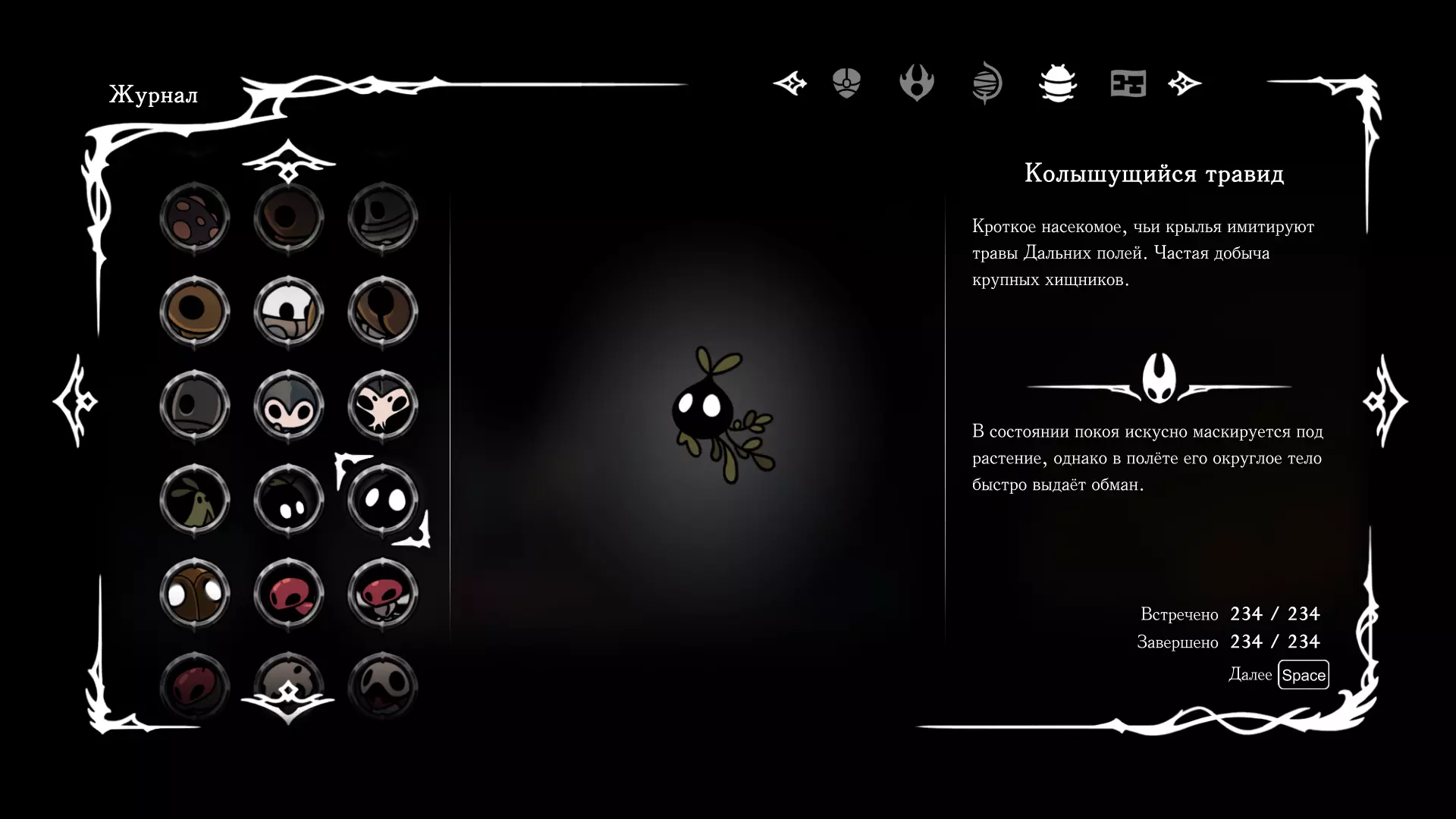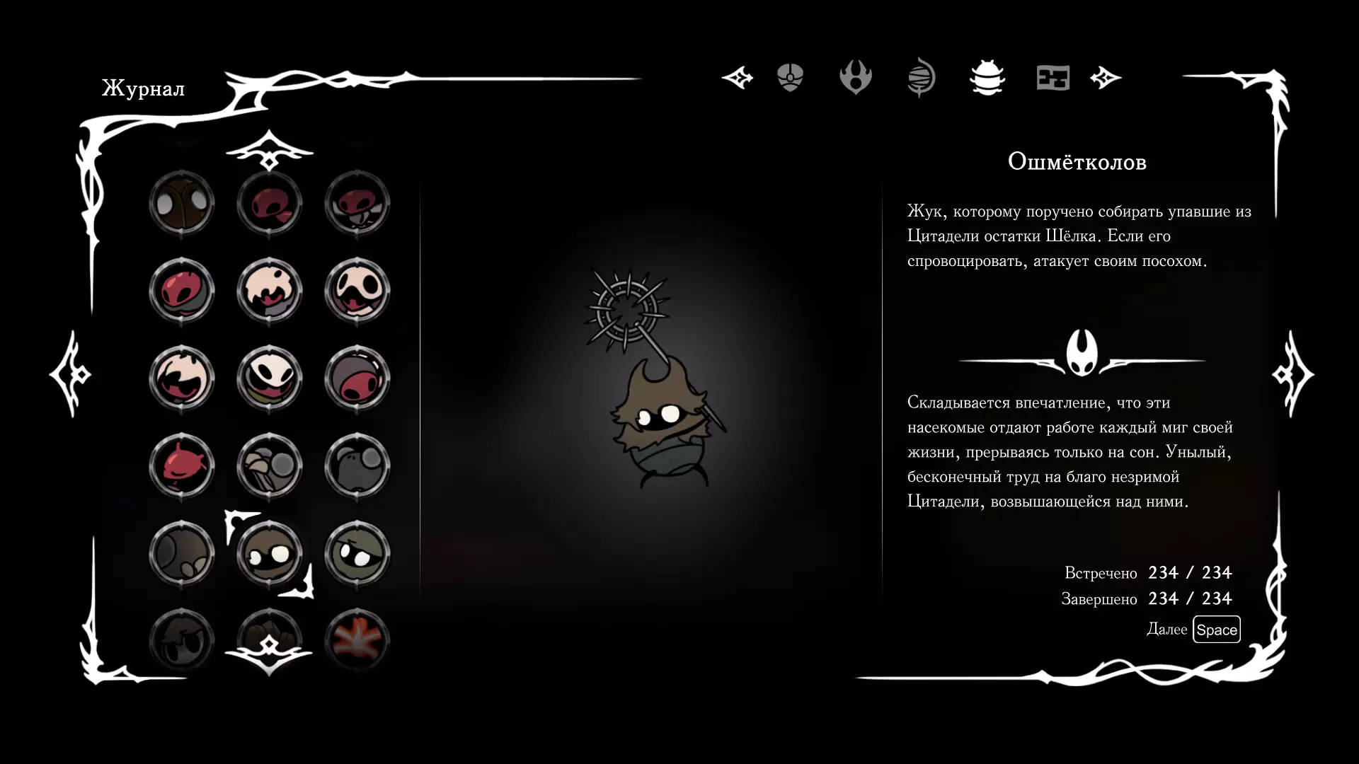 《空洞骑士:丝绸之歌》猎人日志填写指南,包含每个敌人/生物的位置及获取努乌纪念品的方法。信息将持续补充更新。 注意:大多数敌人在进入第三幕后会停止在原有位置刷新。例如,第三幕中水塘生物的生成数量从两三个变为单个。每次为了一个怪物都要跑到长凳那里,这种体验可不太好,所以建议在进入第三幕之前就立即填写日志。可以按下Ctrl+F键,输入你需要的怪物名称来查找。【沙克菈和加蒙德并非日志必需怪物】! 【回忆中的怪物,只要你击败了回忆中的首领(例如韦尔丹尼亚),就会自动记录到日志中】!如果找不到某个怪物,可以在评论区留言。我为这份指南花费了大量时间。【苔藓洞穴】