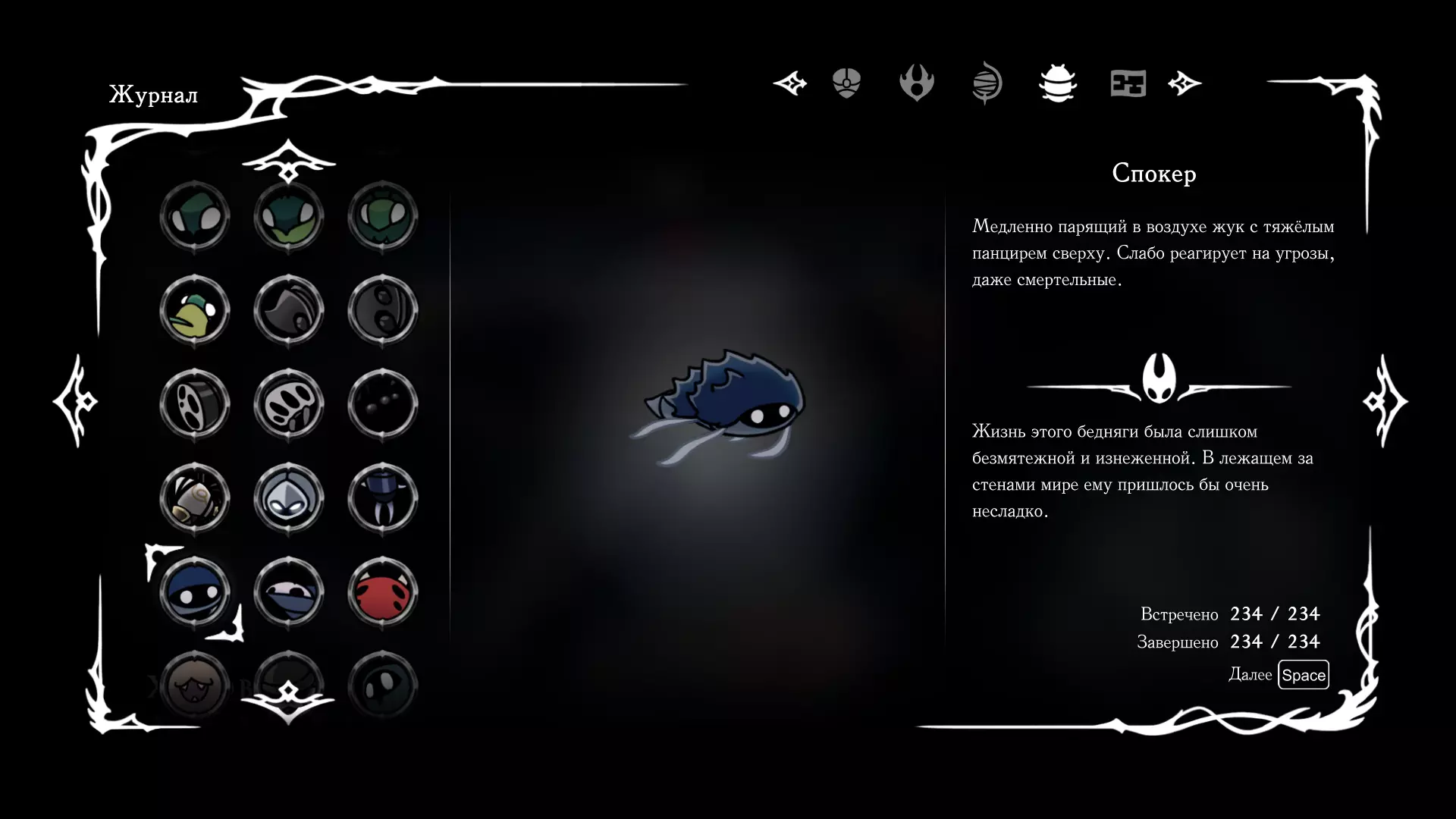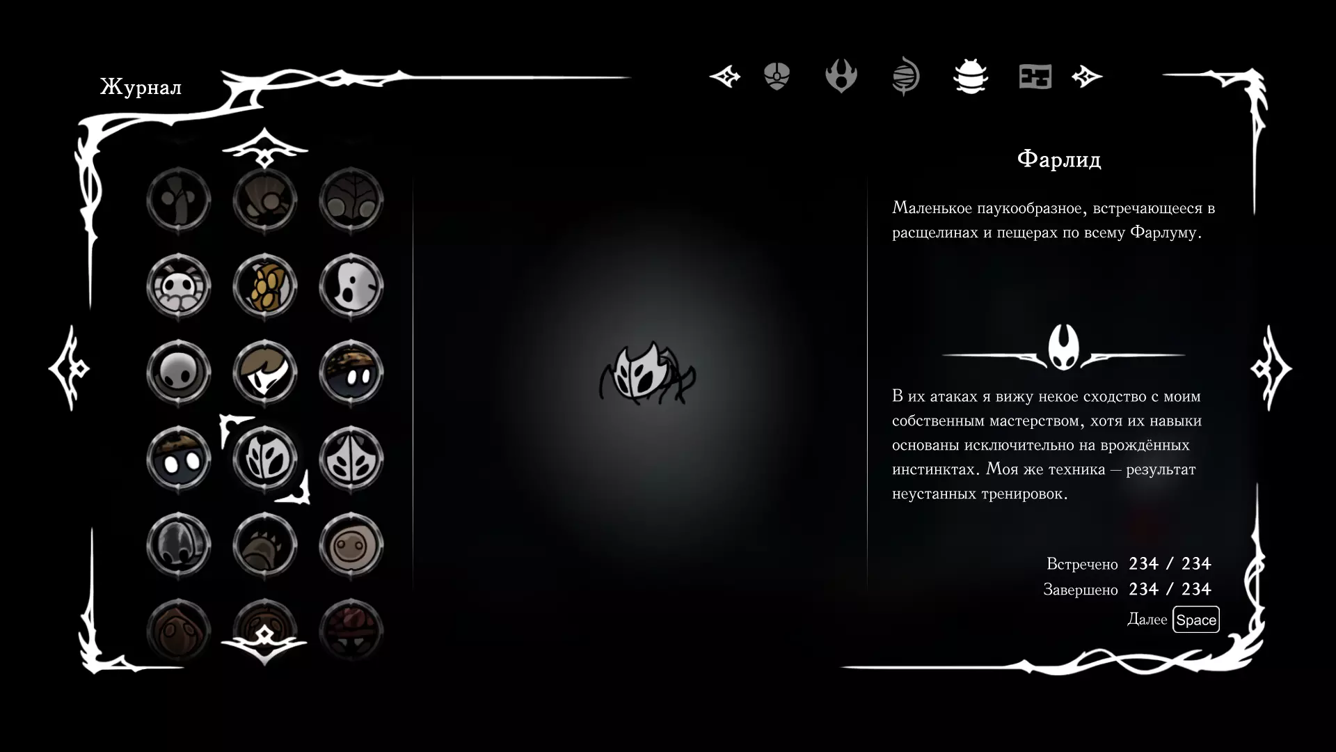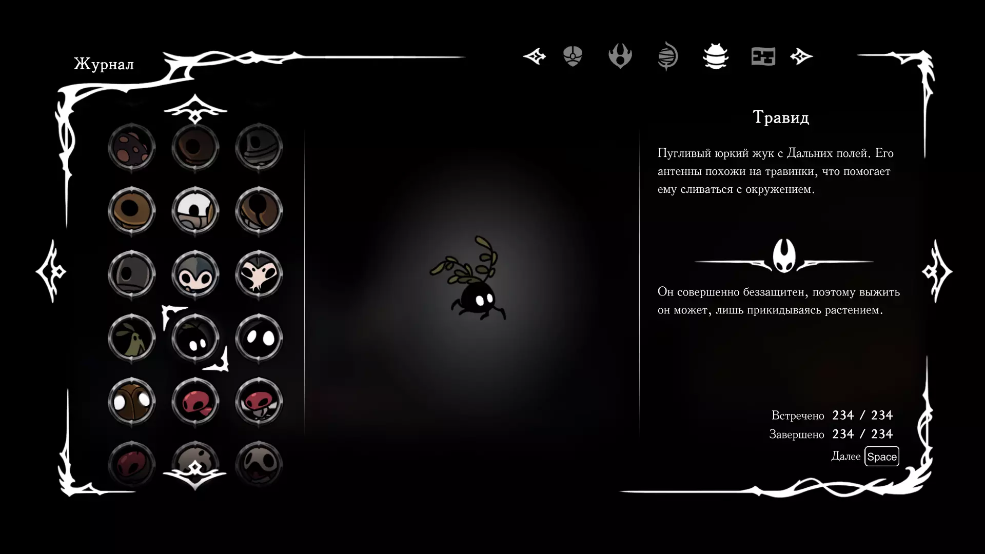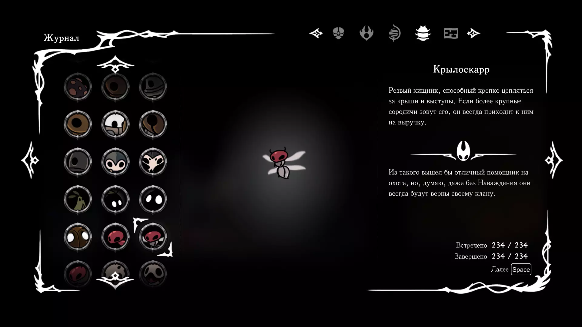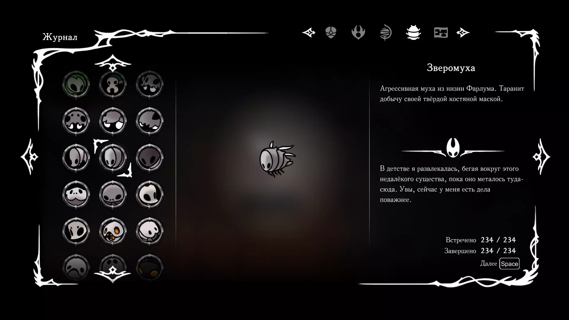 《空洞骑士:丝绸之歌》猎人日志填写指南,包含每个敌人/生物的位置及获取努乌纪念品的方法。信息将持续补充更新。 注意:大多数敌人在进入第三幕后会停止在原有位置刷新。例如,第三幕中水塘生物的生成数量从两三个变为单个。每次为了一个怪物都要跑到长凳那里,这种体验可不太好,所以建议在进入第三幕之前就立即填写日志。可以按下Ctrl+F键,输入你需要的怪物名称来查找。【沙克菈和加蒙德并非日志必需怪物】! 【回忆中的怪物,只要你击败了回忆中的首领(例如韦尔丹尼亚),就会自动记录到日志中】!如果找不到某个怪物,可以在评论区留言。我为这份指南花费了大量时间。【苔藓洞穴】