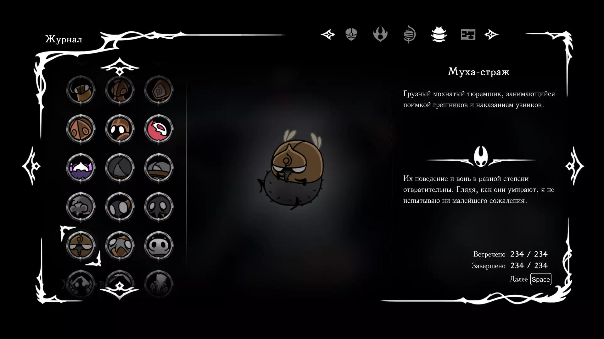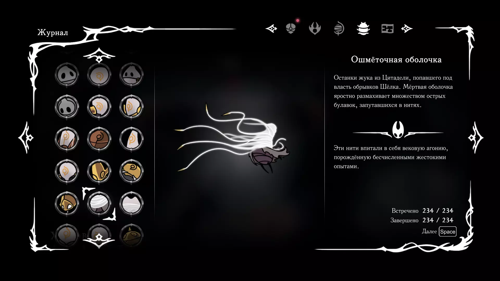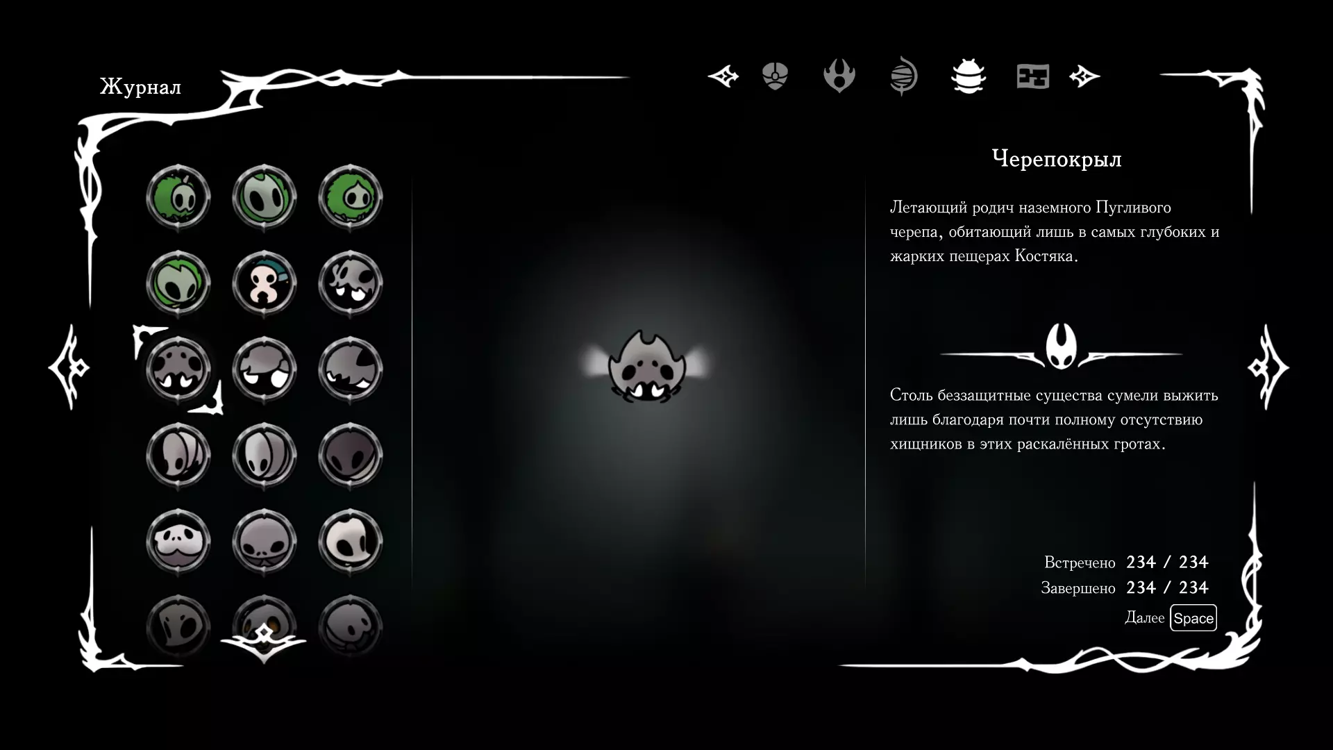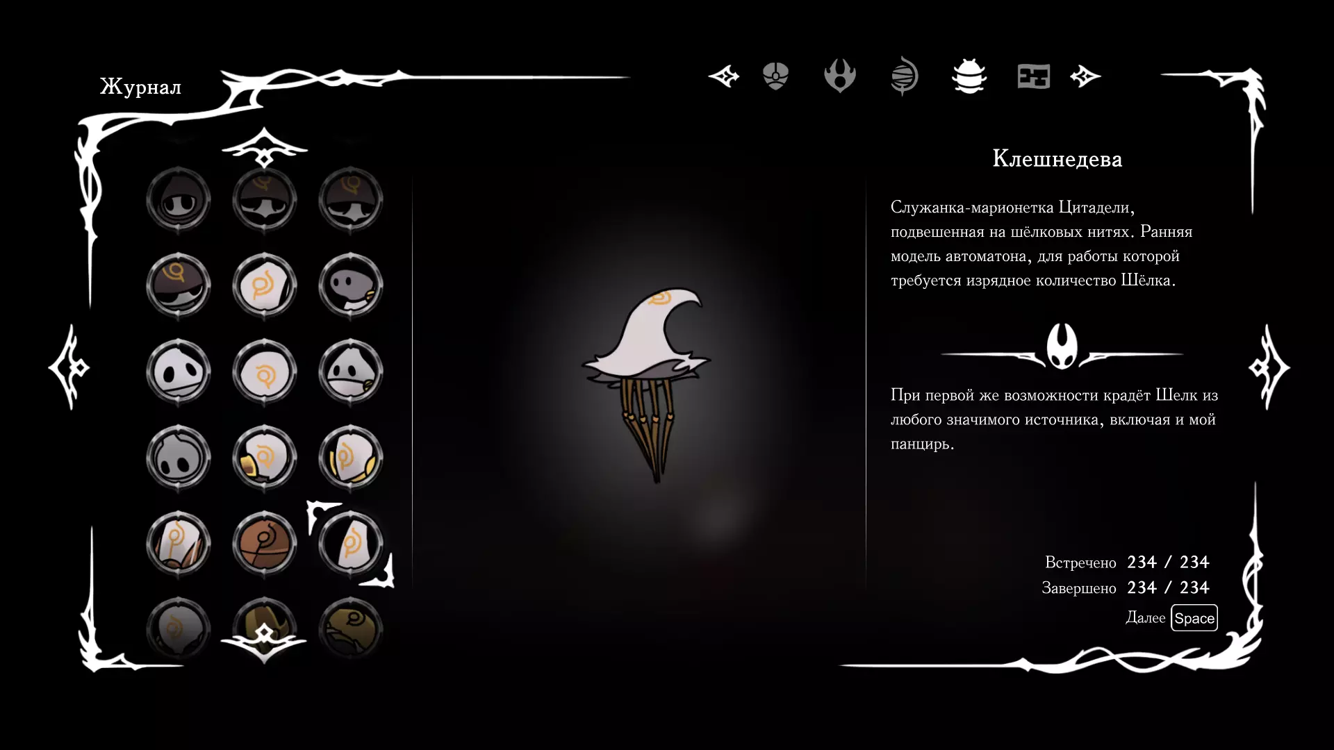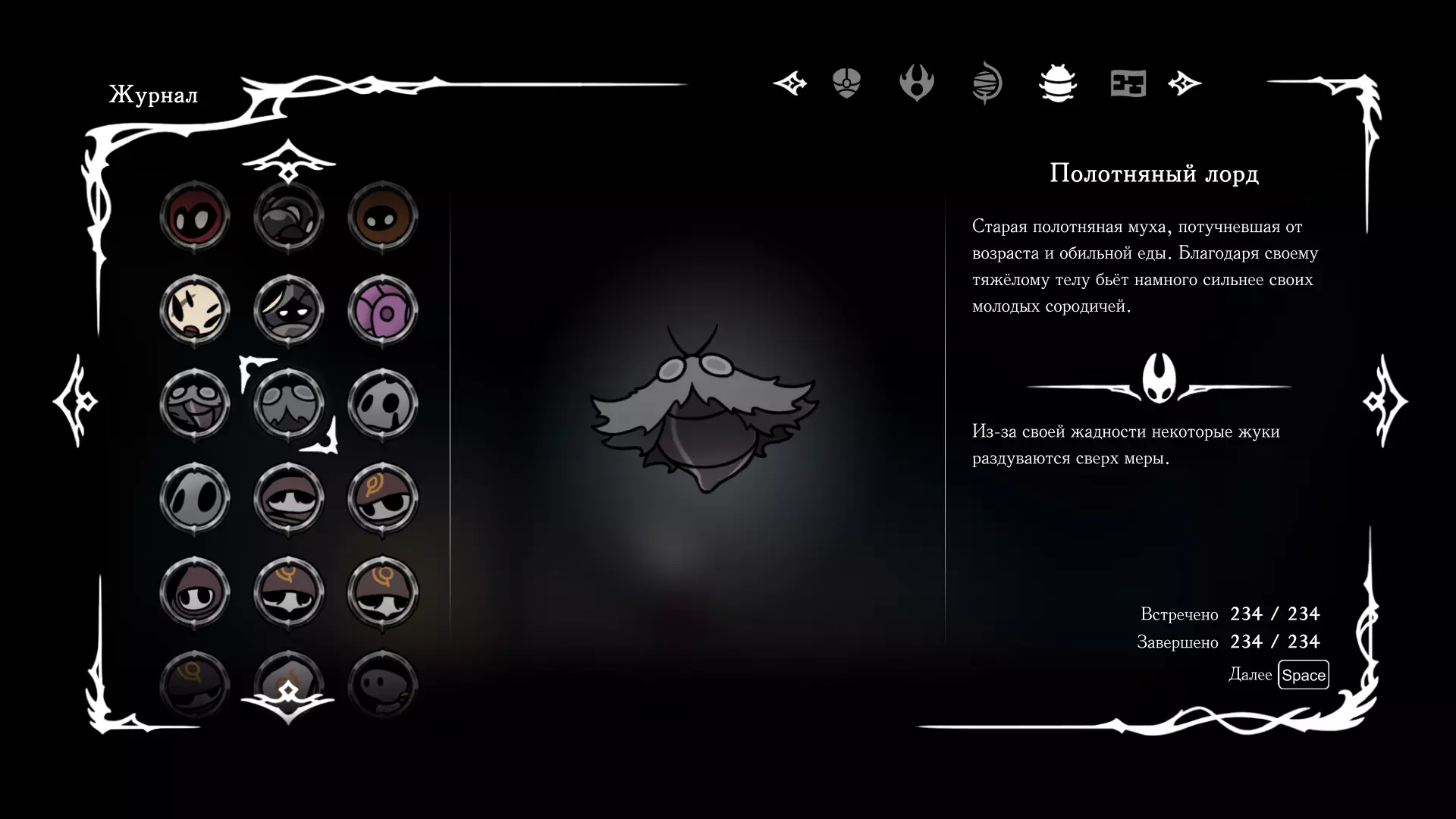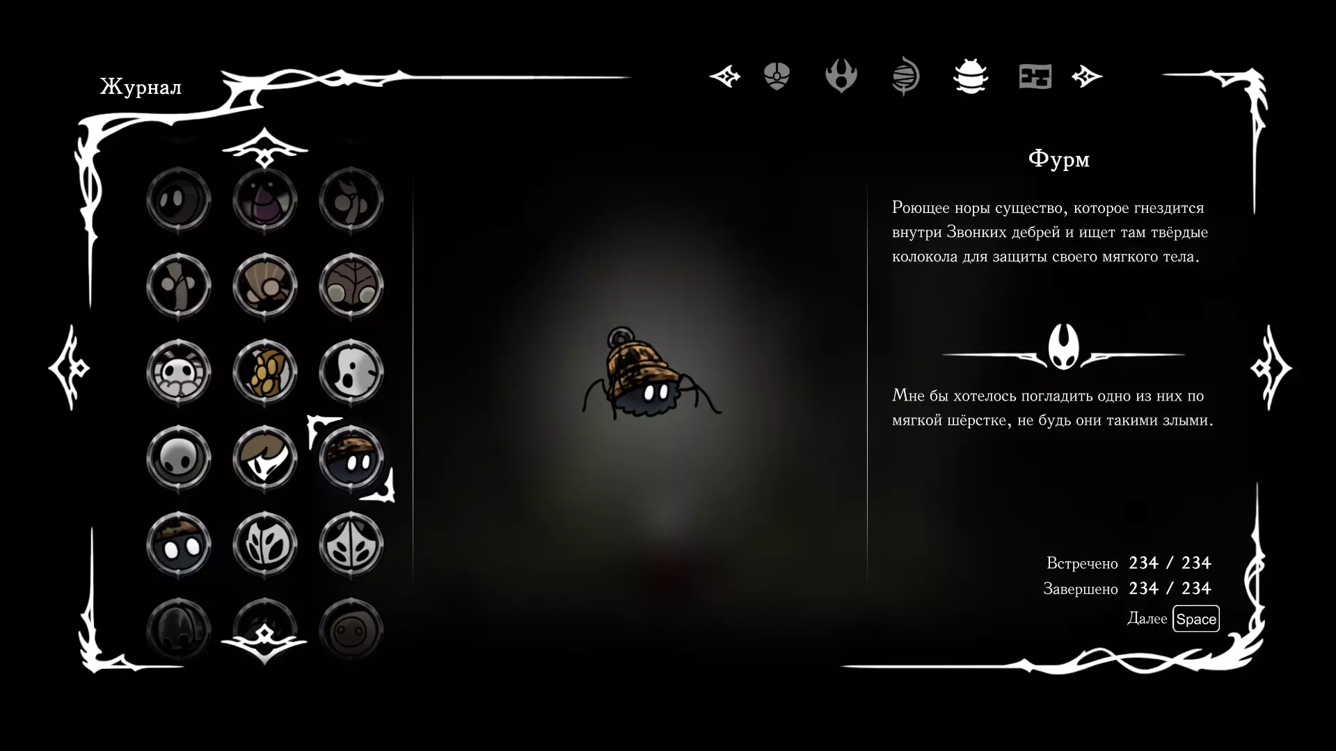 《空洞骑士:丝绸之歌》猎人日志填写指南,包含每个敌人/生物的位置及获取努乌纪念品的方法。信息将持续补充更新。 注意:大多数敌人在进入第三幕后会停止在原有位置刷新。例如,第三幕中水塘生物的生成数量从两三个变为单个。每次为了一个怪物都要跑到长凳那里,这种体验可不太好,所以建议在进入第三幕之前就立即填写日志。可以按下Ctrl+F键,输入你需要的怪物名称来查找。【沙克菈和加蒙德并非日志必需怪物】! 【回忆中的怪物,只要你击败了回忆中的首领(例如韦尔丹尼亚),就会自动记录到日志中】!如果找不到某个怪物,可以在评论区留言。我为这份指南花费了大量时间。【苔藓洞穴】