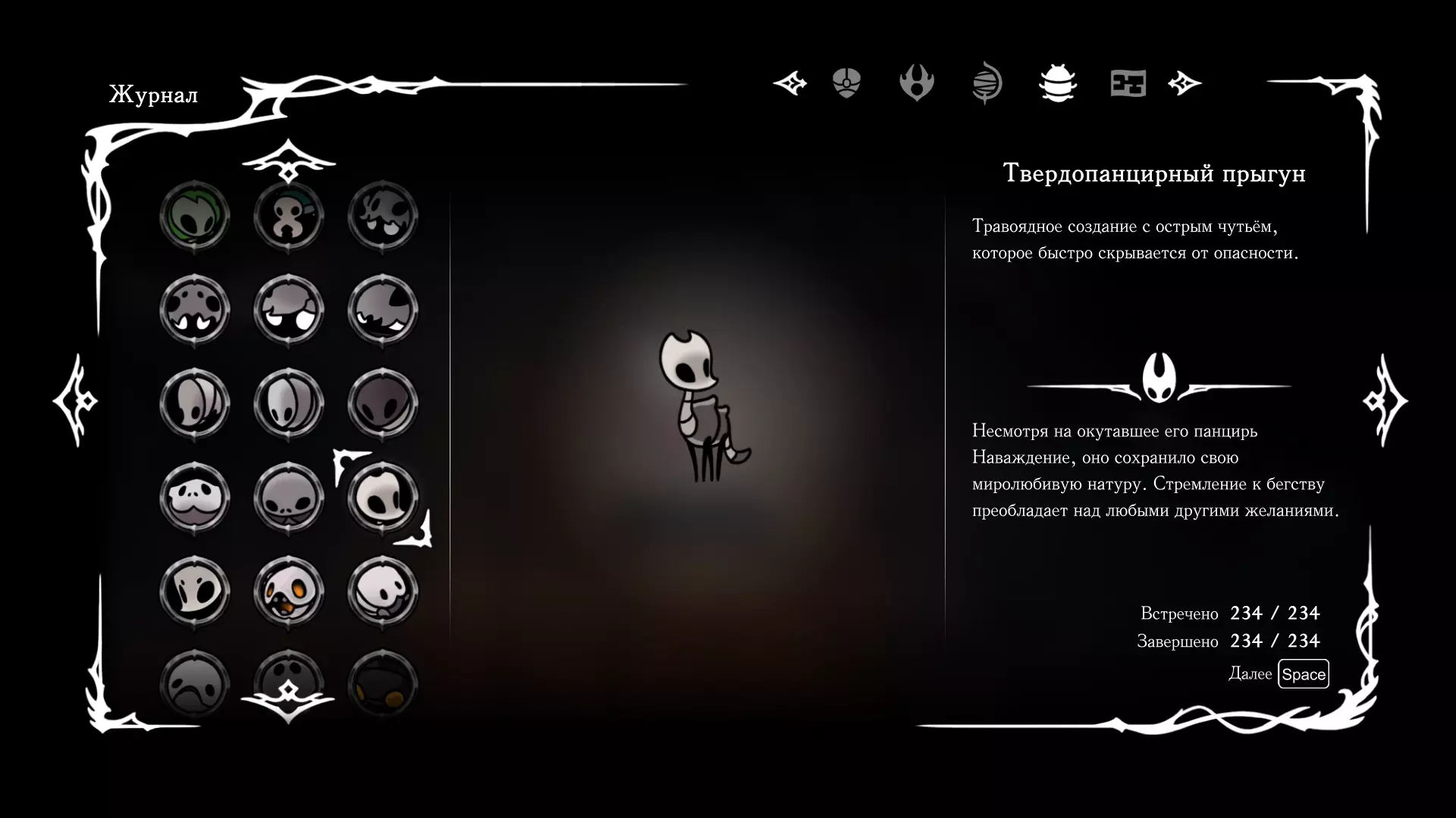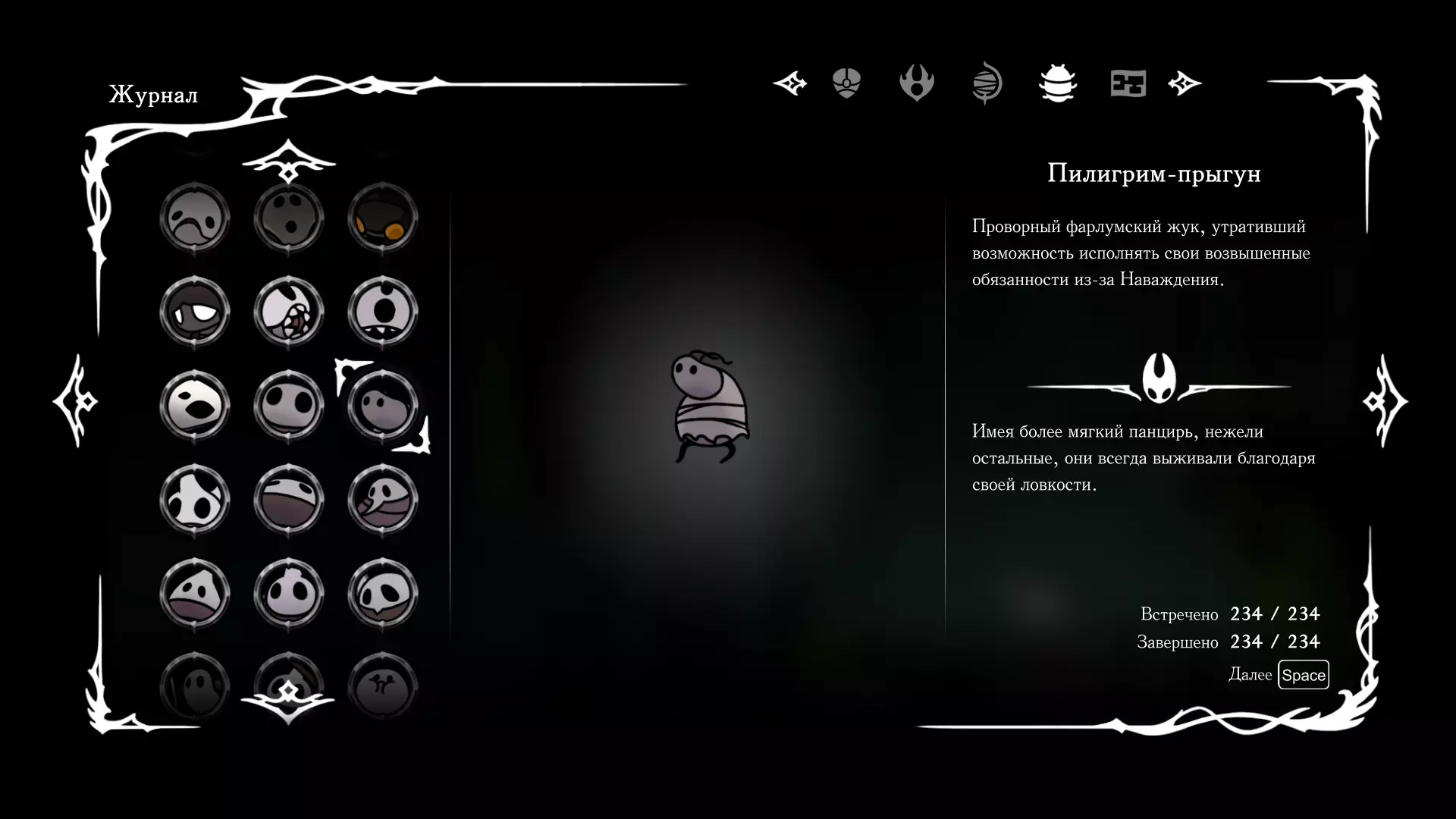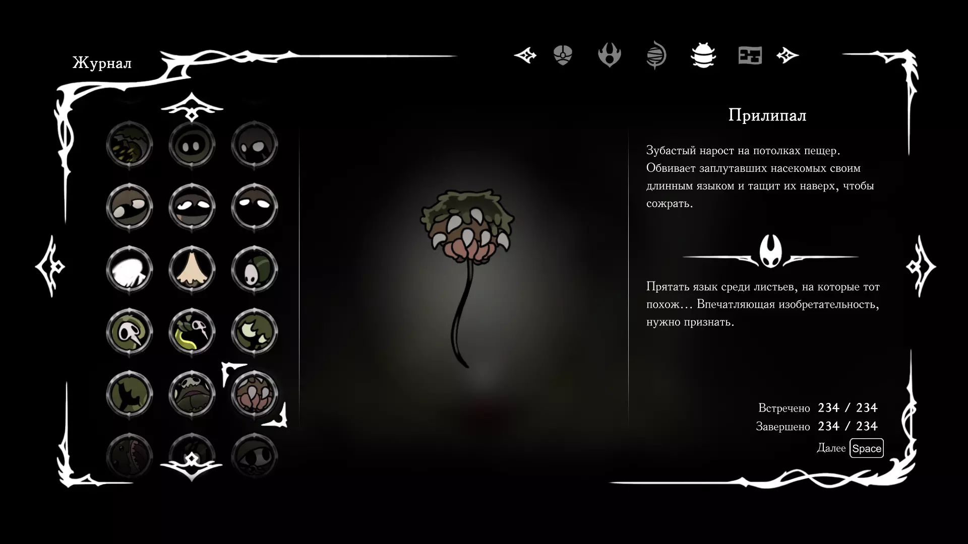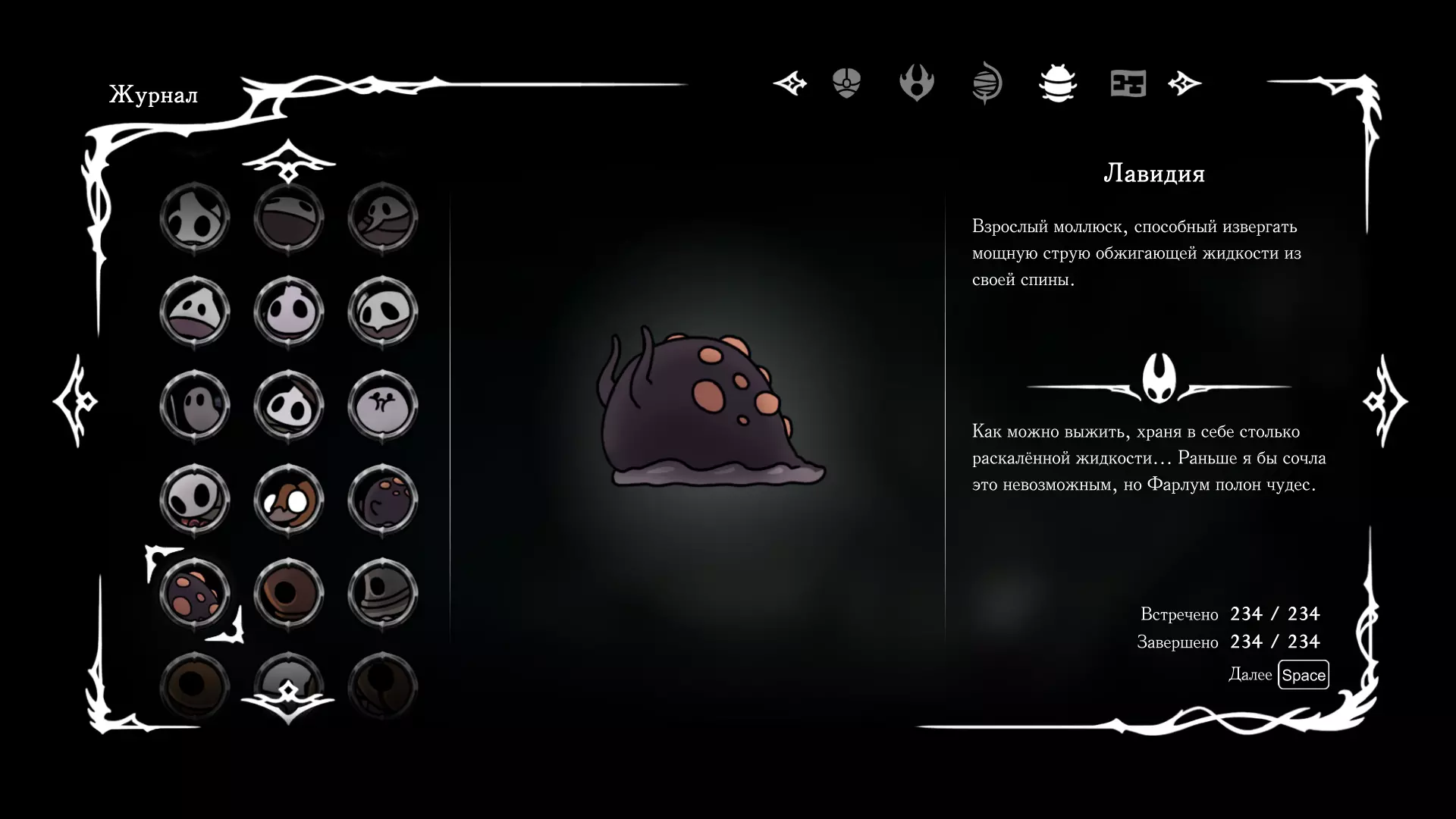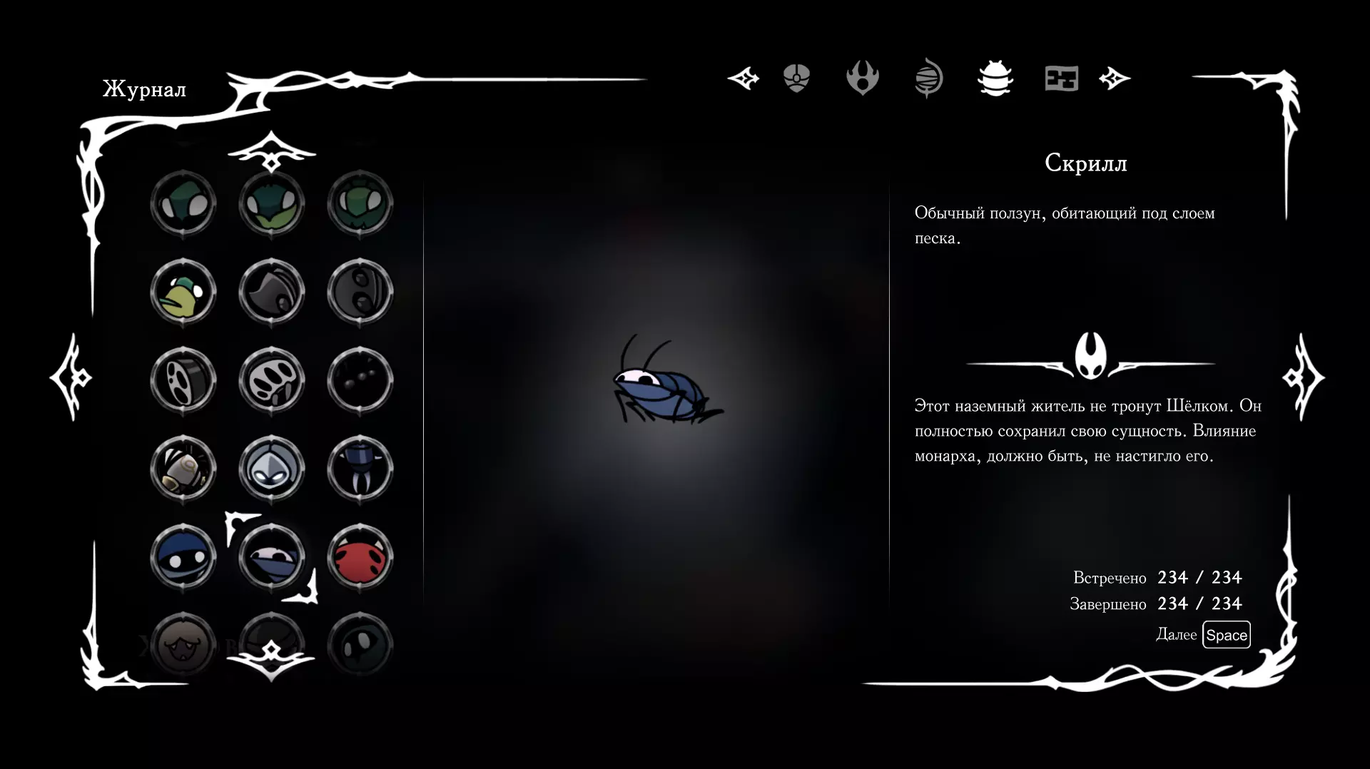 《空洞骑士:丝绸之歌》猎人日志填写指南,包含每个敌人/生物的位置及获取努乌纪念品的方法。信息将持续补充更新。 注意:大多数敌人在进入第三幕后会停止在原有位置刷新。例如,第三幕中水塘生物的生成数量从两三个变为单个。每次为了一个怪物都要跑到长凳那里,这种体验可不太好,所以建议在进入第三幕之前就立即填写日志。可以按下Ctrl+F键,输入你需要的怪物名称来查找。【沙克菈和加蒙德并非日志必需怪物】! 【回忆中的怪物,只要你击败了回忆中的首领(例如韦尔丹尼亚),就会自动记录到日志中】!如果找不到某个怪物,可以在评论区留言。我为这份指南花费了大量时间。【苔藓洞穴】