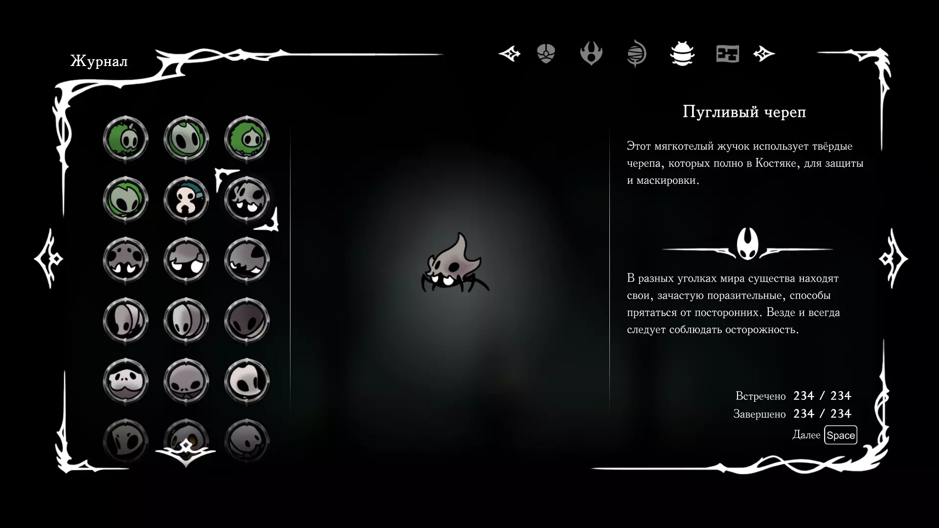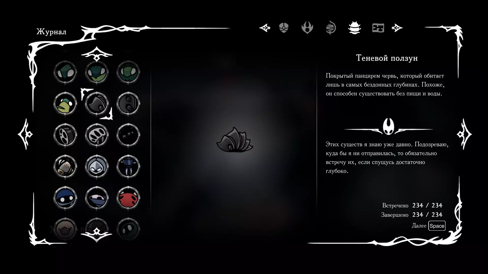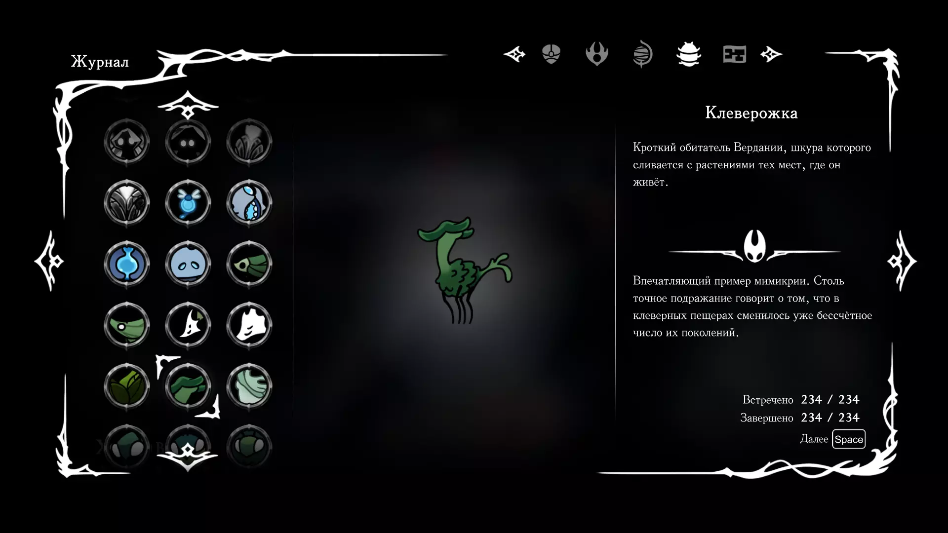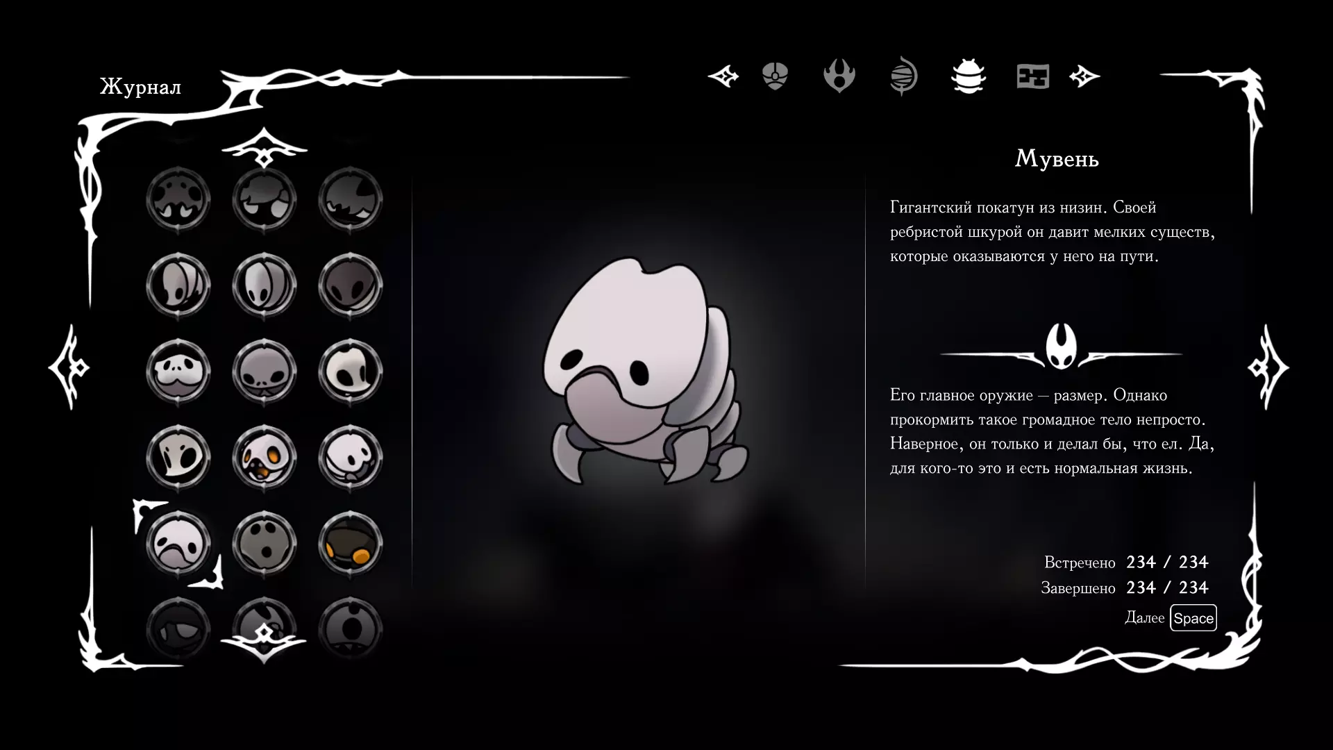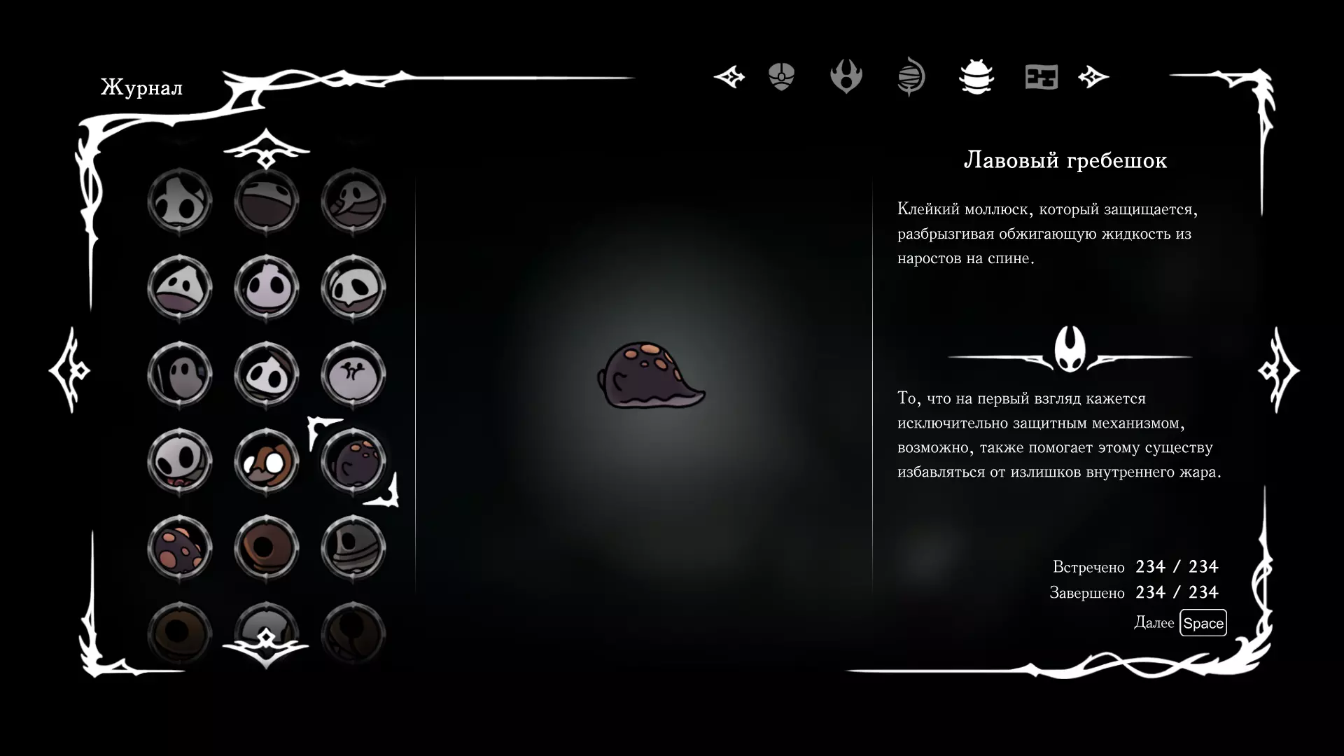 《空洞骑士:丝绸之歌》猎人日志填写指南,包含每个敌人/生物的位置及获取努乌纪念品的方法。信息将持续补充更新。 注意:大多数敌人在进入第三幕后会停止在原有位置刷新。例如,第三幕中水塘生物的生成数量从两三个变为单个。每次为了一个怪物都要跑到长凳那里,这种体验可不太好,所以建议在进入第三幕之前就立即填写日志。可以按下Ctrl+F键,输入你需要的怪物名称来查找。【沙克菈和加蒙德并非日志必需怪物】! 【回忆中的怪物,只要你击败了回忆中的首领(例如韦尔丹尼亚),就会自动记录到日志中】!如果找不到某个怪物,可以在评论区留言。我为这份指南花费了大量时间。【苔藓洞穴】