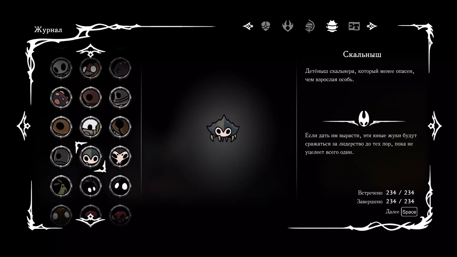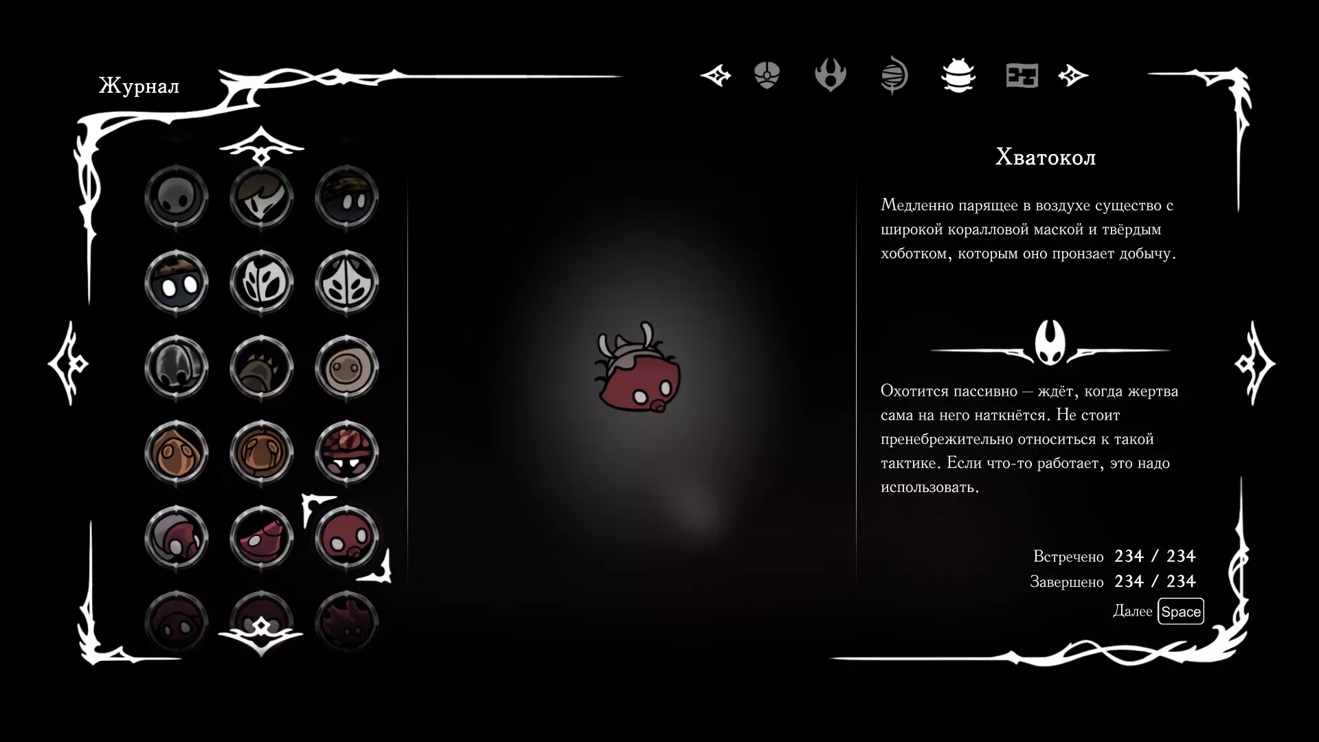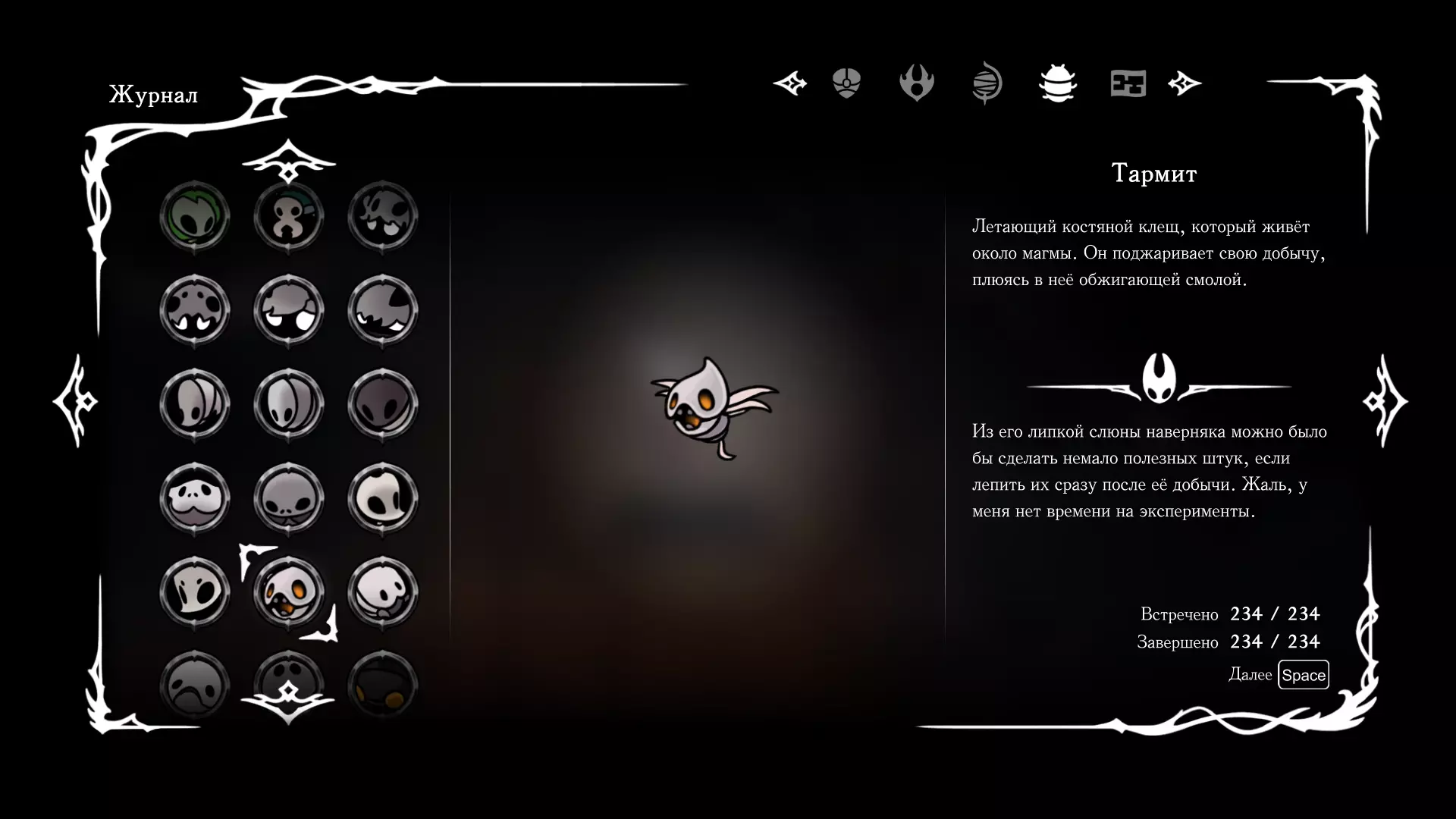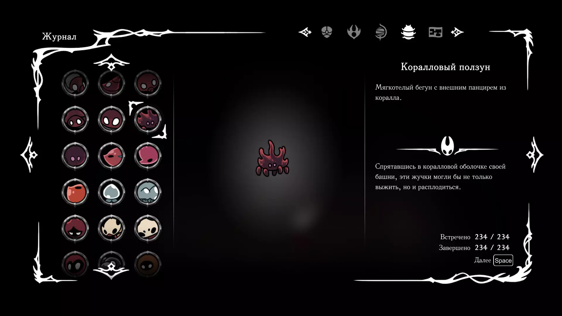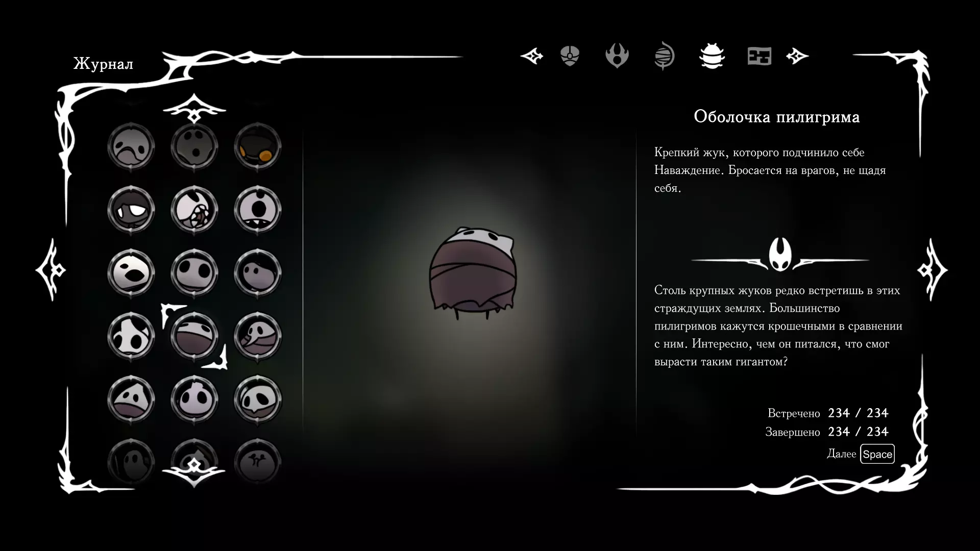 《空洞骑士:丝绸之歌》猎人日志填写指南,包含每个敌人/生物的位置及获取努乌纪念品的方法。信息将持续补充更新。 注意:大多数敌人在进入第三幕后会停止在原有位置刷新。例如,第三幕中水塘生物的生成数量从两三个变为单个。每次为了一个怪物都要跑到长凳那里,这种体验可不太好,所以建议在进入第三幕之前就立即填写日志。可以按下Ctrl+F键,输入你需要的怪物名称来查找。【沙克菈和加蒙德并非日志必需怪物】! 【回忆中的怪物,只要你击败了回忆中的首领(例如韦尔丹尼亚),就会自动记录到日志中】!如果找不到某个怪物,可以在评论区留言。我为这份指南花费了大量时间。【苔藓洞穴】