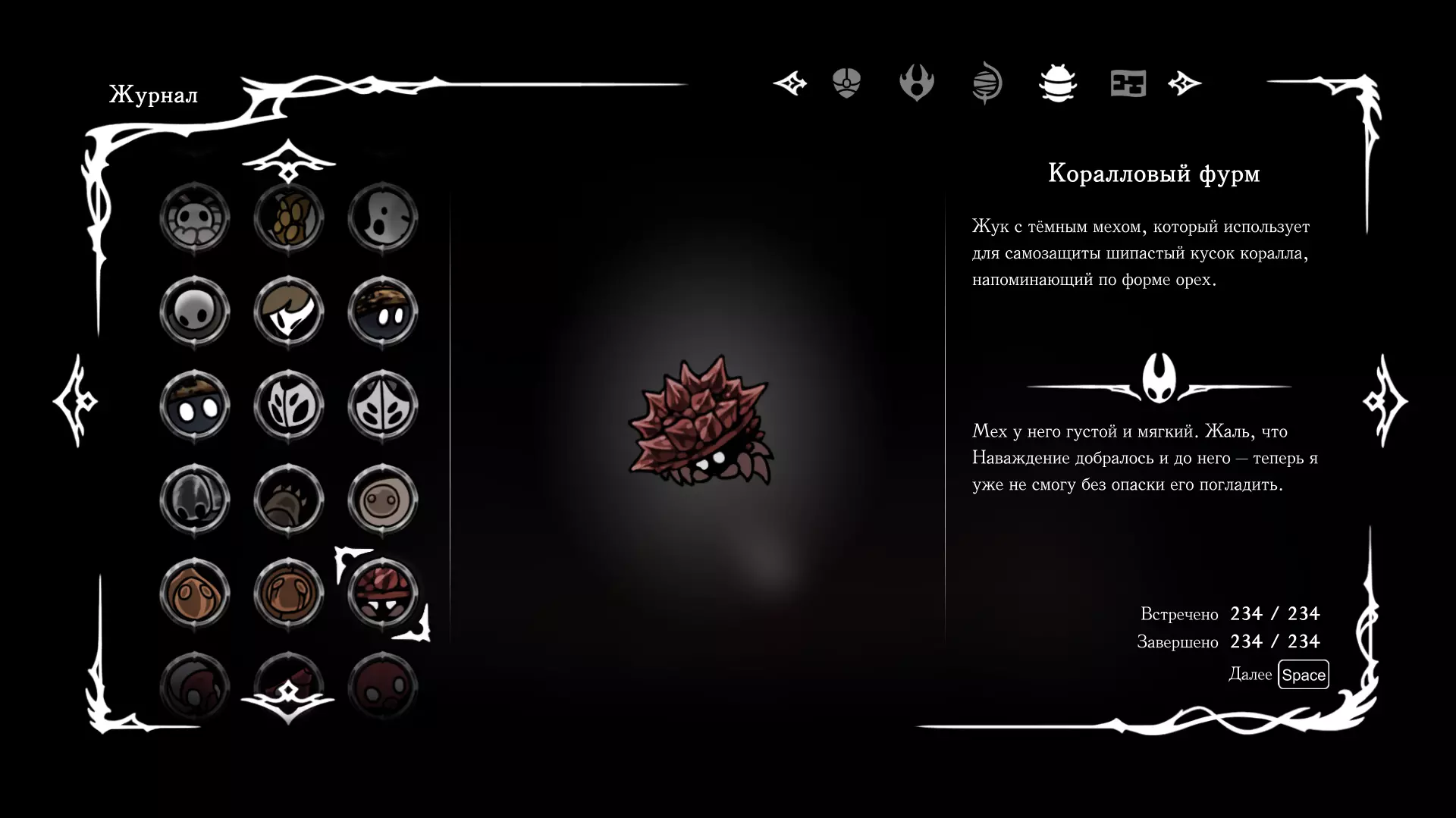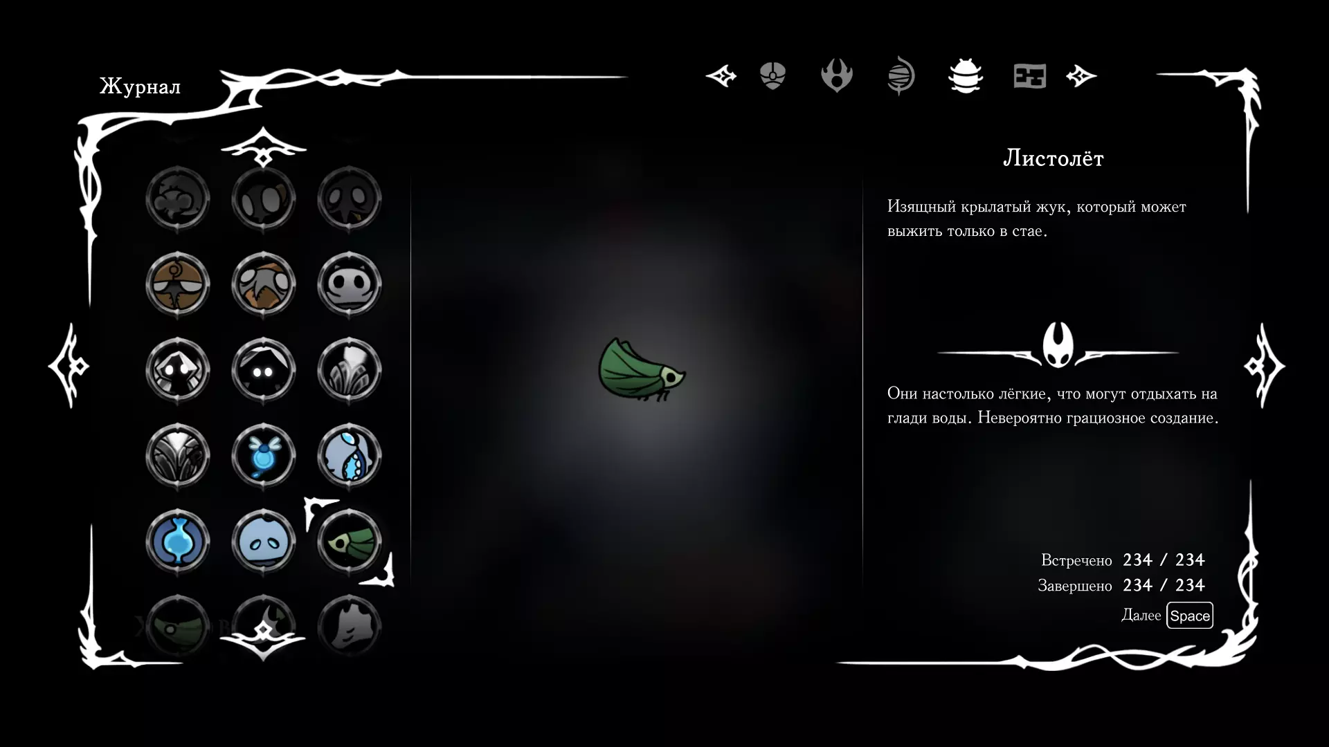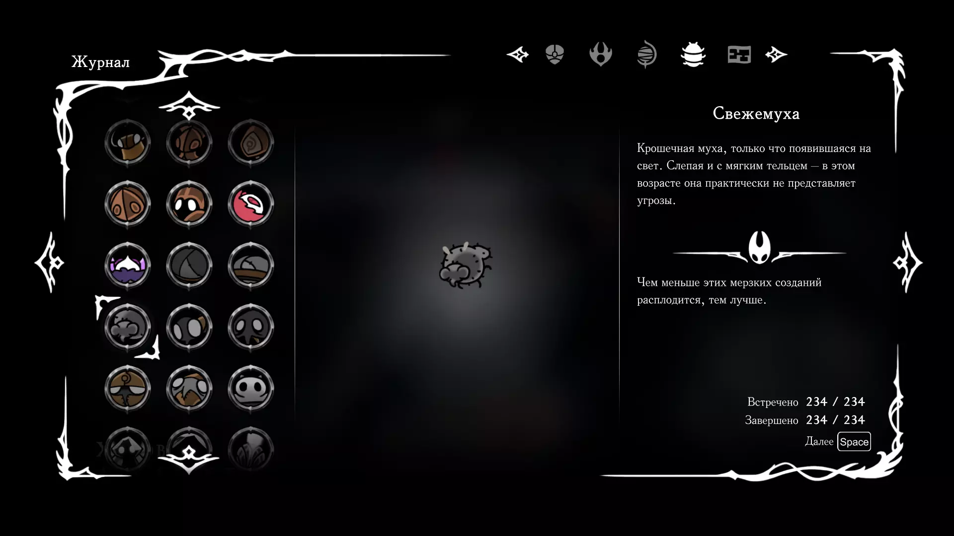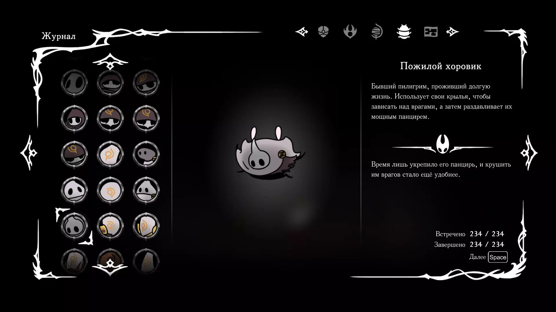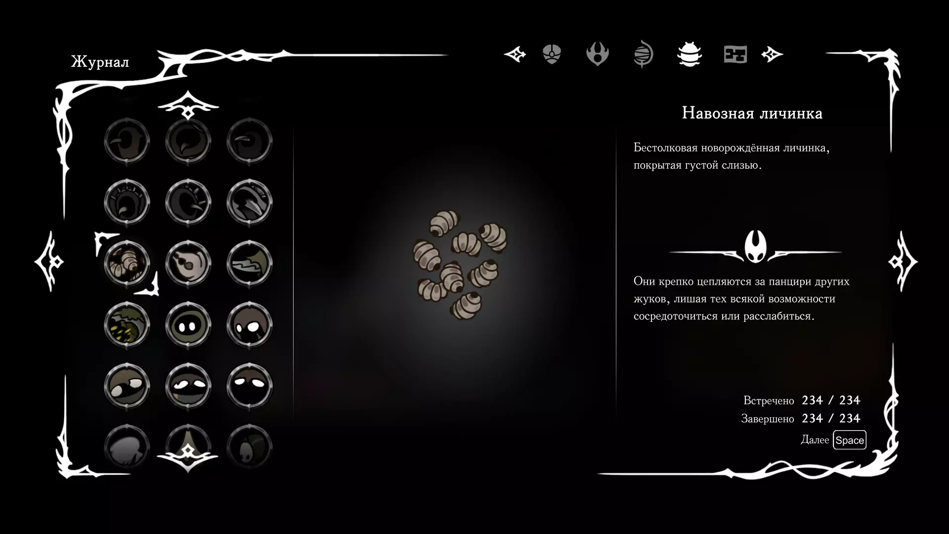 《空洞骑士:丝绸之歌》猎人日志填写指南,包含每个敌人/生物的位置及获取努乌纪念品的方法。信息将持续补充更新。 注意:大多数敌人在进入第三幕后会停止在原有位置刷新。例如,第三幕中水塘生物的生成数量从两三个变为单个。每次为了一个怪物都要跑到长凳那里,这种体验可不太好,所以建议在进入第三幕之前就立即填写日志。可以按下Ctrl+F键,输入你需要的怪物名称来查找。【沙克菈和加蒙德并非日志必需怪物】! 【回忆中的怪物,只要你击败了回忆中的首领(例如韦尔丹尼亚),就会自动记录到日志中】!如果找不到某个怪物,可以在评论区留言。我为这份指南花费了大量时间。【苔藓洞穴】
