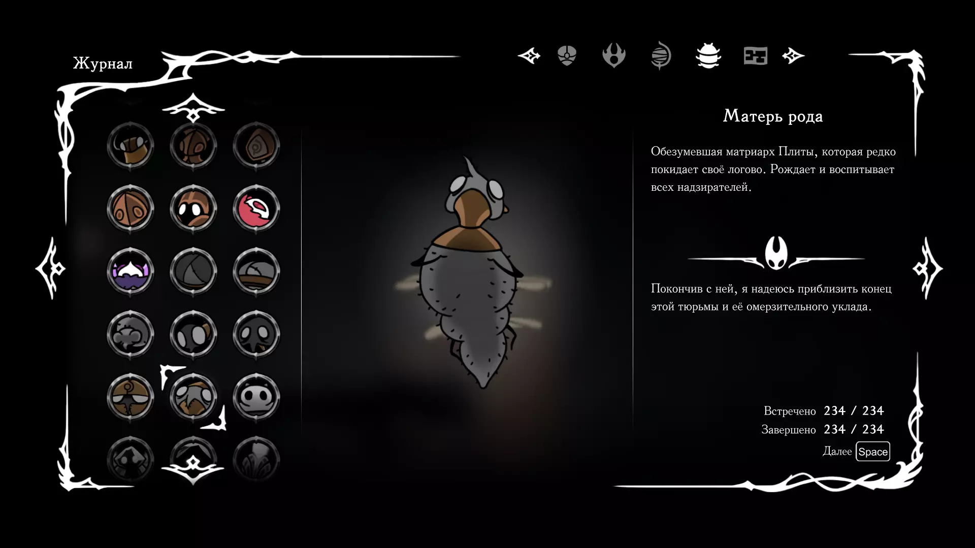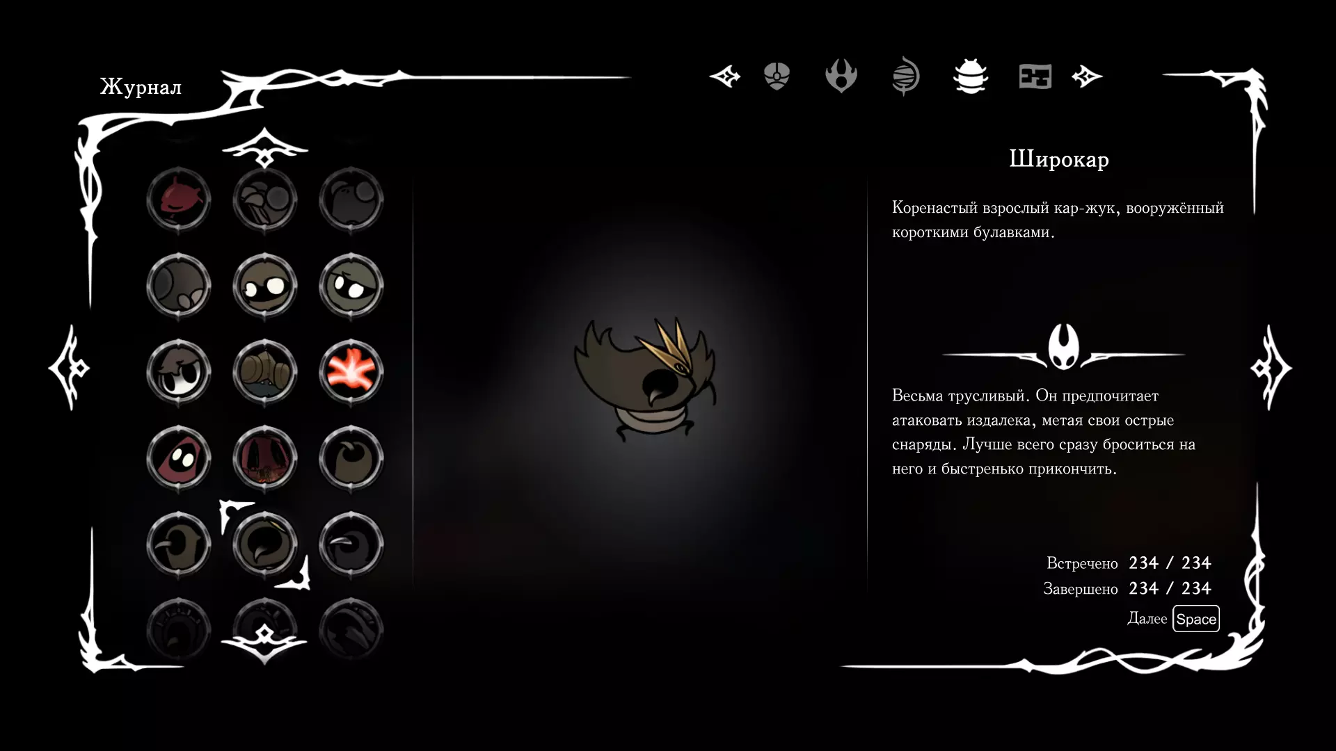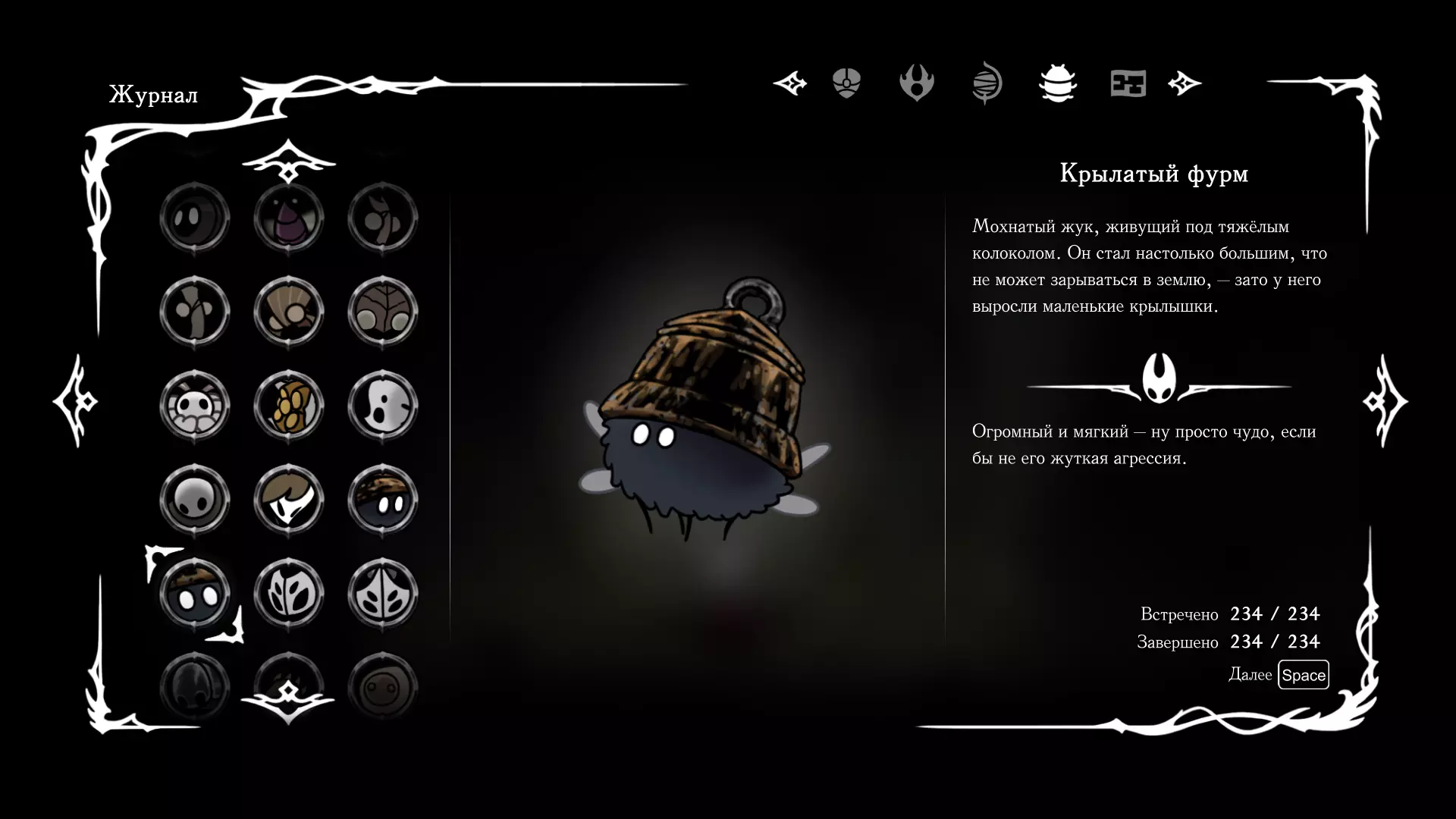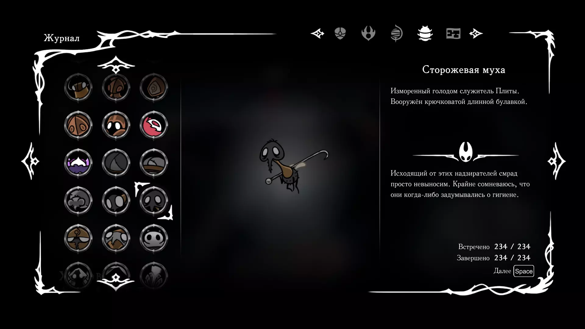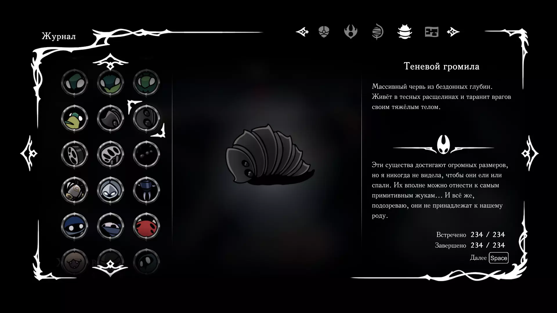 《空洞骑士:丝绸之歌》猎人日志填写指南,包含每个敌人/生物的位置及获取努乌纪念品的方法。信息将持续补充更新。 注意:大多数敌人在进入第三幕后会停止在原有位置刷新。例如,第三幕中水塘生物的生成数量从两三个变为单个。每次为了一个怪物都要跑到长凳那里,这种体验可不太好,所以建议在进入第三幕之前就立即填写日志。可以按下Ctrl+F键,输入你需要的怪物名称来查找。【沙克菈和加蒙德并非日志必需怪物】! 【回忆中的怪物,只要你击败了回忆中的首领(例如韦尔丹尼亚),就会自动记录到日志中】!如果找不到某个怪物,可以在评论区留言。我为这份指南花费了大量时间。【苔藓洞穴】