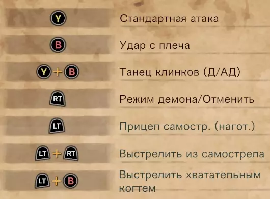 1. 基础移动攻击连招:由向前滑步和随后的两次原地旋转攻击组成。 2. Y+B 剑刃之舞:用于在原地造成巨额伤害。有一个明显的缺点——剑刃之舞无法中断,这会使你在使用期间变得相当脆弱。 3. 软化连招:冲刺+Y+B+B+LT 快速软化斩:用于快速软化怪物。与怪物的失衡机制配合效果极佳,能够在怪物失衡后抓住它,从而延长失衡状态并软化其部分身体。 Y+Y+向方向键+Y+Y+B+B+LT原地软化连招 用于原地对怪物进行软化连招。适合在不改变位置的情况下进行软化。 此外,也可以在登上台阶时使用软化连招。现在总结一下:我们已经了解了恶魔模式的基本操作元素及其招式表,但需要注意的是,在战斗中通常需要根据具体情况和可能的输出时间窗口,使用混乱的攻击组合,因此剩下的就全靠练习了。 大恶魔模式